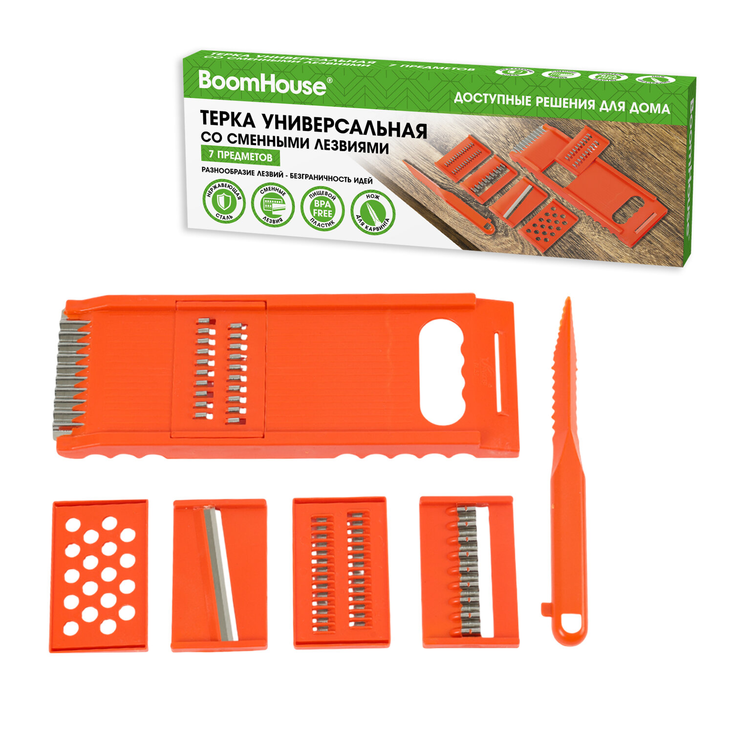 Терка универсальная со сменными лезвиями (7 предметов), нержавеющая сталь, оранжевая, BOOMHOUSE (БУМХАУС) Код товара: 702101 190,53 ₽ Купить Производитель:BoomHouse Терка со сменными лезвиями BOOMHOUSE из нержавеющей стали – незаменимая помощница на кухне. Благодаря острым лезвиям, прочной конструкции и удобной ручке она легко справится с любыми продуктами и сделает приготовление блюд максимально простым и удобным. Терки и овощерезки находятся в прямом контакте с пищевыми продуктами, поэтому важную роль играет материал, из которого сделан инструмент. Терка для моркови по-корейски BOOMHOUSE изготовлена из качественных материалов, которые соответствуют всем требованиям безопасности – это качественный пищевой пластик и ферритная нержавеющая сталь SUS430, отличающаяся высокой коррозионной стойкостью, прочностью и устойчивостью к окислению. Товар представляет собой корпус из ABS-пластика с комплектом из пяти насадок из пластика с различными лезвиями из коррозионностойкой нержавеющей стали и ножом из пластика для карвинга. Насадки из комплекта имеют следующие лезвия: • Стандартная тёрка с крупными отверстиями – самый распространённый вариант. Подходит для измельчения большинства продуктов: от фруктов и овощей до сухарей и мяса. На этой поверхности также можно натирать сливочное масло, что может пригодиться при создании кондитерских изделий. • Мелкая терка отличается от первого типа уменьшенным размером отверстий, что позволяет измельчать продукты в 2–3 раза мельче. Является универсальным решением для работы абсолютно с любыми продуктами. Часто используется при создании салатов, закусок или кондитерских изделий, идеальна для приготовления драников и оладий. • "Колючая" тёрка оснащена выступающими отверстиями, предназначена для измельчения твёрдых продуктов: орехов, сухарей, цедры и твёрдого сыра, может быть использована для получения однородной массы из различных ингредиентов. • Слайсер – поверхность с продолговатыми отверстиями для нарезки продуктов ровными ломтиками или кольцами. Обеспечивает равномерность нарезки. • Слайсер для фигурной нарезки – поверхность с продолговатыми отверстиями для нарезки продуктов ровными фигурными ломтиками или кольцами. Обеспечивает равномерность нарезки. Все лезвия превосходно заточены, что обеспечивает качественное и быстрое измельчение продуктов. Терку удобно держать, использовать и хранить благодаря оптимальному размеру – 25х9х2 см. А легкий вес изделия (110 г) позволит вам не уставать при долгом использовании. Рекомендации по использованию: 1) Сразу после каждого использования терку следует очистить, тщательно вымыть и высушить. 2) При засорении отверстий не рекомендуется использовать абразивные средства или металлические скребки – можно воспользоваться щеткой, которой удобно очистить все поверхности. 3) Храните терку в сухом месте, вдали от агрессивных химикатов, которые могут вызвать коррозию, и металлических приборов, подверженных коррозии.Производство: КитайТип товара: теркаНазначение: универсальнаяКоличество типов лезвий: 5Тип лезвий: колючки, крупные, мелкие, слайсеры, фигурныеЭргономичная ручка: даМатериал граней: Нержавеющая стальМатериал ручки: пластикЦвет ручки: оранжевыйВысота: 25 смШирина: 9 смГлубина: 2 смУпаковка: коробкаВес: 140 грРазмер упаковки: 2.5 × 26 × 8.9 смОбъём: 0.0007 м3Пром