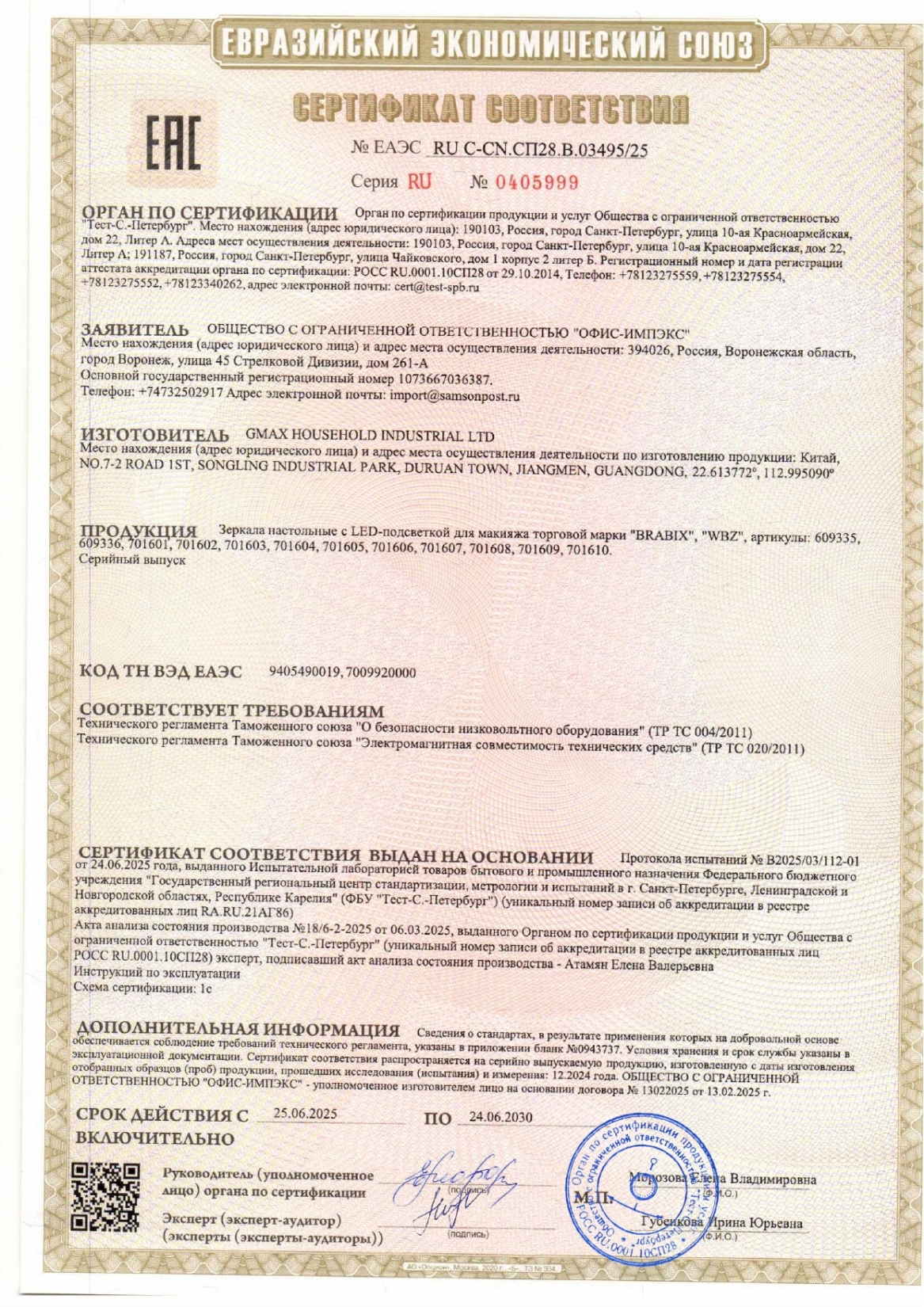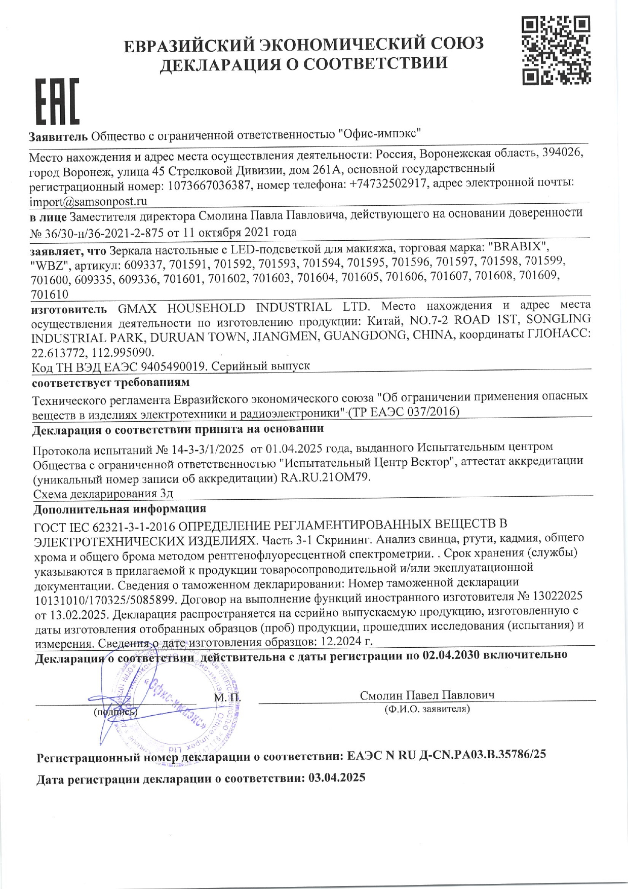 Зеркало для макияжа гримерное с подсветкой, 12 LED-ламп, 3 режима свечения, размер 29х38 см, работа от сети 220V, цвет белый, BRABIX Код товара: 609336 2 793,6 ₽ Купить Производитель:BRABIX Гримерное зеркало BRABIX с LED-подсветкой – это красивый и практичный аксессуар, которому будет рада любая женщина. Три режима подсветки позволят подобрать оптимальный свет для нанесения макияжа и проведения процедур по уходу за лицом. Зеркало с LED-подсветкой, которая работает при помощи сенсорного управления. 12 LED-ламп расположены с 3-х сторон на поверхности зеркального полотна. В нижней части зеркального полотна расположены 3 сенсорные кнопки, предназначенные для включения/выключения, выбора света, а также регулировки яркости освещения. Короткое нажатие кнопки "M" позволяет выбрать цвет света: теплый белый, нейтральный белый или холодный белый. Длительное нажатие кнопки "Р" регулирует яркость в выбранном режиме. Зеркало в пластиковой рамке с устойчивой подставкой. Подвижное соединение обеспечивает плавный поворот на 360° и настройку угла наклона. Работает от сети 220 V или любого устройства, оснащенного USB-портом. Для подключения используется USB-кабель с адаптером (входит в комплектацию). Размеры зеркала – 38х29 см. Габариты зеркала с подставкой: высота – 44 см, длина – 35 см, ширина – 7 см. Питание – от сети 220 V. Количество LED ламп – 12. Длина USB-кабеля – 150 см. Цвет – белый. Упаковка – коричневый гофрокороб с одноцветной печатью.Производство: КитайТип размещения: настольноеФорма: прямоугольнаяВысота: 38 смШирина: 29 смВращающееся: даОбъем аккумулятора: работа от сетиМатериал оправы: пластикЦвет оправы*: белыйЦвет оправы: белыйВес: 2,63 кгРазмер упаковки: 7.4 × 45.5 × 36 смОбъём: 0.0145 м3Промежуточная упаковка: 6 штТранспортная упаковка: 6 штШтрих-код: 4606224440408 Файлы Сертификат-1.jpg Сертификат-2.jpg Сертификат-3.jpg Сертификат-4.jpg Сертификат-5.jpg