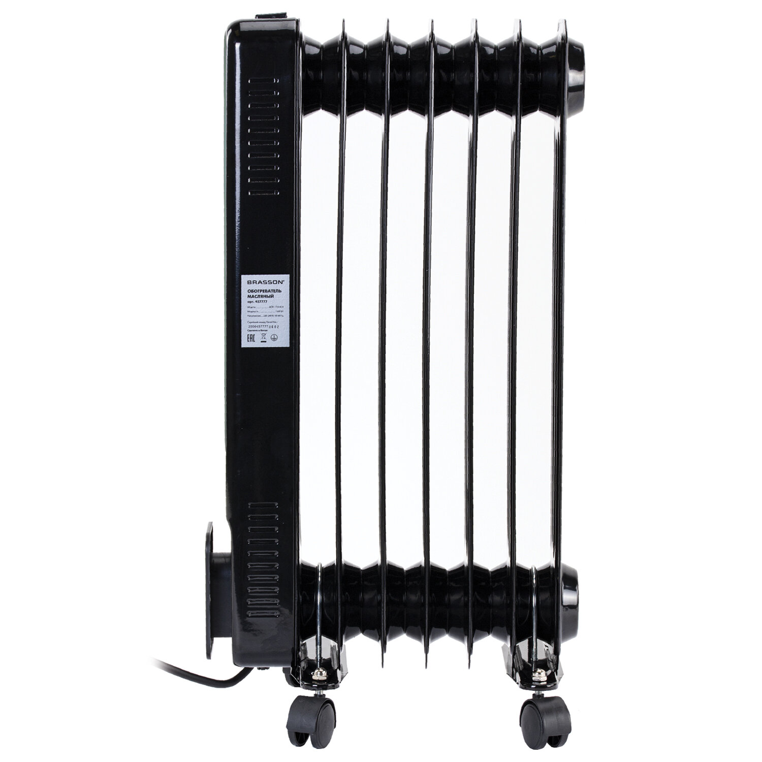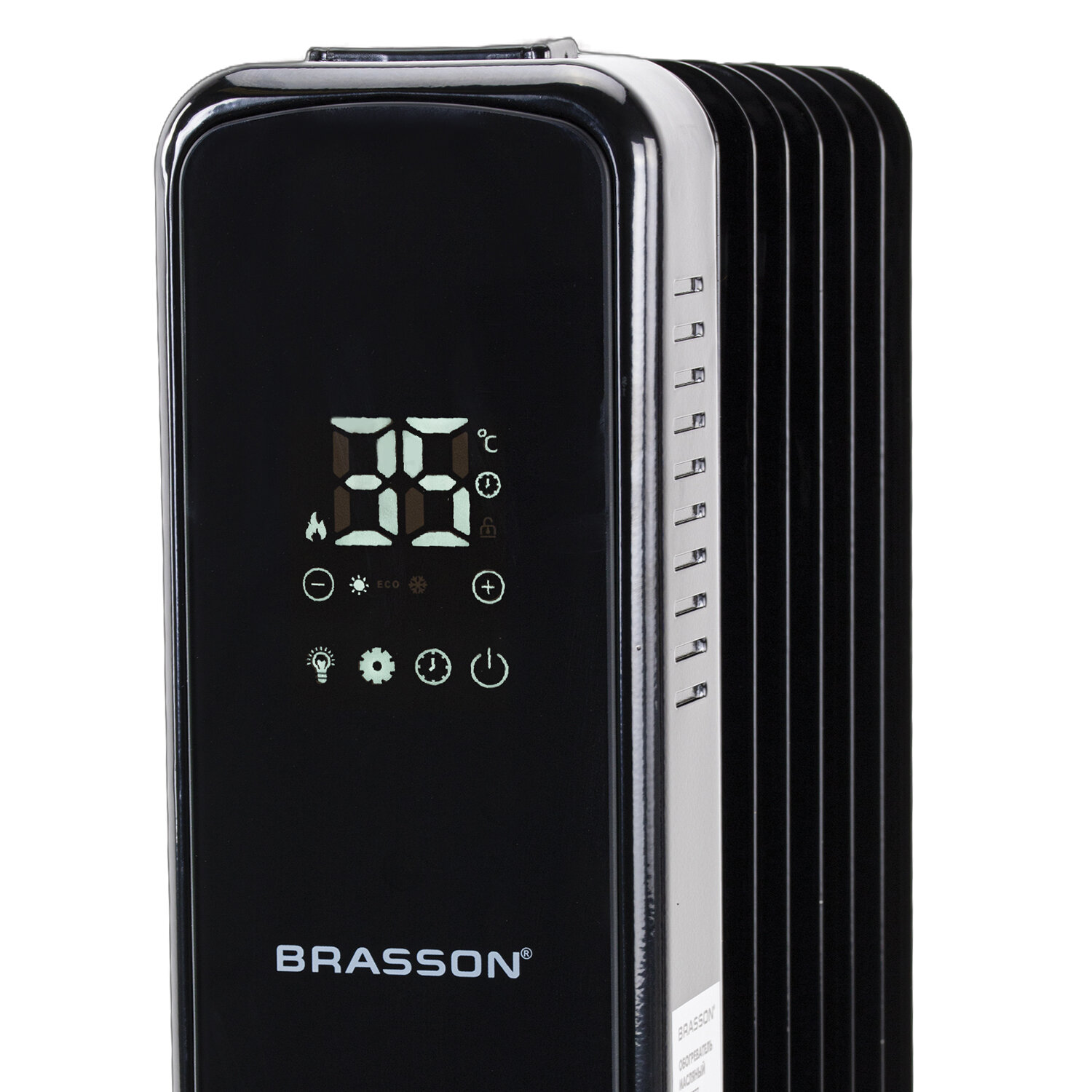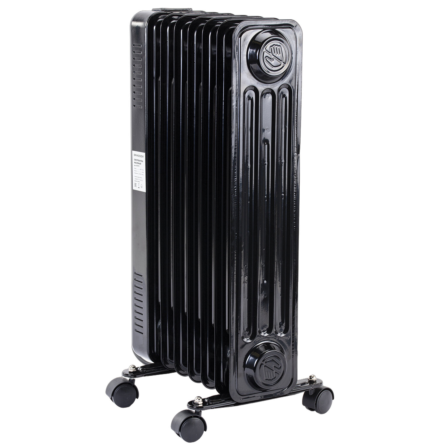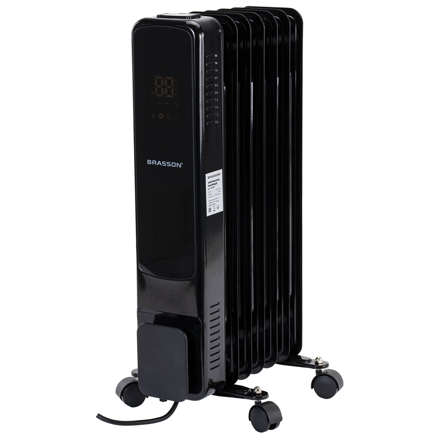 Обогреватель масляный BRASSON (БРАССОН) BOR-7 TOUCH, 7 секций, 1500 Вт, 3 режима, сенсор, пульт ДУ, черный Код товара: 457777 5 552,24 ₽ Купить Производитель:BRASSON Масляный обогреватель BRASSON BOR-7 TOUCH – комфорт и тепло в каждом уголке Вашего дома. Модель BOR-7 TOUCH – стильный и современный обогреватель мощностью 1500 Вт, способный обеспечить быстрый и эффективный обогрев помещения площадью до 15 м2. Сенсорная панель управления позволяет легко настроить работу обогревателя, а с помощью пульта дистанционного управления Вы сможете контролировать работу устройства из любой точки помещения. Обогреватель безопасен в эксплуатации, обладает функцией защиты от перегрева и опрокидывания. Модель BOR-7 TOUCH оборудована встроенным термостатом, а также функцией защиты от детей, за счет чего предотвращается случайное изменение настроек устройства. Для создания комфортных условий в помещении Вы можете выбрать один из трех режимов работы обогревателя: ECO – экологичный энергосберегающий режим, Comfort – комфортный режим, при котором обогреватель работает на максимальной мощности, обеспечивая быстрый нагрев помещения, Antifrost – режим защиты от замерзания. Обогреватель можно свободно перемещать по помещению, так как он оснащен ножками на колесах, также предусмотрено место для хранения шнура. Благодаря современному минималистичному дизайну обогреватель органично впишется как в офисный, так и в домашний интерьер.Производство: КитайМощность: 1500 ВтКоличество секций: 7 шт.Рекомендованная площадь обогрева: 15 м2Тип управления: сенсорноеТермостат (терморегулятор): даИндикация: даСерия: BORДисплей: даПульт ДУ: даОтключение при перегреве: даТаймер: даНожки-колесики в комплекте: даМесто для хранения шнура: даДлина шнура: 1.5 мВысота товара: 590 ммШирина товара: 240 ммГлубина товара: 335 ммЦвет: черныйВес (без упаковки): 7 кгВес: 7,14 кгРазмер упаковки: 63.1 × 37.2 × 13.7 смОбъём: 0.0322 м3Промежуточная упаковка: 1 штТранспортная упаковка: 1 штШтрих-код: 4606224486437 Файлы Приложение-1.pdf Сертификат-1.jpg Сертификат-2.jpg Сертификат-3.jpg Сертификат-4.jpg Сертификат-5.jpg Сертификат-6.jpg Сертификат-7.jpg Сертификат-8.jpg Сертификат-9.jpg Сертификат-10.jpg Сертификат-11.jpg Сертификат-12.jpg