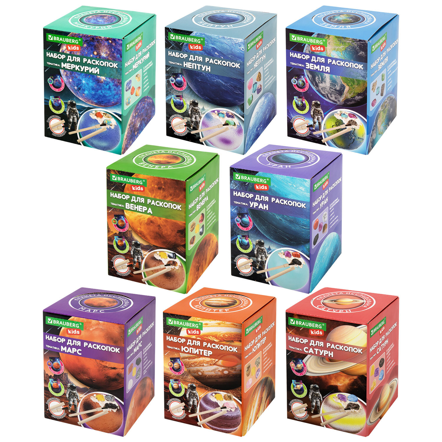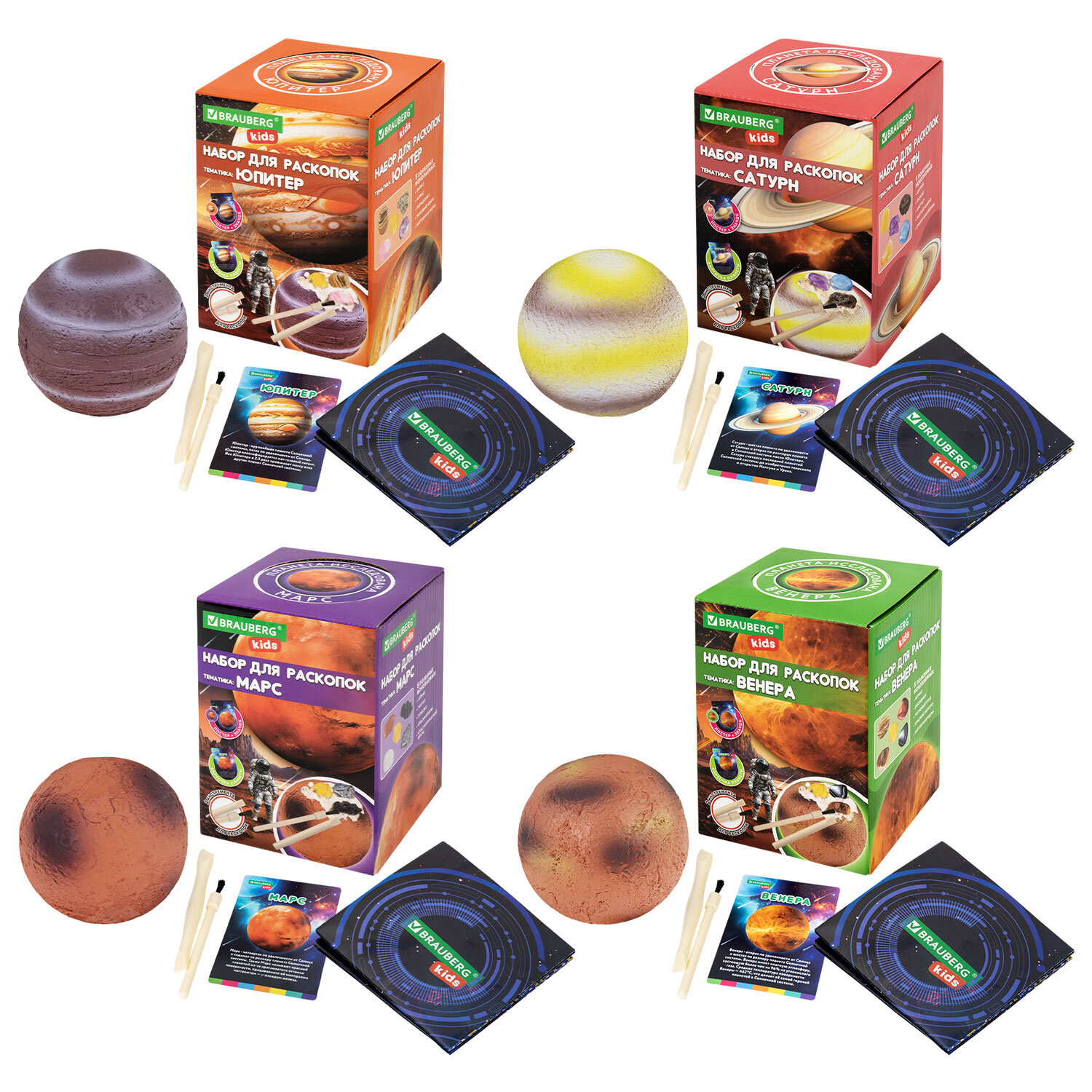 Набор для раскопок "Космос" 9,5х13,3 см, инструменты, 8 видов ассорти, BRAUBERG KIDS Код товара: 665919 242,78 ₽ Купить Производитель:BRAUBERG KIDS Отправьтесь в увлекательную космическую миссию, не выходя из дома! Научный набор "Космос" BRAUBERG KIDS для раскопок откроет перед юным астрономом двери в мир исследований далёких галактик. Что скрывает таинственный гипсовый блок? Вашему ребёнку предстоит провести раскопки и найти пять уникальных минералов, скрытых на одной из планет Солнечной системы. Это не просто игра, а увлекательное образовательное приключение, которое подарит часы захватывающего досуга и расширит кругозор. Что входит в набор? - Гипсовый блок для раскопок: прочная порода, которую содержит в себе уникальные минералы. - 5 минералов: камни разного цвета и фактуры - 2 профессиональных инструмента археолога: кисточка и долото помогут аккуратно и бережно извлечь каждую находку. - Познавательный буклет, представляющий собой красочный путеводитель по Солнечной системе, рассказывающий о планетах, их особенностях и интересных фактах. Ребёнок узнает, почему планеты имеет разный цвет и чем они уникальны. Почему этот набор понравится детям и родителям: - Этот набор погружает ребенка в удивительный мир астрономии, геологии и истории покорения космоса. - Он помогает развивать усидчивость и улучшает мелкую моторику. - Увлекательные открытия дарят радость и волнение.Производство: КитайТип товара: набор для раскопокВозраст ребенка: 3+Комплектация: долото, карточка, кисточкаКоличество предметов в наборе: 1Серия: наборы для раскопок ассортиСюжет: КосмосМатериал: гипсДлина: 9.5 смШирина: 9.5 смГлубина: 13.3 смУпаковка: красочная коробкаВес: 310 грРазмер упаковки: 9.8 × 13.7 × 9.8 смОбъём: 0.0018 м3Промежуточная упаковка: 8 штТранспортная упаковка: 48 штШтрих-код: 4606224474731 Файлы Сертификат-1.jpg Сертификат-2.jpg Сертификат-3.jpg Сертификат-4.jpg