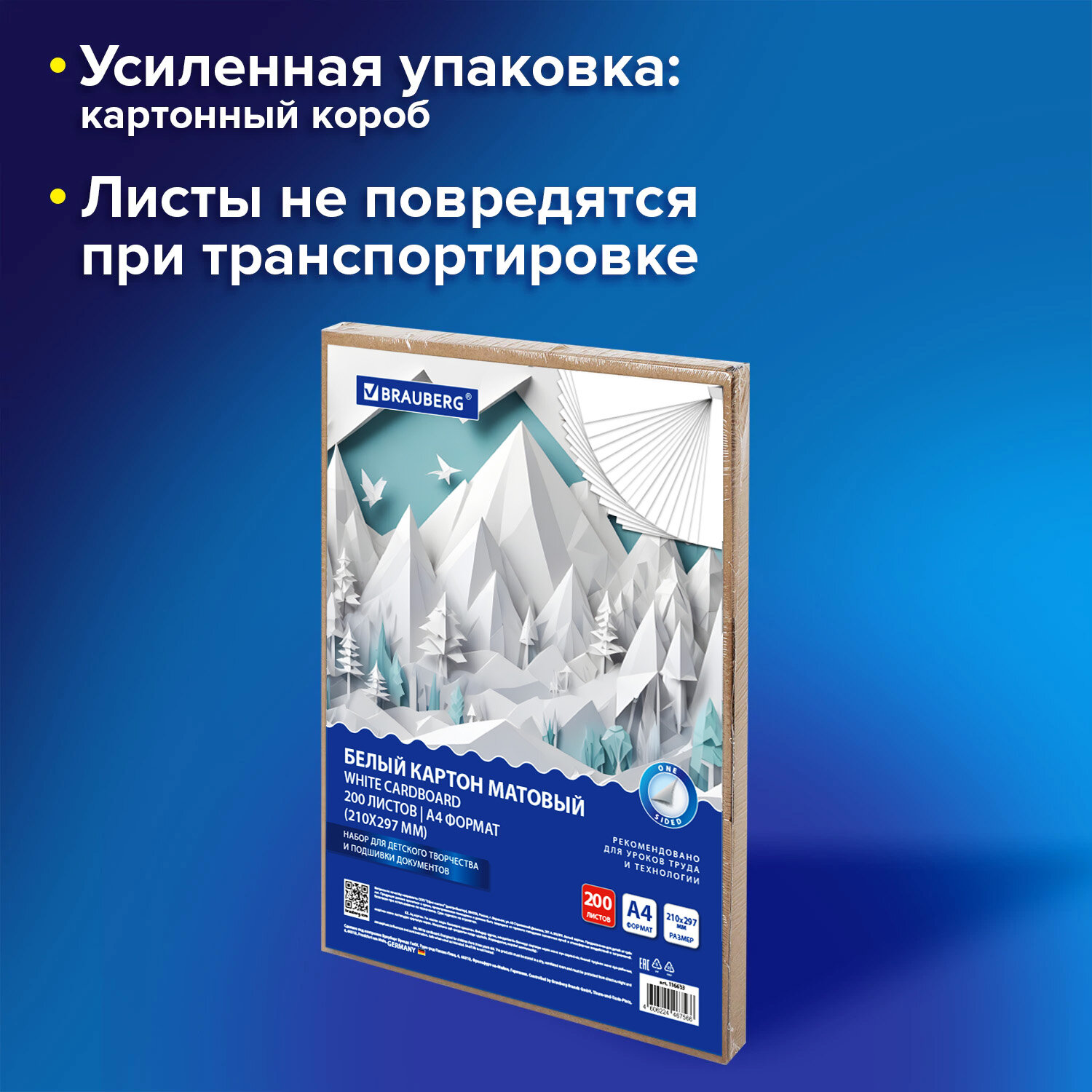 Картон белый А4 немелованный, 200 листов, в коробе, BRAUBERG, 210х297 мм Код товара: 116633 684,83 ₽ Купить Производитель:BRAUBERG Набор белого картона BRAUBERG предназначен для творчества и хобби, рекомендован для уроков труда и технологии. Может использоваться детьми с трехлетнего возраста. Немелованный белый картон BRAUBERG обладает плотностью 200 г/м2, имеет матовую поверхность, благодаря чему сохраняет белизну на протяжении длительного времени. Предназначен для подшивки документов, а также для творчества. Поделки и аппликации из него будут яркими и красивыми. Картон поможет воплотить в жизнь любую творческую задумку. В наборе 200 листов картона белого цвета формата А4 (210х297 мм). Картон упакован в короб из микро-гофрокартона – он поможет удобно хранить листы и защитит их при транспортировке.Производство: РоссияФормат: А4Количество листов: 200Плотность картона: 200 г/м2Применим для подшивки документов: даТип товара: картон белый немелованныйВид обложки: вкладыш формата А4Дизайн: ЭльбрусДлина: 210 ммШирина: 297 ммИндивидуальная упаковка: даУпаковка: коробкаВес: 2,52 кгРазмер упаковки: 6.2 × 30.6 × 21.9 смОбъём: 0.0047 м3Промежуточная упаковка: 4 штТранспортная упаковка: 4 штШтрих-код: 4606224467566 Сертификат-1.jpg Сертификат-2.jpg Сертификат-3.jpg