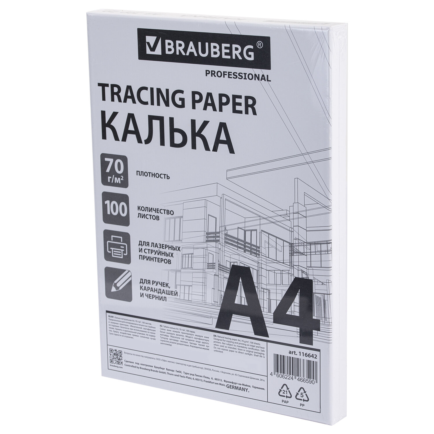 Калька А4 ВЫСОКОЙ ПРОЗРАЧНОСТИ, ПЛОТНАЯ, для печати и творчества, 70 г/м2, 100 листов, BRAUBERG Код товара: 116642 912,26 ₽ Купить Производитель:BRAUBERG Калька в листах BRAUBERG предназначена для широкого круга задач, в том числе для профессионального использования. Подходит для печати на струйном и лазерном принтере, а также для рисования и черчения карандашами, ручками и чернилами. Калька формата А4 изготавливается из высококачественного натурального сырья, обладает высокой прочностью, но при этом почти прозрачна, что позволяет легко копировать изображения. Плотность – 70 г/м2. Гладкая поверхность кальки обеспечивает четкость и аккуратность линий, что особенно важно для архитекторов, дизайнеров, художников и чертежников. Используется для создания эскизов, графических работ, архитектурных и дизайнерских чертежей. Также незаменима для дизайнерских и оформительских работ самого широкого спектра, в том числе для создания конвертов, открыток, пригласительных. Калька не желтеет при длительном хранении и подходит для архивных документов. Поставляется по 100 листов в прочной картонной коробке с дополнительной термоусадочной пленкой.Производство: КитайТип : в листахШирина рулона/листа: 297 ммДлина рулона/размер листа: 210 ммПлотность: 70 г/м2Формат: А4Количество листов: 100Серия: Tracing Paper PROНазначение: для струйной и лазерной печатиЦвет: белаяВес: 785 грРазмер упаковки: 2.6 × 31 × 22.5 смОбъём: 0.0021 м3Промежуточная упаковка: 12 штТранспортная упаковка: 12 штШтрих-код: 4606224466590 Файлы Сертификат-1.jpg Сертификат-2.jpg Сертификат-3.jpg Сертификат-4.jpg Сертификат-5.jpg Сертификат-6.jpg Сертификат-7.jpg Сертификат-8.jpg Сертификат-9.jpg Сертификат-10.jpg Сертификат-11.jpg Сертификат-12.jpg Сертификат-13.jpg Сертификат-14.jpg Сертификат-15.jpg Сертификат-16.jpg Сертификат-17.jpg Сертификат-18.jpg Сертификат-19.jpg Сертификат-20.jpg Сертификат-21.jpg Сертификат-22.jpg Сертификат-23.jpg Сертификат-24.jpg Сертификат-25.jpg Сертификат-26.jpg