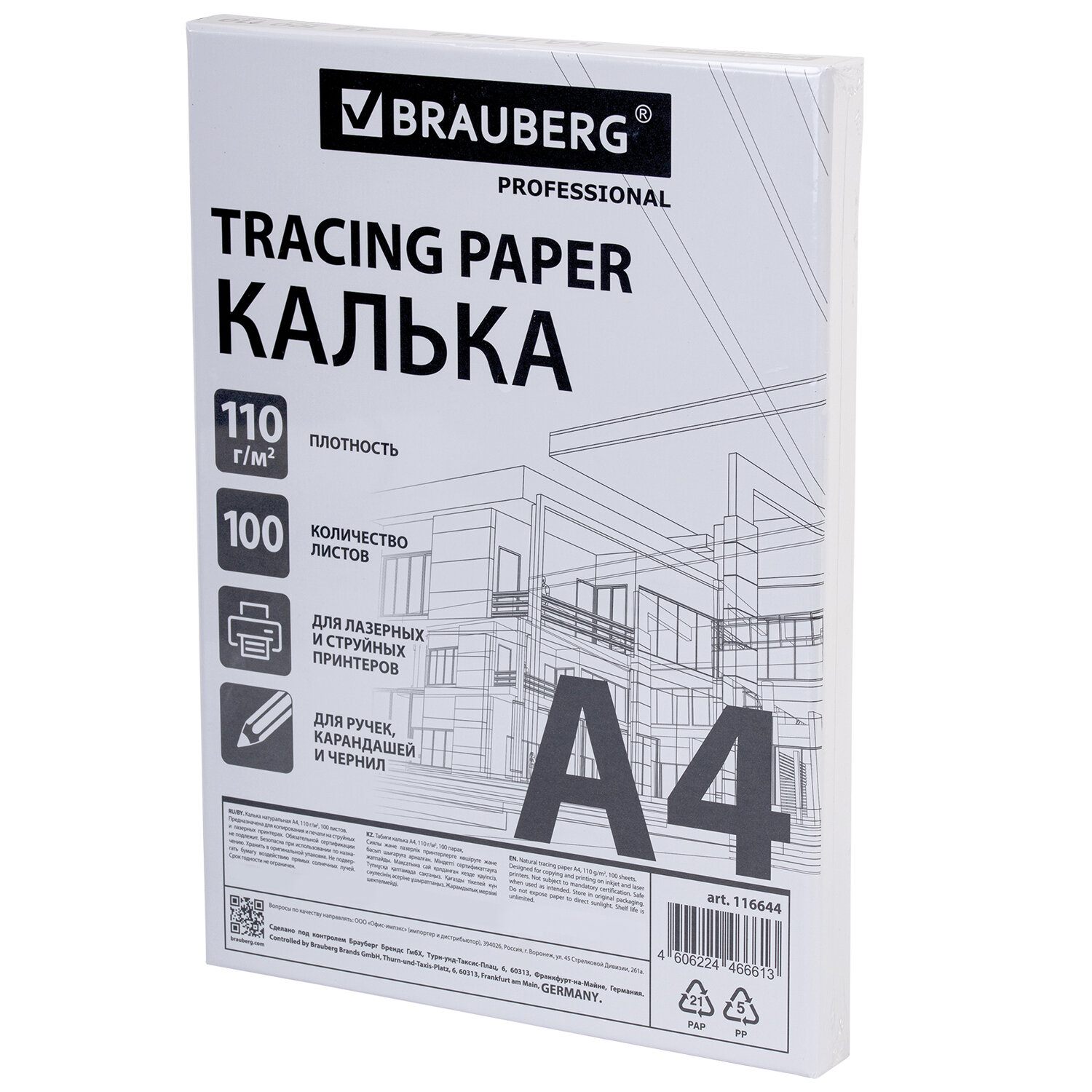 Калька А4 ВЫСОКОЙ ПРОЗРАЧНОСТИ, ПЛОТНАЯ, для печати и творчества, 110 г/м2, 100 листов BRAUBERG Код товара: 116644 1 139,71 ₽ Купить Производитель:BRAUBERG Калька в листах BRAUBERG предназначена для широкого круга задач, в том числе для профессионального использования. Подходит для печати на струйном и лазерном принтере, а также для рисования и черчения карандашами, ручками и чернилами. Калька формата А4 изготавливается из высококачественного натурального сырья, обладает высокой прочностью, но при этом почти прозрачна, что позволяет легко копировать изображения. Плотность – 110 г/м2. Гладкая поверхность кальки обеспечивает четкость и аккуратность линий, что особенно важно для архитекторов, дизайнеров, художников и чертежников. Используется для создания эскизов, графических работ, архитектурных и дизайнерских чертежей. Также незаменима для дизайнерских и оформительских работ самого широкого спектра, в том числе для создания конвертов, открыток, пригласительных. Калька не желтеет при длительном хранении и подходит для архивных документов. Поставляется по 100 листов в прочной картонной коробке с дополнительной термоусадочной пленкой.Производство: КитайТип : в листахШирина рулона/листа: 297 ммДлина рулона/размер листа: 210 ммПлотность: 110 г/м2Формат: А4Количество листов: 100Серия: Tracing Paper PROНазначение: для струйной и лазерной печатиЦвет: белаяВес: 1,02 кгРазмер упаковки: 2.6 × 31 × 22.5 смОбъём: 0.0021 м3Промежуточная упаковка: 12 штТранспортная упаковка: 12 штШтрих-код: 4606224466613 Файлы Сертификат-1.jpg Сертификат-2.jpg Сертификат-3.jpg Сертификат-4.jpg Сертификат-5.jpg Сертификат-6.jpg Сертификат-7.jpg Сертификат-8.jpg Сертификат-9.jpg Сертификат-10.jpg Сертификат-11.jpg Сертификат-12.jpg Сертификат-13.jpg Сертификат-14.jpg Сертификат-15.jpg Сертификат-16.jpg Сертификат-17.jpg Сертификат-18.jpg Сертификат-19.jpg Сертификат-20.jpg Сертификат-21.jpg Сертификат-22.jpg Сертификат-23.jpg Сертификат-24.jpg Сертификат-25.jpg Сертификат-26.jpg