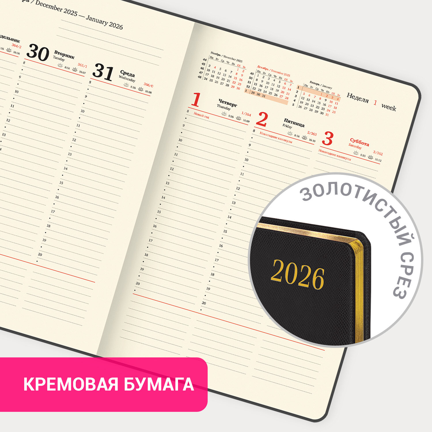 Еженедельник датированный 2026, БОЛЬШОЙ ФОРМАТ 210х297 мм, А4, BRAUBERG "Iguana", под кожу, черный Код товара: 117153 660,58 ₽ Купить Производитель:BRAUBERG Модная фактура и насыщенный цвет придают еженедельнику BRAUBERG "Iguana" особый шик и легкую загадочность. Внутренний блок включает 64 листа кремовой бумаги плотностью 70 г/м2. Благодаря большому формату А4 еженедельник удобно использовать как в офисе, так и на выездных деловых встречах. Твердая обложка, стилизованная под фактурную кожу черного цвета, подходит для горячего тиснения. Дополнением является закладка-ляссе, с помощью которой при необходимости можно быстро открыть еженедельник на нужной странице. В конце внутреннего блока есть 7 страниц для записей и заметок. Обширный справочный материал расширяет функциональность еженедельника. Датированный еженедельник BRAUBERG "Iguana" идеально подойдет для офисных работников и людей, занимающихся бизнесом.Производство: КитайТип еженедельника: датированныйСерия: IguanaГод: 2026Формат: А4Обложка: под кожу рептилийКоличество листов: 64 шт.Особенности: закладка-ляссе, поролоновая прослойка, скругленные углы, справочная информацияТип застежки: нетОсновной цвет обложки: черныйДополнительный цвет обложки: нетЦветной срез: даЦвет внутреннего блока: кремовыйПлотность внутренного блока: 70 г/м2Тип крепления: сшивкаПечать блока: 2 краскиПодходит для блинтового тиснения: даПодходит для тиснения фольгой: даДлина: 297 ммШирина: 210 ммВес: 545 грРазмер упаковки: 1.8 × 29.5 × 21.5 смОбъём: 0.0014 м3Промежуточная упаковка: 24 штТранспортная упаковка: 24 штШтрих-код: 4606224490724 Файлы Сертификат-1.jpg Сертификат-2.jpg Сертификат-3.jpg Сертификат-4.jpg Сертификат-5.jpg Сертификат-6.jpg Сертификат-7.jpg Сертификат-8.jpg Сертификат-9.jpg Сертификат-10.jpg Сертификат-11.jpg Сертификат-12.jpg Сертификат-13.jpg Сертификат-14.jpg Сертификат-15.jpg Сертификат-16.jpg Сертификат-17.jpg Сертификат-18.jpg Сертификат-19.jpg Сертификат-20.jpg Сертификат-21.jpg Сертификат-22.jpg Сертификат-23.jpg Сертификат-24.jpg Сертификат-25.jpg Сертификат-26.jpg