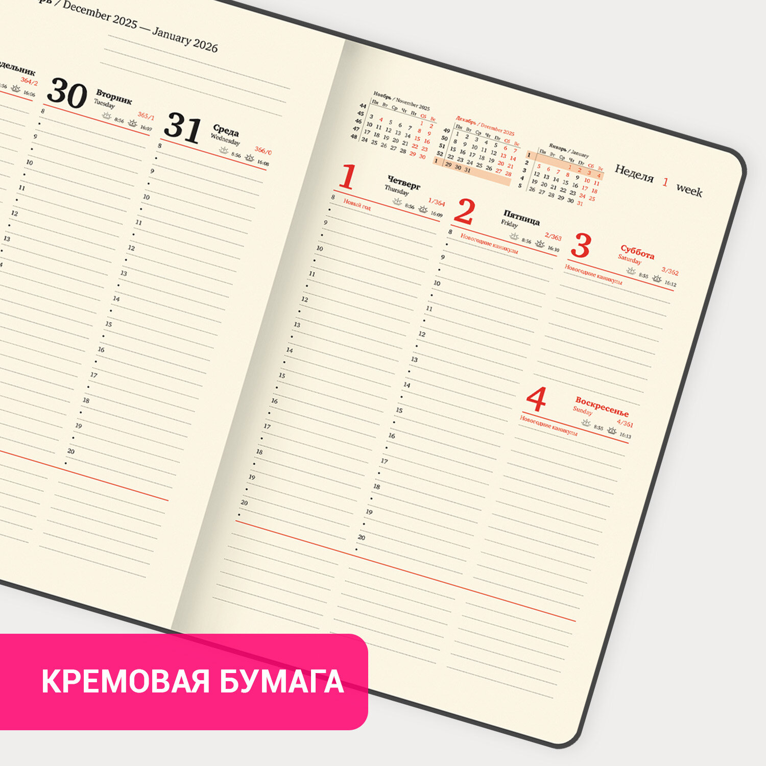 Еженедельник датированный 2026, БОЛЬШОЙ ФОРМАТ 210х297 мм, А4, BRAUBERG "Imperial", под кожу, синий Код товара: 117157 649,87 ₽ Купить Производитель:BRAUBERG Датированный еженедельник BRAUBERG "Imperial" выполнен в классическом дизайне. Мягкая обложка с легкой рельефной фактурой, прошитая по периметру, и непревзойденное качество исполнения воплощают поистине имперскую роскошь делового аксессуара. Внутренний блок включает 64 листа кремовой бумаги плотностью 70 г/м2. Благодаря большому формату А4 еженедельник удобно использовать как в офисе, так и на выездных деловых встречах. Твердая обложка, стилизованная под фактурную кожу благородного синего цвета, подходит для горячего тиснения. Дополнением является закладка-ляссе, с помощью которой при необходимости можно быстро открыть еженедельник на нужной странице. В конце внутреннего блока есть 7 страниц для записей и заметок. Обширный справочный материал расширяет функциональность еженедельника. Датированный еженедельник BRAUBERG "Imperial" идеально подойдет для офисных работников и людей, занимающихся бизнесом.Производство: КитайТип еженедельника: датированныйСерия: ImperialГод: 2026Формат: А4Обложка: под гладкую кожуКоличество листов: 64 шт.Особенности: закладка-ляссе, поролоновая прослойка, прострочка по периметру, скругленные углы, справочная информацияТип застежки: нетОсновной цвет обложки: синийДополнительный цвет обложки: нетЦвет внутреннего блока: кремовыйПлотность внутренного блока: 70 г/м2Тип крепления: сшивкаПечать блока: 2 краскиПодходит для блинтового тиснения: даПодходит для тиснения фольгой: даПодходит для заливки полимерной смолой: даПодходит для УФ-печати: даПодходит для тампопечати: даДлина: 297 ммШирина: 210 ммВес: 536 грРазмер упаковки: 1.6 × 29.7 × 21.3 смОбъём: 0.0014 м3Промежуточная упаковка: 24 штТранспортная упаковка: 24 штШтрих-код: 4606224490762 Файлы Сертификат-1.jpg Сертификат-2.jpg Сертификат-3.jpg Сертификат-4.jpg Сертификат-5.jpg Сертификат-6.jpg Сертификат-7.jpg Сертификат-8.jpg Сертификат-9.jpg Сертификат-10.jpg Сертификат-11.jpg Сертификат-12.jpg Сертификат-13.jpg Сертификат-14.jpg Сертификат-15.jpg Сертификат-16.jpg Сертификат-17.jpg Сертификат-18.jpg Сертификат-19.jpg Сертификат-20.jpg Сертификат-21.jpg Сертификат-22.jpg Сертификат-23.jpg Сертификат-24.jpg Сертификат-25.jpg Сертификат-26.jpg