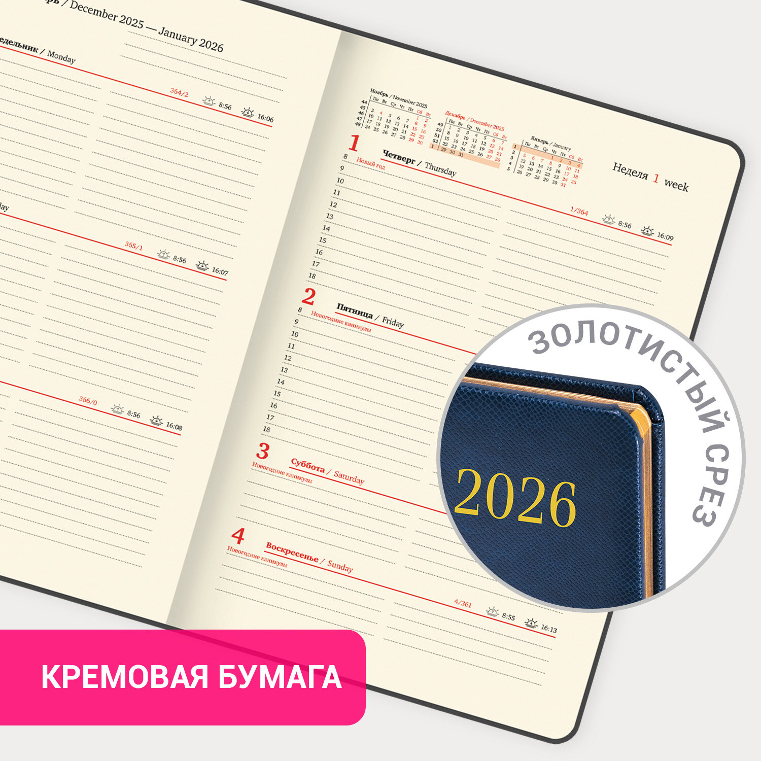 Еженедельник датированный 2026, А5, 145х215 мм, BRAUBERG "Iguana", под кожу, синий Код товара: 117170 360,6 ₽ Купить Производитель:BRAUBERG Еженедельник BRAUBERG "Iguana" отличается модной фактурой и глубоким насыщенным цветом, придающим изделию элегантность, загадочность и изысканный вид. Внутренний блок включает 64 листа тонированной бумаги плотностью 70 г/м2. Благодаря стандартному формату А5 еженедельник удобно использовать как в офисе, так и на выездных деловых встречах. Твердая обложка, стилизованная под кожу рептилии, имеет благородный синий цвет и подходит для горячего тиснения. Срез еженедельника украшен золотым фольгированием – это подчеркивает премиальность изделия. Дополнением является закладка-ляссе, с помощью которой при необходимости можно быстро открыть еженедельник на нужной странице. В конце внутреннего блока есть 7 страниц для записей и заметок. Обширный справочный материал расширяет функциональность еженедельника. Датированный еженедельник BRAUBERG "Iguana" идеально подойдет для офисных работников и людей, занимающихся бизнесом.Производство: КитайТип еженедельника: датированныйСерия: IguanaГод: 2026Формат: А5Обложка: под кожу змеиКоличество листов: 64 шт.Особенности: закладка-ляссе, поролоновая прослойка, скругленные углы, справочная информацияТип застежки: нетОсновной цвет обложки: синийДополнительный цвет обложки: нетЦветной срез: даЦвет внутреннего блока: кремовыйПлотность внутренного блока: 70 г/м2Тип крепления: сшивкаПечать блока: 2 краскиПодходит для блинтового тиснения: даПодходит для тиснения фольгой: даДлина: 215 ммШирина: 145 ммВес: 275 грРазмер упаковки: 1.5 × 21.6 × 15 смОбъём: 0.0006 м3Промежуточная упаковка: 36 штТранспортная упаковка: 36 штШтрих-код: 4606224490892 Файлы Сертификат-1.jpg Сертификат-2.jpg Сертификат-3.jpg Сертификат-4.jpg Сертификат-5.jpg Сертификат-6.jpg Сертификат-7.jpg Сертификат-8.jpg Сертификат-9.jpg Сертификат-10.jpg Сертификат-11.jpg Сертификат-12.jpg Сертификат-13.jpg Сертификат-14.jpg Сертификат-15.jpg Сертификат-16.jpg Сертификат-17.jpg Сертификат-18.jpg Сертификат-19.jpg Сертификат-20.jpg Сертификат-21.jpg Сертификат-22.jpg Сертификат-23.jpg Сертификат-24.jpg Сертификат-25.jpg Сертификат-26.jpg