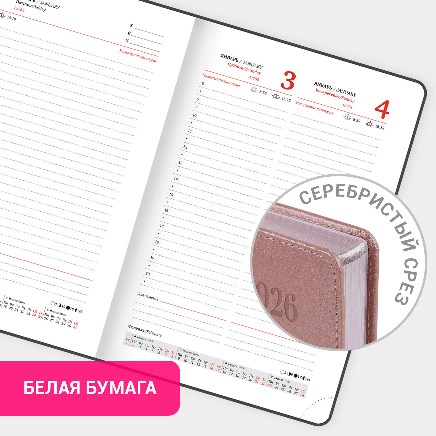 Ежедневник датированный 2026, А5, 138х213 мм, BRAUBERG "Impression", под кожу, розовый Код товара: 117514 478,18 ₽ Купить Производитель:BRAUBERG Датированный ежедневник BRAUBERG "Impression" выполнен в классическом стиле. Отличается лаконичным дизайном и аккуратным исполнением. Внутренний блок включает 168 листов белой бумаги плотностью 70 г/м2. Каждая страничка имеет перфорированный угол. Благодаря стандартному формату А5 (138х213 мм) ежедневник удобно использовать как в офисе, так и на выездных деловых встречах. Твердая обложка стилизована под гладкую кожу розового цвета. Материал обложки подходит для горячего тиснения. Серебряный срез придает ежедневнику особый шарм. Дополнением является закладка-ляссе, с помощью которой при необходимости можно быстро открыть ежедневник на нужной странице. Справочный материал дополнительно расширяет функциональность ежедневника. В конце внутреннего блока есть 4 страницы для записей и заметок. Идеально подойдет для офисных работников и людей, занимающихся бизнесом.Производство: КитайТип ежедневника: датированныйФормат: А5Обложка: под гладкую кожуВид обложки: твердаяКоличество листов: 168 шт.Особенности: закладка-ляссе, перфорация уголков, поролоновая прослойка, прострочка по периметру, скругленные углы, справочная информацияСерия: ImpressionГод: 2026Тип застежки: нетОсновной цвет обложки: розовыйДополнительный цвет обложки: нетЦвет среза: серебристыйЦвет внутреннего блока: белыйПлотность внутреннего блока: 70 г/м2Высота строки для записи: 4 ммТип крепления: сшивкаПечать блока: 2 краскиПодходит для блинтового тиснения: даПодходит для тиснения фольгой: даПодходит для заливки полимерной смолой: даДлина: 213 ммШирина: 138 ммТолщина: 20 ммВес: 466 грРазмер упаковки: 2.5 × 21.4 × 13.9 смОбъём: 0.001 м3Промежуточная упаковка: 20 штТранспортная упаковка: 20 штШтрих-код: 4606224489414 Файлы Сертификат-1.jpg Сертификат-2.jpg Сертификат-3.jpg Сертификат-4.jpg Сертификат-5.jpg Сертификат-6.jpg Сертификат-7.jpg Сертификат-8.jpg Сертификат-9.jpg Сертификат-10.jpg Сертификат-11.jpg Сертификат-12.jpg Сертификат-13.jpg Сертификат-14.jpg Сертификат-15.jpg Сертификат-16.jpg Сертификат-17.jpg Сертификат-18.jpg Сертификат-19.jpg Сертификат-20.jpg Сертификат-21.jpg Сертификат-22.jpg Сертификат-23.jpg Сертификат-24.jpg Сертификат-25.jpg Сертификат-26.jpg