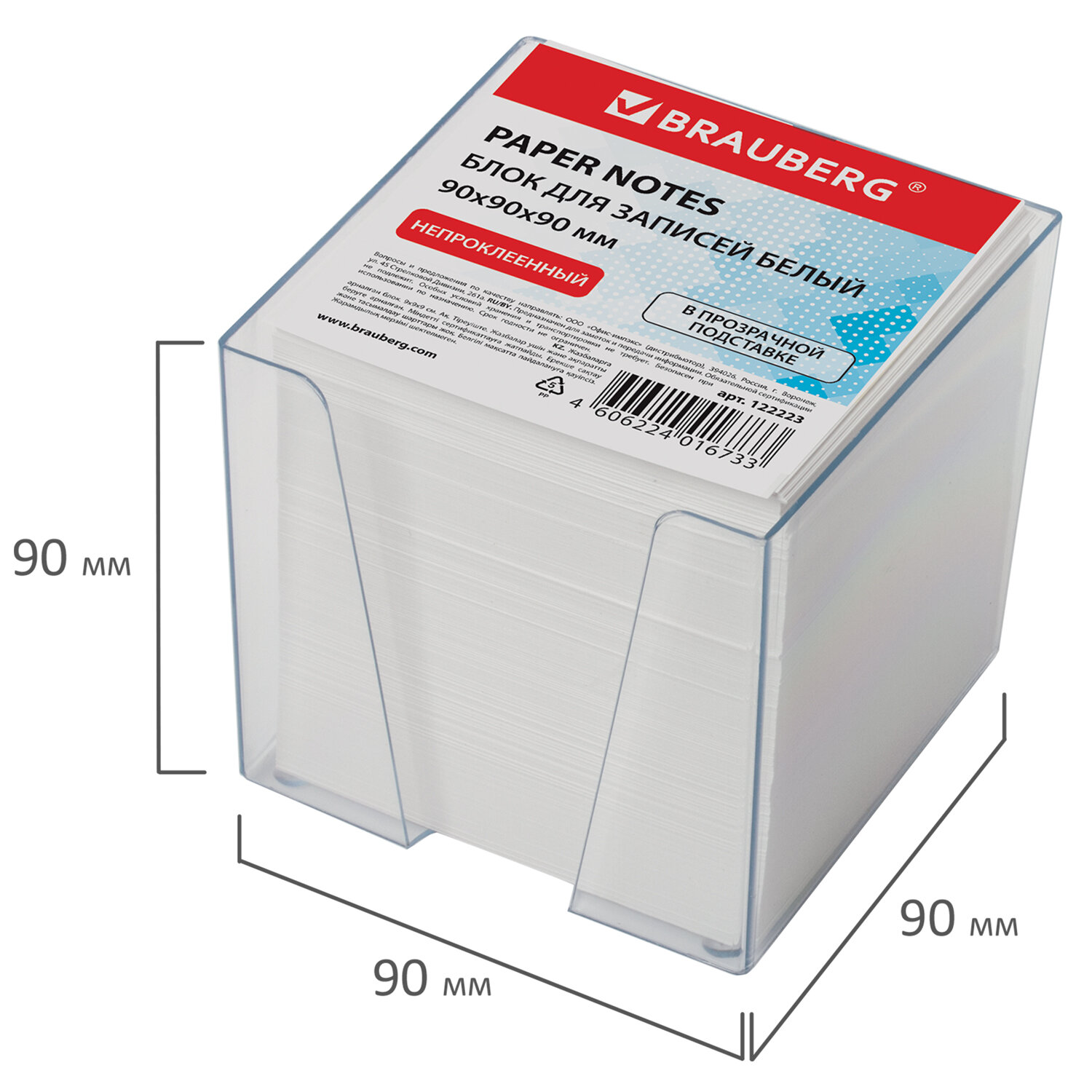 Блок для записей в боксе, 9х9х9 см, плотность 80 г/м2, белизна 95-98%, BRAUBERG Код товара: 122223 360,23 ₽ Купить Производитель:BRAUBERG Блок для записей BRAUBERG в пластиковой подставке предназначен для организации рабочих процессов и повседневных задач. Идеально подходит для работников офиса и руководителей. Блок высотой 9 см сложен из квадратных листов размером 9 х 9 см. Листы изготовлены из высококачественной офсетной бумаги плотностью 80 г/м2 и белизной 95-98%. Блок для записей подходит для письма любыми типами ручек и карандашей, листы благодаря высокой плотности не продавливаются при нажатии. Поставляется в плотной термоусадочной пленке, защищающей при транспортировке. Когда бумага закончится, можно вставить сменный блок.Производство: РоссияВысота блока: 90 ммДлина блока: 90 ммШирина блока: 90 ммЦвет бумаги: белыйПлотность: 80 г/м2Материал подставки: пластикСерия: HolderБелизна: 98 %Цвет подставки: ассортиУпаковка: термопленкаВес: 514 грРазмер упаковки: 9.3 × 9.8 × 9.6 смОбъём: 0.0012 м3Промежуточная упаковка: 12 штТранспортная упаковка: 12 штШтрих-код: 4606224016733 Файлы Приложение-1.pdf Приложение-2.pdf Сертификат-1.jpg Сертификат-2.jpg Сертификат-3.jpg Сертификат-4.jpg Сертификат-5.jpg Сертификат-6.jpg Сертификат-7.jpg Сертификат-8.jpg Сертификат-9.jpg Сертификат-10.jpg Сертификат-11.jpg Сертификат-12.jpg Сертификат-13.jpg Сертификат-14.jpg Сертификат-15.jpg Сертификат-16.jpg Сертификат-17.jpg Сертификат-18.jpg Сертификат-19.jpg Сертификат-20.jpg Сертификат-21.jpg Сертификат-22.jpg Сертификат-23.jpg Сертификат-24.jpg Сертификат-25.jpg Сертификат-26.jpg
