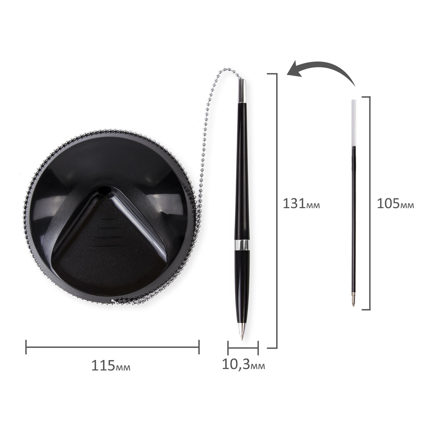 Ручка шариковая настольная BRAUBERG "Стенд-Пен Блэк 2", СИНЯЯ, цепочка, корпус черный, линия письма 0,5 мм Код товара: 141347 529,25 ₽ Купить Производитель:BRAUBERG Настольная шариковая ручка BRAUBERG "Стенд-Пен Блэк 2" с классическим дизайном прекрасно впишется в интерьер любого офиса, информационного бюро. Корпус ручки и подставки выполнен из пластика черного цвета с хромированными деталями. Ручка крепится к подставке с помощью крепкой цепочки и фиксируется на любой ровной поверхности с помощью клейкого основания на массивной подставке. Длина стержня составляет 105 мм. Диаметр основания – 11,5 см. Создает линию письма толщиной 0,5 мм. Цвет чернил – синий.Производство: КитайЦвет чернил: синийТолщина линии письма: 0.5 ммКрепление ручки к подставке: цепочкаСерия: Стенд-Пен 2Цвет корпуса: черныйСрок годности: 48 месВес: 152 грРазмер упаковки: 4.3 × 13.2 × 12.6 смОбъём: 0.001 м3Промежуточная упаковка: 10 штТранспортная упаковка: 100 штШтрих-код: 4606224060255 Сертификат-1.jpg Сертификат-2.jpg Сертификат-3.jpg