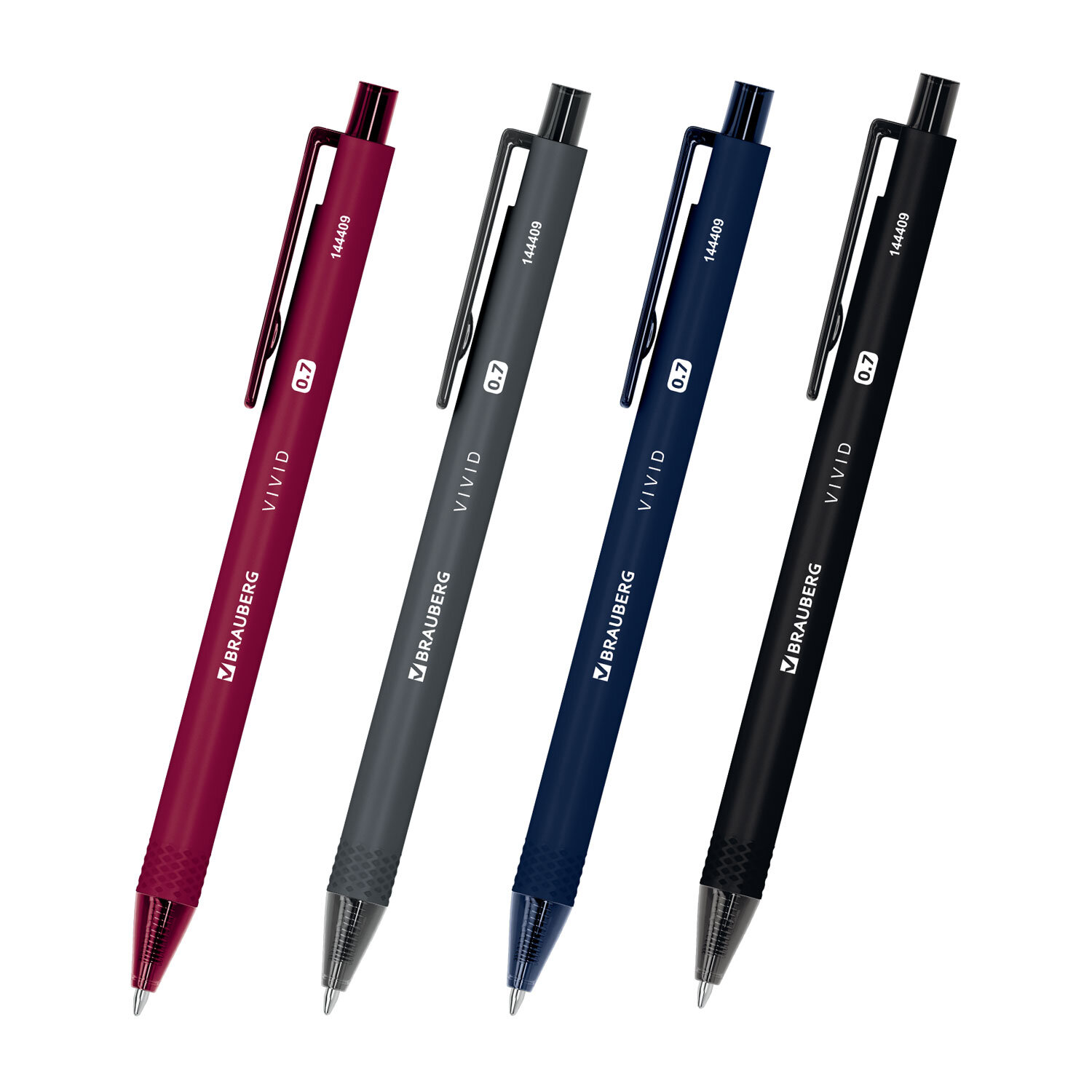 Ручки шариковые автоматические BRAUBERG "VIVID", СИНИЕ, НАБОР 4 ШТУКИ, soft-touch, пишущий узел 0,7 мм, линия письма 0,35 мм Код товара: 144409 175,83 ₽ Купить Производитель:BRAUBERG Автоматическая шариковая ручка BRAUBERG "VIVID" обладает soft-touch покрытием и стильным дизайном корпуса в темных оттенках. Стандартный пишущий узел, диаметр которого составляет 0,7 мм, создает линию письма, равную 0,35 мм. Ручка имеет сменный стержень длиной 107 мм. Качественные чернила обеспечивают мягкое и комфортное письмо. Цвет чернил – синий. Набор включает в себя 4 ручки с разными оттенками корпуса и упакован в удобный флоупак с европодвесом для размещения в розничном магазине.Производство: КитайЦвет чернил: синийТолщина линии письма: 0.35 ммДиаметр пишущего узла: 0.7 ммФорма наконечника: стандартныйДлина сменного стержня: 107 ммКоличество в комплекте: 4 шт.Цвет корпуса: Vivid dark formДлина письма: 1000 мСерия: VIVIDДизайн: Vivid dark formФорма корпуса: круглаяПокрытие корпуса: Soft-TouchУпаковка: пакет с подвесомСрок годности: 60 месВес: 41 грРазмер упаковки: 1.3 × 16.2 × 5.7 смОбъём: 0.0001 м3Промежуточная упаковка: 12 штТранспортная упаковка: 288 штШтрих-код: 4606224469065 Файлы Сертификат-1.jpg Сертификат-2.jpg Сертификат-3.jpg