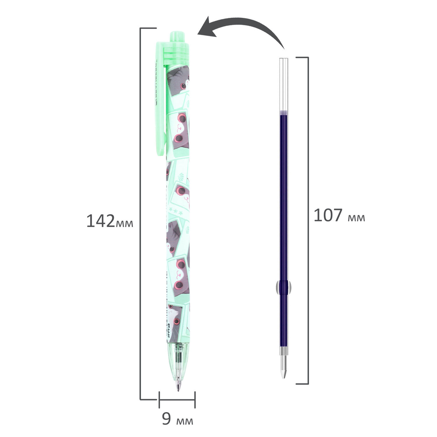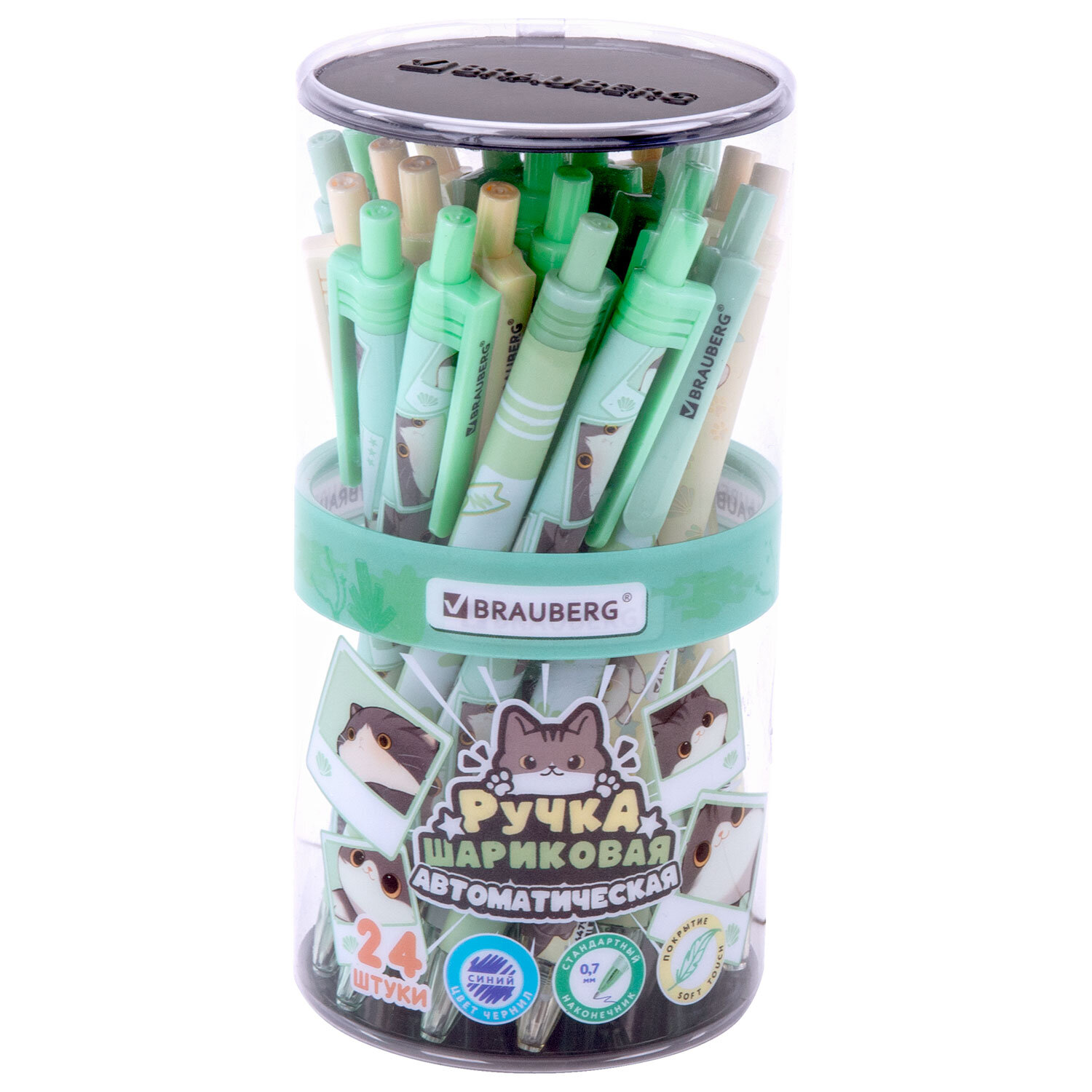 Ручка шариковая автоматическая с принтом, кросс-серия "МИЛЫЕ КОТЫ", BRAUBERG, корпус soft-touch, СИНЯЯ, узел 0,7 мм, линия 0,35 мм Код товара: 144479 46,78 ₽ Купить Производитель:BRAUBERG Ручка шариковая автоматическая BRAUBERG "МИЛЫЕ КОТЫ" – яркий и практичный пишущий инструмент, который поможет эффективно справляться с ежедневными задачами. Ручка представлена в оригинальном дизайне с милыми котами, которые привлекают внимание своим очаровательным видом, никого не оставляя равнодушным. Круглый корпус с покрытием soft-touch способствует удобному положению в руке. Стандартный пишущий узел 0,7 мм создает аккуратную линию письма толщиной 0,35 мм. Надежный клип позволяет закрепить ручку на тетради или папке – всегда удобно носить с собой. Синий цвет чернил делает ручку универсальной для ведения записей в школе, университете или офисе.Производство: КитайЦвет чернил: синийТолщина линии письма: 0.35 ммДиаметр пишущего узла: 0.7 ммФорма наконечника: стандартныйДлина сменного стержня: 107 ммКоличество в комплекте: 1 шт.Цвет корпуса: Милые котыДлина письма: 1000 мСерия: CUTEДизайн: Милые котыФорма корпуса: круглаяПокрытие корпуса: Soft-TouchУпаковка: пластиковая тубаСрок годности: 60 месВес: 10 грРазмер упаковки: 1 × 14.2 × 1.4 смОбъём: 0.0001 м3Промежуточная упаковка: 24 штТранспортная упаковка: 864 штШтрих-код: 4606224482361 Файлы Сертификат-1.jpg Сертификат-2.jpg