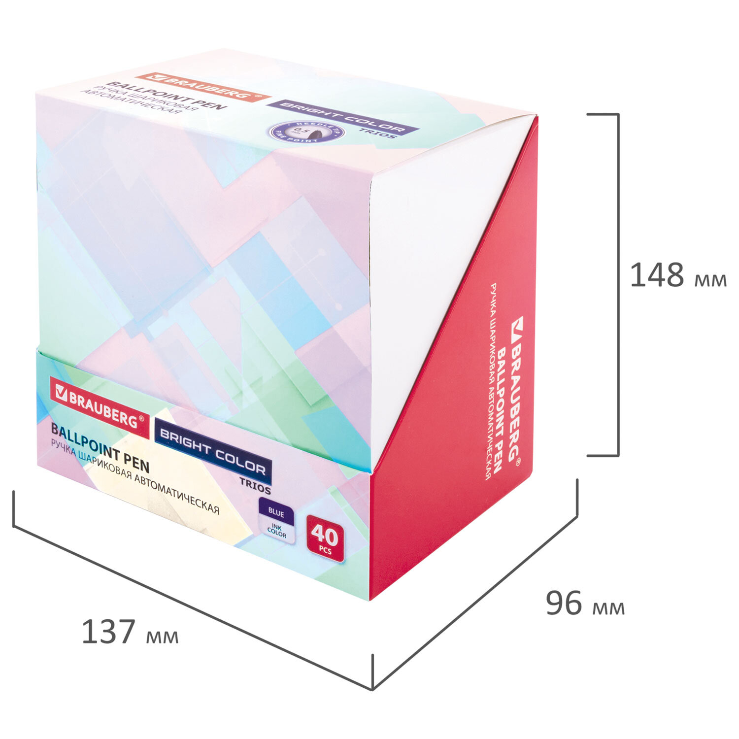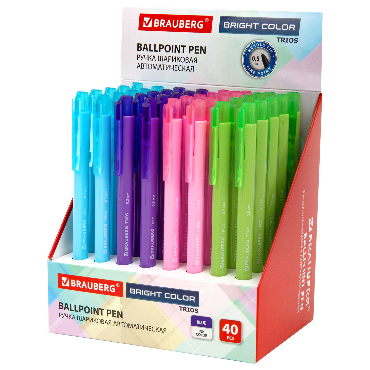 Ручка шариковая автоматическая BRAUBERG "TRIOS BRIGHT COLOR", корпус ассорти, СИНЯЯ, пишущий узел 0,5 мм, линия письма 0,3 мм Код товара: 144497 26,01 ₽ Купить Производитель:BRAUBERG Автоматическая шариковая ручка BRAUBERG "TRIOS BRIGHT COLOR" – это сочетание стильного и современного дизайна с качественным и надежным характеристикам письма! Автоматическая шариковая ручка BRAUBERG "TRIOS BRIGHT COLOR" представлена в четырех ярких цветах: розовый, голубой, салатовый, фиолетовый. Благодаря трехгранному корпусу она комфортно фиксируется в руке и обеспечивает стабильность при долговом использовании. Размер пишущего узла составляет 0,5 мм, что дает линию 0,3 мм. Инновационная масляная технология чернил придает исключительно плавное и мягкое письмо без усилий. Цвет чернил – синий.Производство: КитайЦвет чернил: синийОдноразовая: даТолщина линии письма: 0.3 ммДиаметр пишущего узла: 0.5 ммФорма наконечника: игольчатыйЧернила на масляной основе: даКоличество в комплекте: 1 шт.Эргономичная зона захвата: отсутствуетЦвет корпуса: ассортиДлина письма: 600 мСерия: TriosДизайн: ассортиФорма корпуса: трехграннаяПокрытие корпуса: -Упаковка: дисплейСрок годности: 60 месВес: 10 грРазмер упаковки: 1 × 14.6 × 1.3 смОбъём: 0.0001 м3Промежуточная упаковка: 40 штТранспортная упаковка: 960 штШтрих-код: 4606224492964 Файлы Сертификат-1.jpg Сертификат-2.jpg Сертификат-3.jpg Сертификат-4.jpg