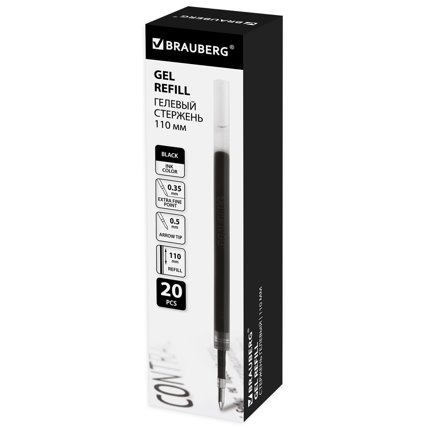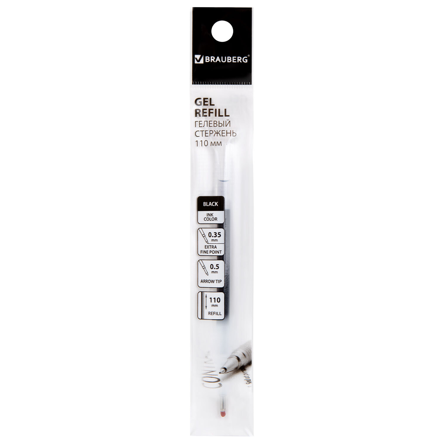 Стержень гелевый BRAUBERG 110 мм, ЧЕРНЫЙ, узел 0,5 мм, линия письма 0,35 мм Код товара: 170173 54,37 ₽ Купить Производитель:BRAUBERG Стержень BRAUBERG с гелевыми чернилами обеспечивает ровное, комфортное письмо. Подходит к большинству автоматических гелевых ручек. Длина стержня составляет 110 мм. Диаметр пишущего узла 0,5 мм создает тонкую линию письма, равную 0,35 мм. Имеет евро-наконечник. Цвет чернил – черный.Производство: КитайДлина стержня: 110 ммЦвет чернил: черныйДля автоматических ручек: даТолщина линии письма: 0.35 ммДиаметр пишущего узла: 0.5Серия: 110 BPКоличество в комплекте: 1 шт.Форма наконечника: стандартныйМатериал корпуса: пластикУпаковка: полибэг с подвесомСрок годности: 60 месВес: 4 грРазмер упаковки: 0.5 × 14.1 × 2.3 смПромежуточная упаковка: 20 штТранспортная упаковка: 1920 штШтрих-код: 4606224032221 Сертификат-1.jpg Сертификат-2.jpg Сертификат-3.jpg