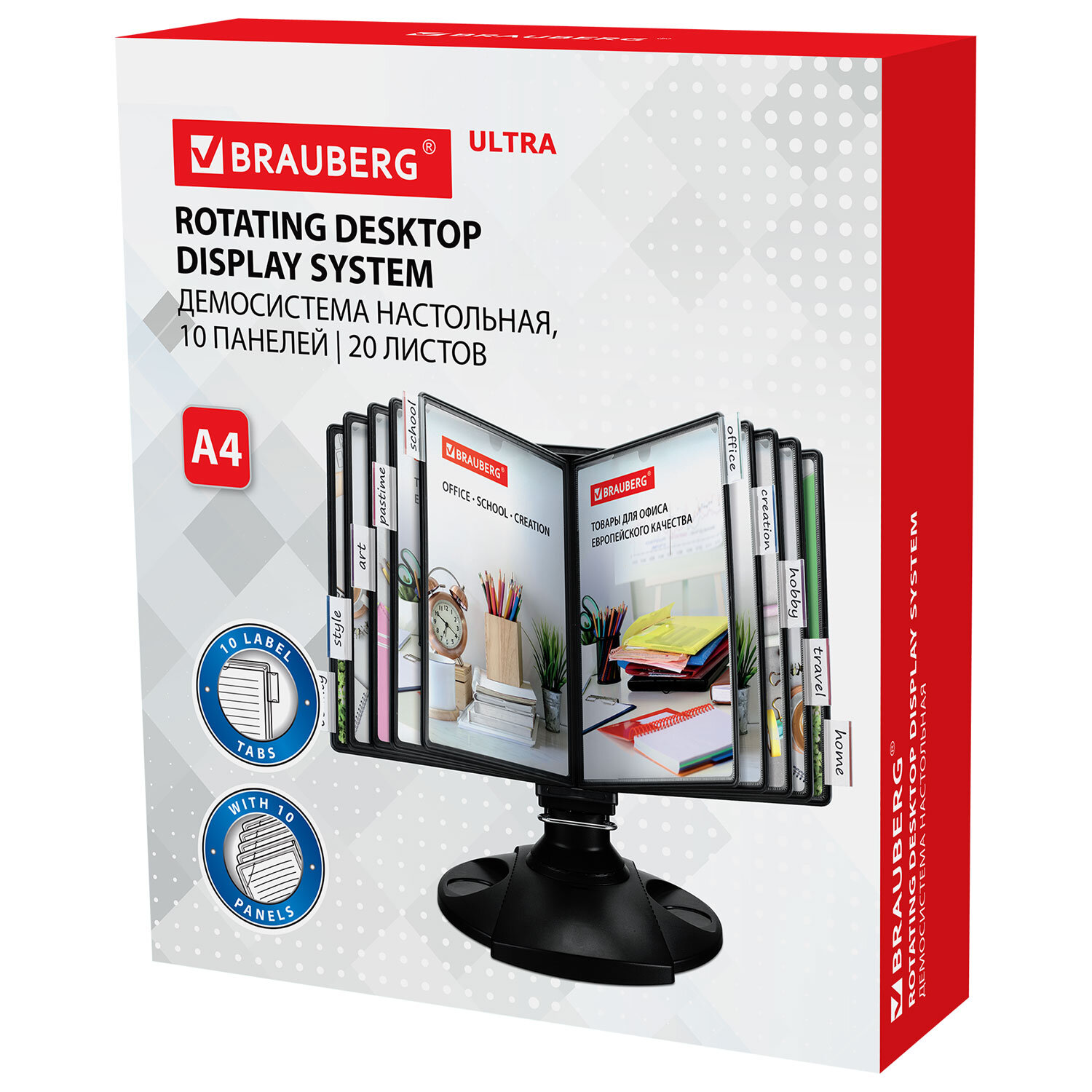 Демосистема настольная на 10 панелей, с 10 серыми панелями А4, вращающаяся, BRAUBERG ULTRA Код товара: 231236 6 413,14 ₽ Купить Производитель:BRAUBERG Настольная демонстрационная система BRAUBERG позволяет удобно и быстро разместить информацию о Вашей компании, товарах, услугах, ценах, инструкции для персонала и др. 10 двухсторонних панелей серого цвета позволяют разместить одновременно до 20 листов формата А4. Прочные и гибкие литые рамки панелей изготовлены из полипропилена, пригодного для повторной переработки и дальнейшего использования. Демопанели оснащены съемными ярлычками-табуляторами для маркировки и удобного поиска нужной информации. Карман демопанели из прочного прозрачного материала с антибликовым покрытием надежно защитит документы от внешних воздействий. Устойчивое основание и поворот на 360 градусов гарантируют удобство пользователю и быстрый доступ к документу. Возможно настенное размещение. Стильный серый цвет пластикового корпуса подойдёт для большинства современных интерьеров.Производство: Тайвань (Китай)Размещение: настольнаяФормат панелей: А4Макс. количество размещаемых панелей: 10 штКоличество панелей в комплекте: 10 шт.Количество ярлычков-табуляторов в комплекте: 10 шт.Серия: ROTATEВращающийся держатель панелей: даАнтибликовая поверхность панелей: даМатериал корпуса : пластикМатериал панелей: пластикВысота конструкции: 34 смШирина в раскрытом виде: 50 смЦвет корпуса: серыйЦвет панелей: серыйВес: 2,2 кгРазмер упаковки: 13.2 × 40.5 × 35 смОбъём: 0.0222 м3Промежуточная упаковка: 4 штТранспортная упаковка: 4 штШтрих-код: 4606224022512 Файлы Сертификат-1.jpg Сертификат-2.jpg Сертификат-3.jpg Сертификат-4.jpg Сертификат-5.jpg Сертификат-6.jpg Сертификат-7.jpg Сертификат-8.jpg Сертификат-9.jpg Сертификат-10.jpg Сертификат-11.jpg Сертификат-12.jpg Сертификат-13.jpg Сертификат-14.jpg Сертификат-15.jpg Сертификат-16.jpg Сертификат-17.jpg Сертификат-18.jpg Сертификат-19.jpg Сертификат-20.jpg Сертификат-21.jpg Сертификат-22.jpg Сертификат-23.jpg Сертификат-24.jpg Сертификат-25.jpg Сертификат-26.jpg