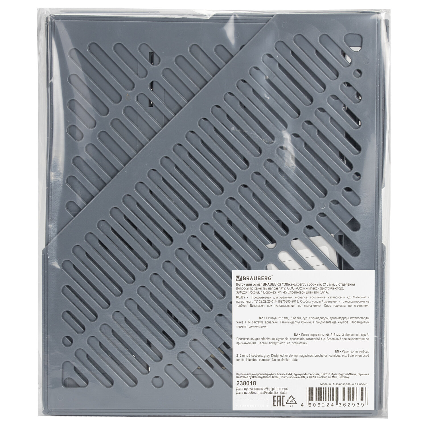 Лоток вертикальный для бумаг BRAUBERG "Office-Expert", 215 мм, 3 отделения, сборный, серый Код товара: 238018 921,09 ₽ Купить Производитель:BRAUBERG Вертикальный лоток для бумаг BRAUBERG "Office-Expert" для хранения документов позволит поддержать порядок на рабочем месте и сэкономит пространство на столе и в шкафу. Выполнен в сером цвете с тремя отделениями и с табличками для маркировки. Предназначен для хранения бумаг формата А4. Представляет собой устойчивую разборную конструкцию с сетчатыми поверхностями. Поставляется в разобранном виде. Размеры: высота - 293 мм, ширина - 215 мм, глубина - 255 мм.Производство: РоссияКоличество отделений: 3Цвет: серыйВысота лотка: 293 ммШирина лотка: 215 ммГлубина лотка: 255 ммМатериал: полистиролСерия: Office-ExpertРазборная: даКоличество в наборе: 1 шт.Таблички для маркировки: даПоставляется в разобранном виде: даУпаковка: пакетВес: 664 грРазмер упаковки: 2.5 × 29.4 × 24.4 смОбъём: 0.0025 м3Промежуточная упаковка: 24 штТранспортная упаковка: 24 штШтрих-код: 4606224362939 Файлы Сертификат-1.jpg Сертификат-2.jpg Сертификат-3.jpg Сертификат-4.jpg Сертификат-5.jpg Сертификат-6.jpg Сертификат-7.jpg Сертификат-8.jpg Сертификат-9.jpg Сертификат-10.jpg Сертификат-11.jpg Сертификат-12.jpg Сертификат-13.jpg Сертификат-14.jpg Сертификат-15.jpg Сертификат-16.jpg Сертификат-17.jpg Сертификат-18.jpg Сертификат-19.jpg Сертификат-20.jpg Сертификат-21.jpg Сертификат-22.jpg Сертификат-23.jpg Сертификат-24.jpg Сертификат-25.jpg Сертификат-26.jpg