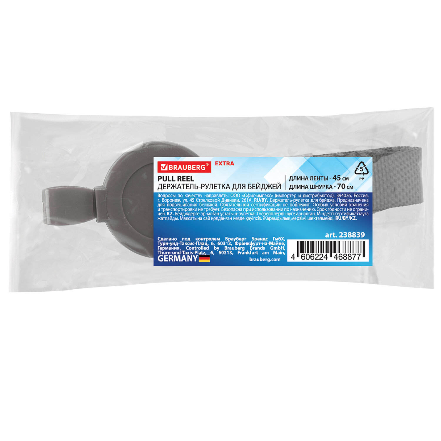 Держатель-рулетка для бейджей 70 см, с лентой 45 см, серый, BRAUBERG EXTRA Код товара: 238839 124,31 ₽ Купить Производитель:BRAUBERG Держатель-рулетка BRAUBERG предназначена для крепления бейджей, магнитных карт, пропусков и ключей. Держатель-рулетка на качественной текстильной ленте подходит для ношения бейджей на шее. Длина ленты – 45 см. Длина нити в держателе-рулетке – 70 см для Вашего максимального удобства. Для подвешивания бейджа, пропуска или ключей аккуратным движением отодвиньте нижний клип и прикрепите изделие к рулетке. Упакована в пакет с клейким краем.Производство: КитайТип держателя: держатель-рулеткаСерия: EXTRAВид крепления держателя: клипКоличество в упаковке: 1 шт.Материал: пластикДлина ленты/шнурка: 45 смДлина нити в держателе-рулетке: 70 смЦвет ленты/шнурка: серыйЦвет корпуса: серыйУпаковка: пакетВес: 20 грРазмер упаковки: 1.4 × 11.3 × 4.7 смОбъём: 0.0001 м3Промежуточная упаковка: 10 штТранспортная упаковка: 600 штШтрих-код: 4606224468877 Файлы Сертификат-1.jpg Сертификат-2.jpg Сертификат-3.jpg Сертификат-4.jpg Сертификат-5.jpg