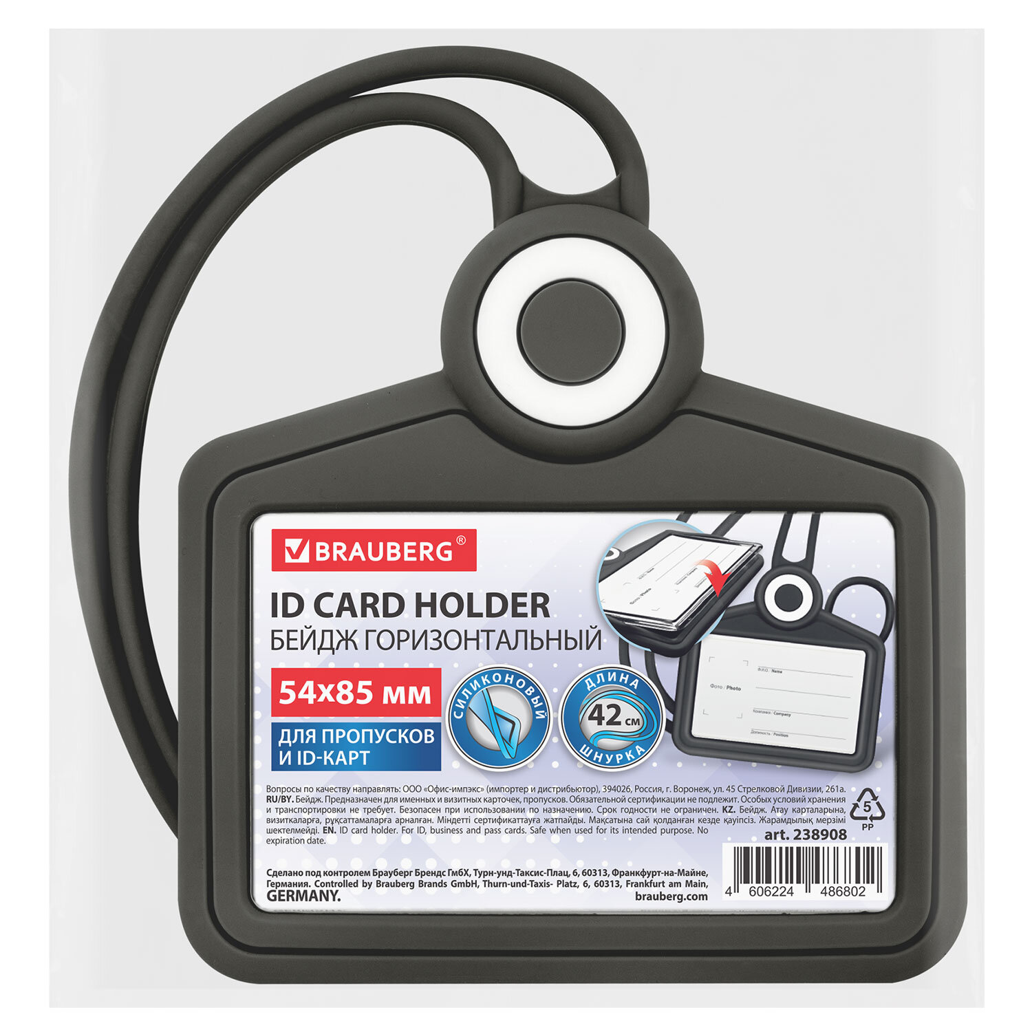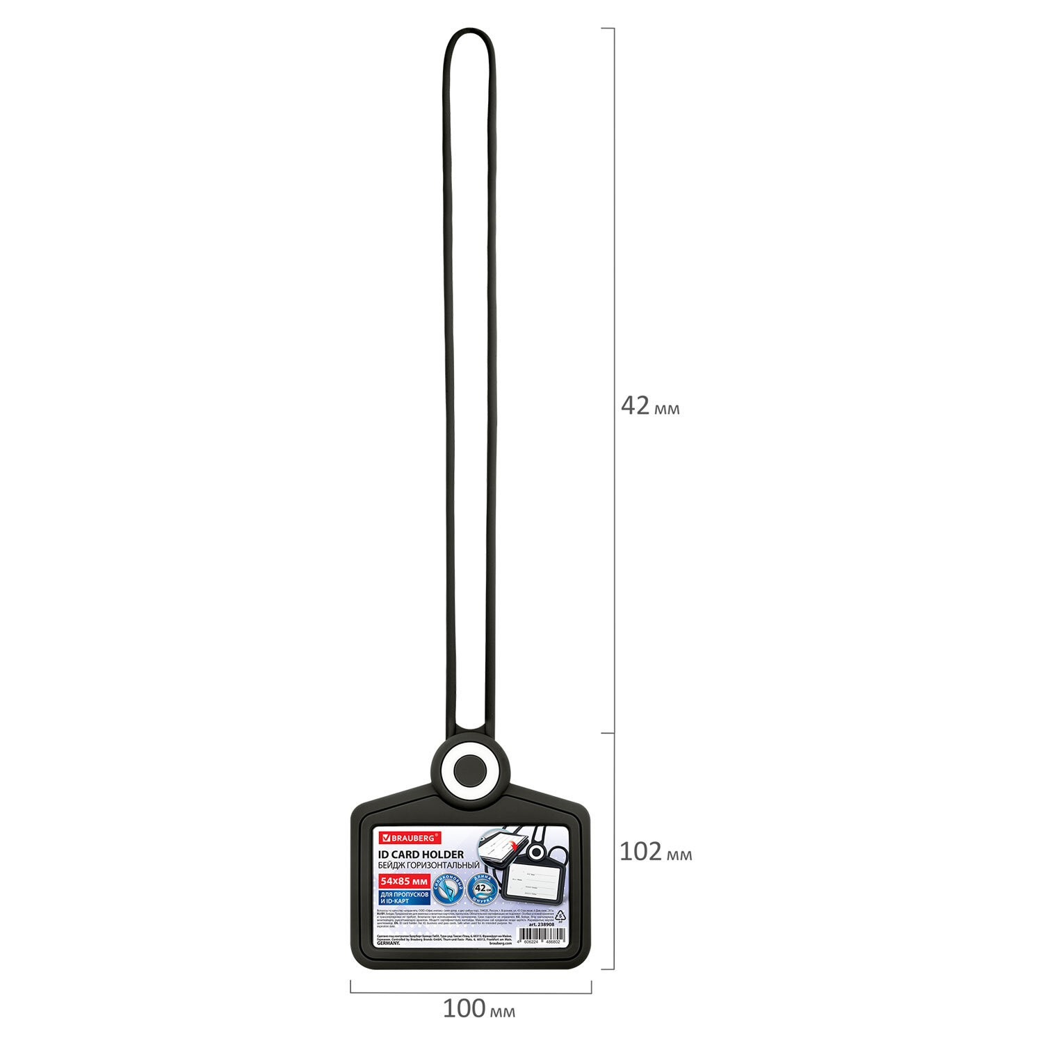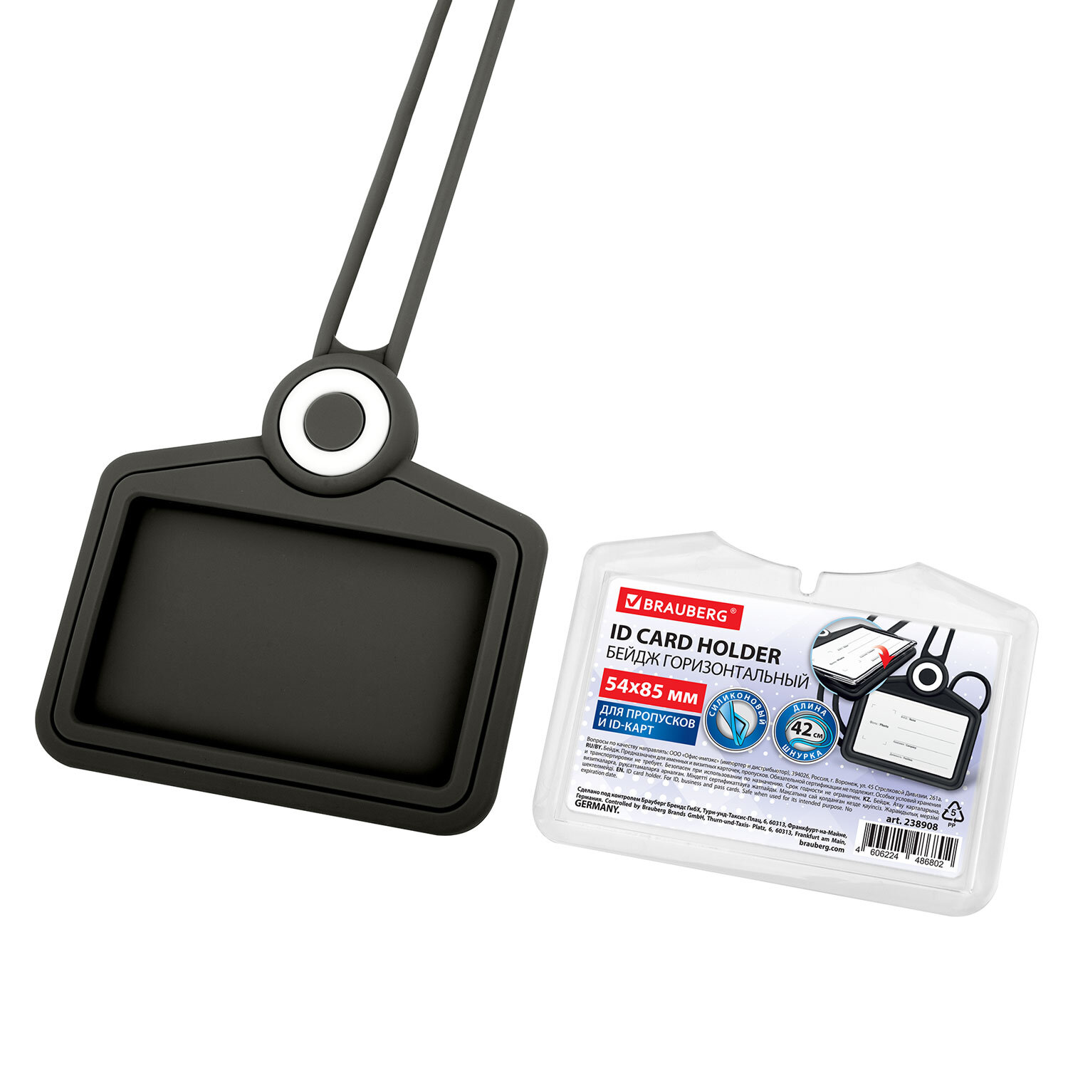 Бейдж горизонтальный для пропуска и ID-карт, СИЛИКОНОВЫЙ, 54х85 мм, шнурок 42 см, черный, BRAUBERG Код товара: 238908 269,87 ₽ Купить Производитель:BRAUBERG Горизонтальный силиконовый бейдж BRAUBERG для хранения пропусков и карточек сотрудников, ID-карт, проездных и банковских карт. Бейдж оснащен встроенной силиконовой лентой и вместительным карманом для дополнительного хранения карт на задней части. Изготовлен из приятного тактильно силикона, окошко изготовлено из высокопрозрачного акрила. Идеально подойдёт для чувствительных к механическим повреждениям магнитных карт и пропусков. Размер вкладыша – 54х85 мм. Вкладыш оснащен местом под персонализацию: фото, ФИО, наименование компании и должность.Производство: КитайТип бейджа: для проездных, пропусков, картТип крепления: лентаПоложение: горизонтальноеКоличество в комплекте: 1 шт.Размер вкладыша (ДхШ): 54х85 ммРазмер бейджа (ДхШ): 100х102 ммСерия: SiliconeЦвет крепления: черныйМатериал корпуса: силиконЦвет корпуса: черныйДлина ленты/шнурка: 42 смНаличие картонной вставки: даВес: 90 грРазмер упаковки: 2 × 10.9 × 10 смОбъём: 0.0003 м3Промежуточная упаковка: 10 штТранспортная упаковка: 200 штШтрих-код: 4606224486802 Файлы Сертификат-1.jpg Сертификат-2.jpg Сертификат-3.jpg Сертификат-4.jpg Сертификат-5.jpg Сертификат-6.jpg Сертификат-7.jpg Сертификат-8.jpg Сертификат-9.jpg Сертификат-10.jpg Сертификат-11.jpg Сертификат-12.jpg Сертификат-13.jpg Сертификат-14.jpg Сертификат-15.jpg Сертификат-16.jpg Сертификат-17.jpg Сертификат-18.jpg Сертификат-19.jpg Сертификат-20.jpg Сертификат-21.jpg Сертификат-22.jpg Сертификат-23.jpg Сертификат-24.jpg Сертификат-25.jpg Сертификат-26.jpg