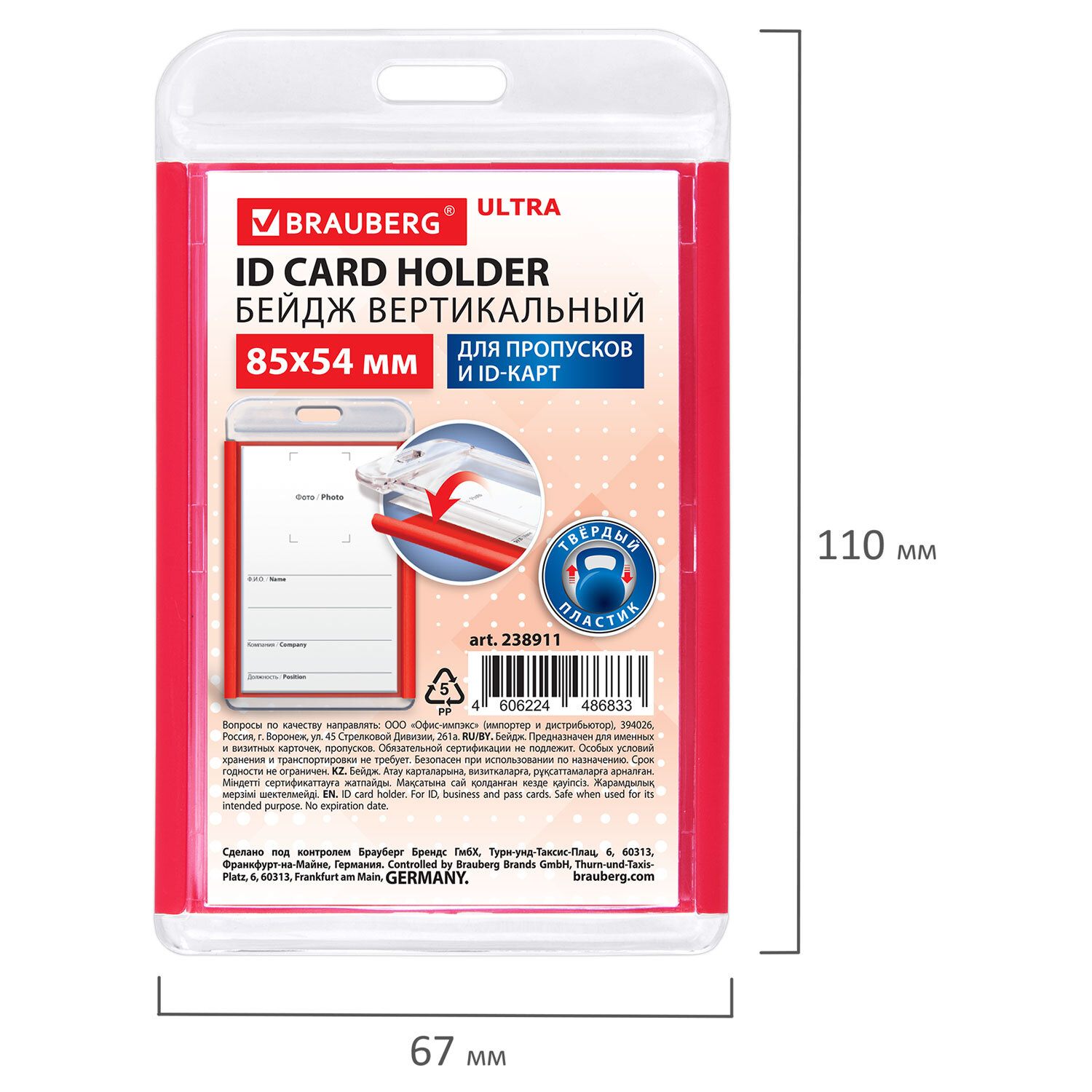 Бейдж вертикальный для пропуска и ID-карт, 85х54 мм, красный, BRAUBERG ULTRA Код товара: 238911 85,53 ₽ Купить Производитель:BRAUBERG Вертикальный бейдж BRAUBERG ULTRA для хранения пропусков и карточек сотрудников, ID-карт, проездных и банковских карт. Бейдж подходит для крепления на ленте, держателе с рулеткой. Изготовлен из высокопрочного акрила и пластика, гарантирующего его долгий срок службы. Обладает повышенной вместимостью: влезет 2 и более карт. Идеально подойдёт для чувствительных к механическим повреждениям магнитных карт и пропусков. Размер вкладыша – 85х54 мм. Вкладыш оснащен местом под персонализацию: фото, ФИО, наименование компании и должность.Производство: КитайТип бейджа: для проездных, пропусков, картТип крепления: без держателяПоложение: вертикальноеКоличество в комплекте: 1 шт.Размер вкладыша (ДхШ): 85х54 ммРазмер бейджа (ДхШ): 110х67 ммСерия: ULTRAЦвет крепления: нетМатериал корпуса: твердый пластикЦвет корпуса: красныйНаличие картонной вставки: даВес: 29 грРазмер упаковки: 0.6 × 11.1 × 6.4 смОбъём: 0.0001 м3Промежуточная упаковка: 10 штТранспортная упаковка: 400 штШтрих-код: 4606224486833 Файлы Сертификат-1.jpg Сертификат-2.jpg Сертификат-3.jpg Сертификат-4.jpg Сертификат-5.jpg Сертификат-6.jpg Сертификат-7.jpg Сертификат-8.jpg Сертификат-9.jpg Сертификат-10.jpg Сертификат-11.jpg Сертификат-12.jpg Сертификат-13.jpg Сертификат-14.jpg Сертификат-15.jpg Сертификат-16.jpg Сертификат-17.jpg Сертификат-18.jpg Сертификат-19.jpg Сертификат-20.jpg Сертификат-21.jpg Сертификат-22.jpg Сертификат-23.jpg Сертификат-24.jpg Сертификат-25.jpg Сертификат-26.jpg