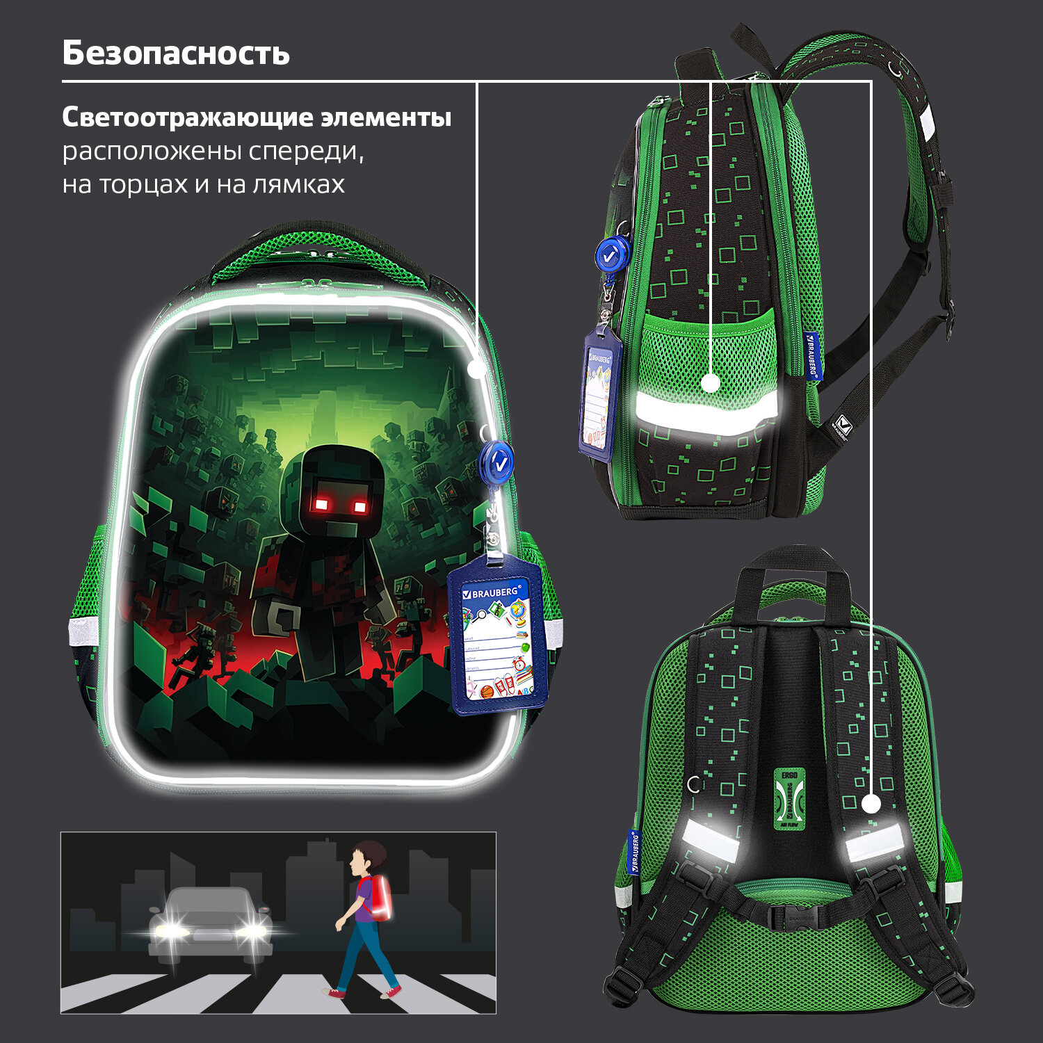 Ранец BRAUBERG FIT, 2 отделения, "Night warrior", 38х27х14 см Код товара: 272023 4 389,91 ₽ Купить Производитель:BRAUBERG Ранец BRAUBERG серии FIT изготовлен из легкого, формоустойчивого, экологичного материала EVA. Серия ранцев предназначена для учеников 7-11 лет. Ранцы имеют эргономичную вентилируемую спинку и фиксирующий нагрудный ремешок. Бейдж в комплекте. Ранцы BRAUBERG FIT протестированы НИИ гигиены и охраны здоровья детей и подростков ФГАУ "Национальный медицинский исследовательский центр здоровья детей". В рамках проведенных исследований* было установлено, что конструкции и материалы ученических ранцев соответствуют современным эргономическим требованиям и способствуют формированию здоровой осанки у школьников. Рисунок на передней панели ранца выполнен яркими неоновыми красками! Ранец покрыт высококачественной влагоотталкивающей нейлоновой тканью с приятной шелковистой поверхностью. Ткань легко чистится. Регулируемые по длине S-образные лямки можно оптимально подогнать под комплекцию ребенка, чтобы ранец носился с комфортом, несмотря на зачастую избыточный вес содержимого (учебники, тетради, канцтовары). Регулируемый в двух направлениях нагрудный ремешок с фиксатором-защелкой поможет правильно распределить нагрузку. При правильной регулировке ранец практически не будет ощущаться на плечах и не будет доставлять дискомфорт при носке. Удобная мягкая вентилируемая спинка с воздушными спонжевыми панелями разработана с учетом анатомических особенностей детей младшего школьного возраста. В процессе эксплуатации конструкция ранца позволит сохранить правильную осанку! В основном отделении ранца можно легко и быстро разместить учебники и тетради. Внутри основного отделения находится именная карточка школьника и большое отделение из сетки. Такая организация пространства поможет держать принадлежности в сохранности и приучить ребенка к порядку. Ранец широко раскрывается, повышая удобство использования, а благодаря боковым перегородкам содержимое не выскользнет из ранца. Ранец легко открывать и закрывать одной рукой с любой стороны – каждое отделение имеет долговечную реверсивную молнию с двумя металлическими бегунками. В боковых карманах на резинке можно разместить бутылочку, термос или зонт. На спинке ранца находится отделение на молнии для ценных вещей. Нести ранец будет удобно не только на плечах, но и в руке за прочную уплотненную ручку. Светоотражающие элементы ранца расположены спереди, на торцах и на лямках. Они необходимы для безопасности ребенка на дороге в темное время суток. Имеются резиновые ножки для устойчивости и защиты от загрязнений. В комплекте с ранцем поставляется бейдж для пропуска на рулетке. Для его надежной фиксации на одной из лямок ранца имеется специальное металлическое кольцо. Это очень удобно и экономит массу времени – ребенок просто прикладывает пропуск к турникету, вытягивая его на нужное расстояние, а затем рулетка автоматически возвращается его обратно. Пропуск всегда под рукой! Яркая этикетка расположена на передней стороне ранца, делая его более заметным на полке магазина, а информация в ней отражает главные потребительские свойства, помогая покупателю принять решение о покупке. Ранец упакован в плотный ПЭТ-пакет с замком Zip Lock, который сохранит качество и товарный вид при хранении и транспортир