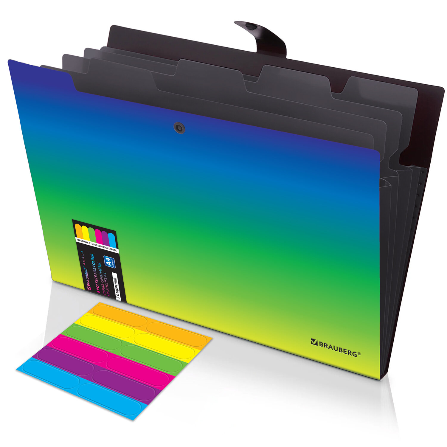 Папка-органайзер на кнопке 5 отделений, BRAUBERG GRADE, A4, зелено-голубой градиент Код товара: 274092 261,16 ₽ Купить Производитель:BRAUBERG Папка-органайзер BRAUBERG GRADE предназначена для хранения, транспортировки и систематизации ваших документов и ценных бумаг. Благодаря своей компактности и вместительности незаменима в учебе, работе, деловых поездках, командировках и путешествиях. Папка-органайзер изготовлена из качественного пластика толщиной 0,5 мм с ярким градиентным дизайном и с фактурой "песок", снабжена разделителями черного цвета. Имеет 5 отделений с ярлыками на разделителях и стикерами (в комплекте), что упрощает процесс поиска нужного документа и позволяет структурировать информацию. Удобный и надежный замок-кнопка дает возможность быстро открывать и закрывать папку, не позволяя содержимому выпасть, и защищает его от влаги, пыли и механических повреждений. Органайзер отлично подойдет для хранения личных и офисных документов, школьных тетрадей, рисунков, тетрадей для нот, курсовых работ и многого другого.Производство: КитайФормат: А4Серия: GRADEКоличество отделений: 5 шт.Фактура: песокЗастежка: КнопкаКоличество карманов: 0 шт.Толщина материала: 0.5 ммИндексные ярлычки: даВысота: 237 ммШирина: 328 ммГлубина: 16 ммМатериал: полипропиленЦвет: зелено-голубой градиентВес: 125 грРазмер упаковки: 1 × 26.5 × 33 смОбъём: 0.0007 м3Промежуточная упаковка: 24 штТранспортная упаковка: 24 штШтрих-код: 4606224514505 Файлы Сертификат-1.jpg Сертификат-2.jpg Сертификат-3.jpg Сертификат-4.jpg Сертификат-5.jpg Сертификат-6.jpg Сертификат-7.jpg Сертификат-8.jpg Сертификат-9.jpg Сертификат-10.jpg Сертификат-11.jpg Сертификат-12.jpg Сертификат-13.jpg Сертификат-14.jpg Сертификат-15.jpg Сертификат-16.jpg Сертификат-17.jpg Сертификат-18.jpg Сертификат-19.jpg Сертификат-20.jpg Сертификат-21.jpg Сертификат-22.jpg Сертификат-23.jpg Сертификат-24.jpg Сертификат-25.jpg Сертификат-26.jpg