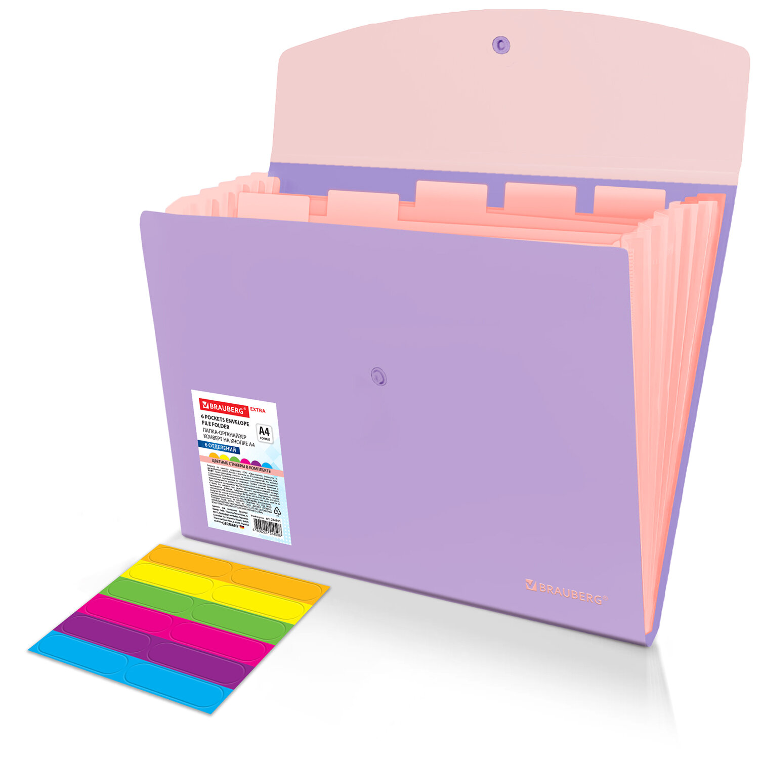 Папка-органайзер конверт на кнопке 6 отделений, BRAUBERG "Extra", A4, лиловая с персиковым Код товара: 274101 278,12 ₽ Купить Производитель:BRAUBERG Папка-органайзер BRAUBERG "Extra" предназначена для хранения, транспортировки и систематизации ваших документов и ценных бумаг. Благодаря своей компактности и вместительности незаменима в учебе, работе, деловых поездках, командировках и путешествиях. Папка-органайзер изготовлена из качественного пластика привлекательного лилового цвета толщиной 0,5 мм с фактурой "песок", снабжена разделителями персикового цвета. Имеет 6 отделений с ярлыками на разделителях и яркими стикерами (в комплекте), что существенно упрощает процесс поиска нужного документа и позволяет структурировать информацию. Удобный и надежный замок-кнопка дает возможность быстро открывать и закрывать папку, не позволяя содержимому выпасть, и защищает его от влаги, пыли и механических повреждений. Органайзер отлично подойдет для хранения паспортов, СНИЛС, свидетельств о рождении, дипломов, ИНН, офисных документов, школьных тетрадей, рисунков, тетрадей для нот, курсовых работ и многого другого.Производство: КитайФормат: А4Серия: EXTRAКоличество отделений: 6 шт.Фактура: песокЗастежка: КнопкаКоличество карманов: 0 шт.Толщина материала: 0.5 ммИндексные ярлычки: даВысота: 240 ммШирина: 330 ммГлубина: 18 ммМатериал: полипропиленЦвет: розовый/фиолетовыйВес: 125 грРазмер упаковки: 1 × 26.5 × 33 смОбъём: 0.0007 м3Промежуточная упаковка: 24 штТранспортная упаковка: 24 штШтрих-код: 4606224514598 Файлы Сертификат-1.jpg Сертификат-2.jpg Сертификат-3.jpg Сертификат-4.jpg Сертификат-5.jpg Сертификат-6.jpg Сертификат-7.jpg Сертификат-8.jpg Сертификат-9.jpg Сертификат-10.jpg Сертификат-11.jpg Сертификат-12.jpg Сертификат-13.jpg Сертификат-14.jpg Сертификат-15.jpg Сертификат-16.jpg Сертификат-17.jpg Сертификат-18.jpg Сертификат-19.jpg Сертификат-20.jpg Сертификат-21.jpg Сертификат-22.jpg Сертификат-23.jpg Сертификат-24.jpg Сертификат-25.jpg Сертификат-26.jpg