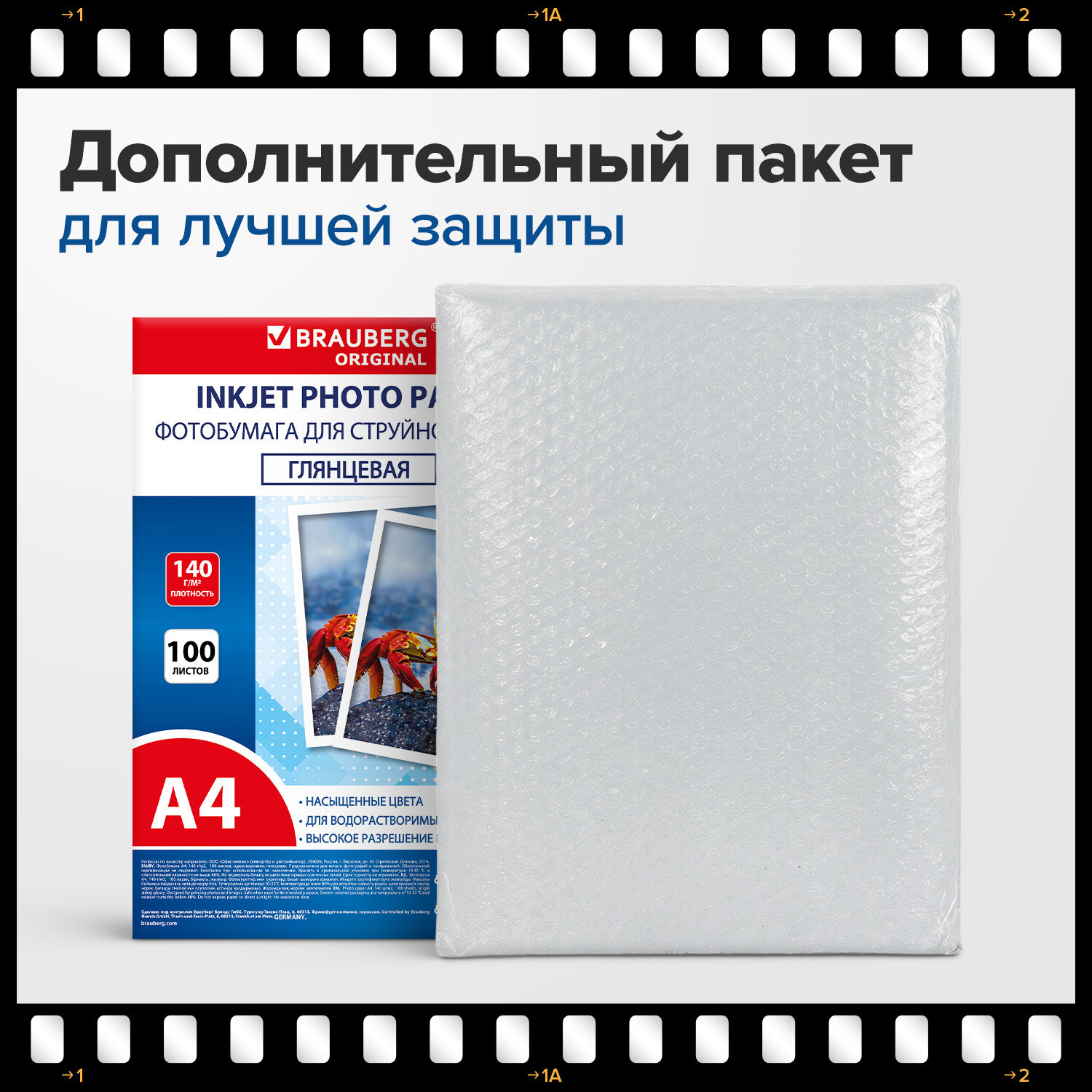 Фотобумага глянцевая, А4, 140 г/м2, односторонняя, 100 листов, ПАКЕТ, BRAUBERG ORIGINAL Код товара: 364414 609,84 ₽ Купить Производитель:BRAUBERG Глянцевая односторонняя фотобумага BRAUBERG подходит для всех типов струйных принтеров. Незаменима для печати ярких фотореалистичных изображений. Передает яркие, насыщенные цвета со множеством оттенков. Имеет формат А4 и плотность 140 г/м2, что исключает просвечивание изображения. Гладкая поверхность обеспечивает превосходное качество, а особый состав – идеальную цветопередачу. Печать возможна только водорастворимыми чернилами. Поставляется по 100 листов в плотном пузырчатом пакете, защищающем бумагу от механических повреждений при доставке.Производство: КитайФормат: А4Тип поверхности: глянцеваяПлотность: 140 г/м2Серия: ORIGINAL PLUSТехнология печати: для струйной печатиКоличество листов в упаковке: 100 шт.Вес: 973 грРазмер упаковки: 2.1 × 30.4 × 23.3 смОбъём: 0.0023 м3Промежуточная упаковка: 14 штТранспортная упаковка: 14 штШтрих-код: 4606224459219 Файлы Сертификат-1.jpg Сертификат-2.jpg Сертификат-3.jpg Сертификат-4.jpg Сертификат-5.jpg Сертификат-6.jpg Сертификат-7.jpg Сертификат-8.jpg Сертификат-9.jpg Сертификат-10.jpg Сертификат-11.jpg Сертификат-12.jpg Сертификат-13.jpg Сертификат-14.jpg Сертификат-15.jpg Сертификат-16.jpg Сертификат-17.jpg Сертификат-18.jpg Сертификат-19.jpg Сертификат-20.jpg Сертификат-21.jpg Сертификат-22.jpg Сертификат-23.jpg Сертификат-24.jpg Сертификат-25.jpg Сертификат-26.jpg