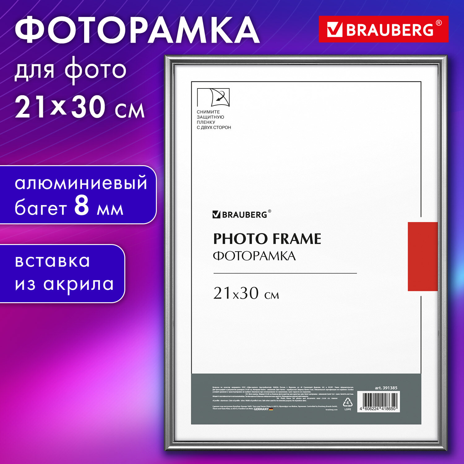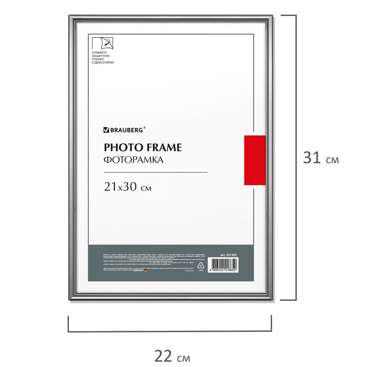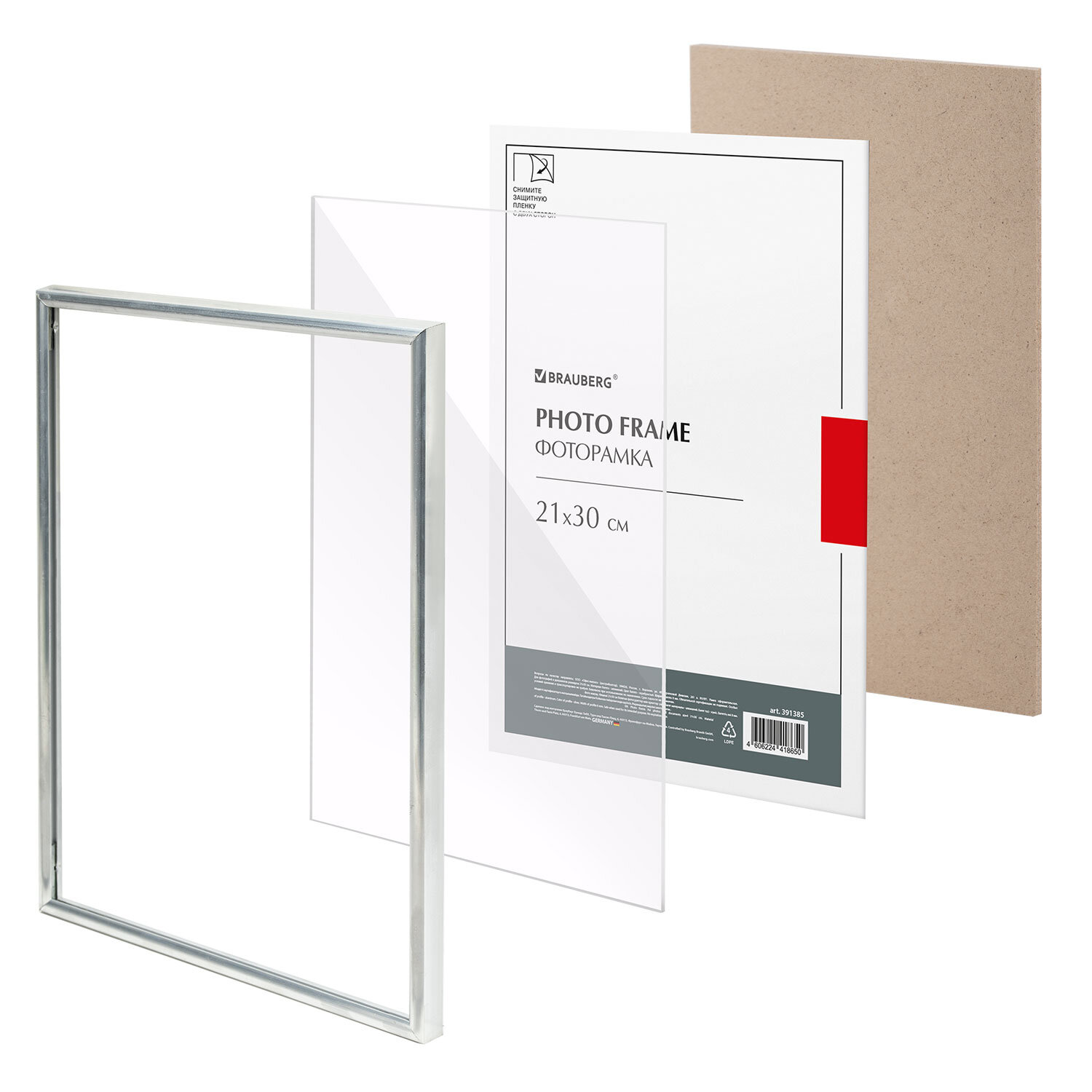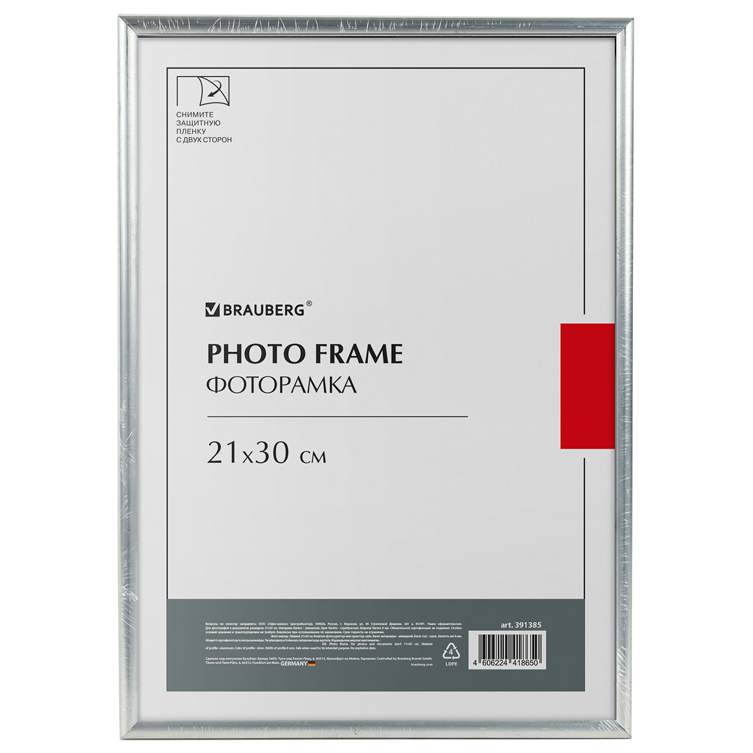 Рамка 21х30 см небьющаяся, багет 8 мм, МЕТАЛЛ, BRAUBERG "Blade", серебристая Код товара: 391385 654,05 ₽ Купить Производитель:BRAUBERG Рамка BRAUBERG "Blade" для фотографий, дипломов, сертификатов, грамот и других ценных документов будет гармонично смотреться как в офисном интерьере, так и в салонах, магазинах, на предприятиях и в других учреждениях. Рамка стандартного формата А4 (21х30 см) выполнена алюминия в серебристом цвете, за счет чего отлично впишется как в интерьер любого делового помещения, а также и в домашний интерьер, например, в стиле "лофт". Имеется возможность вертикального и горизонтального подвеса с помощью зажимов на рамке, а также имеется подставка для установки рамки на столе. Ширина багета - 8 мм, высота - 14 мм. Аккуратный вид достигается благодаря стеклянной вставке. Задняя панель выполнена из плотного МДФ, который обеспечивает плотное прилегание и отсутствие в будущем деформации содержимого в рамке. Рамка поставляется в термоусадочной плёнке, которая гарантирует ее сохранность при транспортировке, отсутствие сколов и потертостей. ВНИМАНИЕ! На данный момент производится перевод данного артикула со стекла на пластиковую вставку. На переходный период допускается поставка данной продукции как со стеклом, так и с пластиком.Производство: РоссияРазмер: 21х30 смНазначение: для фотографий, для дипломов, сертификатов, грамот, для студийных и оформительских работСерия: BladeДизайн: СовременныйМатериал рамки: алюминийЦвет рамки: серебристыйВозможность размещения: вертикальное, горизонтальноеПодставка для установки на столе: даШирина багета: 8 ммМатериал вставки: стекло/пластиковая вставкаМатериал подложки: МДФУпаковка: термоусадочная пленкаВес: 513 грРазмер упаковки: 1.5 × 31 × 22.1 смОбъём: 0.0013 м3Промежуточная упаковка: 10 штТранспортная упаковка: 10 штШтрих-код: 4606224418650 Файлы Сертификат-1.jpg Сертификат-2.jpg Сертификат-3.jpg Сертификат-4.jpg Сертификат-5.jpg Сертификат-6.jpg Сертификат-7.jpg Сертификат-8.jpg Сертификат-9.jpg Сертификат-10.jpg Сертификат-11.jpg Сертификат-12.jpg Сертификат-13.jpg Сертификат-14.jpg Сертификат-15.jpg Сертификат-16.jpg Сертификат-17.jpg Сертификат-18.jpg Сертификат-19.jpg Сертификат-20.jpg Сертификат-21.jpg Сертификат-22.jpg Сертификат-23.jpg Сертификат-24.jpg Сертификат-25.jpg Сертификат-26.jpg