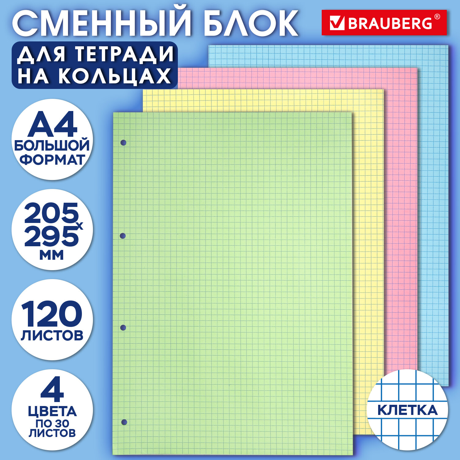 Сменный блок к тетради на кольцах БОЛЬШОЙ ФОРМАТ А4, 120 л., BRAUBERG, (4 цвета по 30 листов) Код товара: 404519 167,12 ₽ Купить Производитель:BRAUBERG Сменный блок BRAUBERG предназначен для письма гелевыми, шариковыми, капиллярными и перьевыми ручками. Универсальная перфорация на 4 отверстия. Сменный блок подходит для всех тетрадей на 4 кольцах формата А4. Внутри – 120 листов офсетной бумаги плотностью 60 г/м2 с линовкой в клетку без полей. Листы представлены в четырех цветах – розовом, желтом, голубом и зеленом (по 30 листов каждого), что позволяет выбирать оттенок под настроение.Производство: РоссияФормат: А4Тип товара: сменный блокОбщее количество листов: 120Вид бумаги: офсетПлотность бумаги: 60 г/м2Вид линовки: клеткаЦвет сменного блока: ассортиТермоупаковка: даВес: 447 грРазмер упаковки: 0.8 × 29.3 × 20.2 смОбъём: 0.0007 м3Промежуточная упаковка: 20 штТранспортная упаковка: 20 штШтрих-код: 4606224380728 Файлы Сертификат-1.jpg Сертификат-2.jpg Сертификат-3.jpg Сертификат-4.jpg Сертификат-5.jpg Сертификат-6.jpg Сертификат-7.jpg