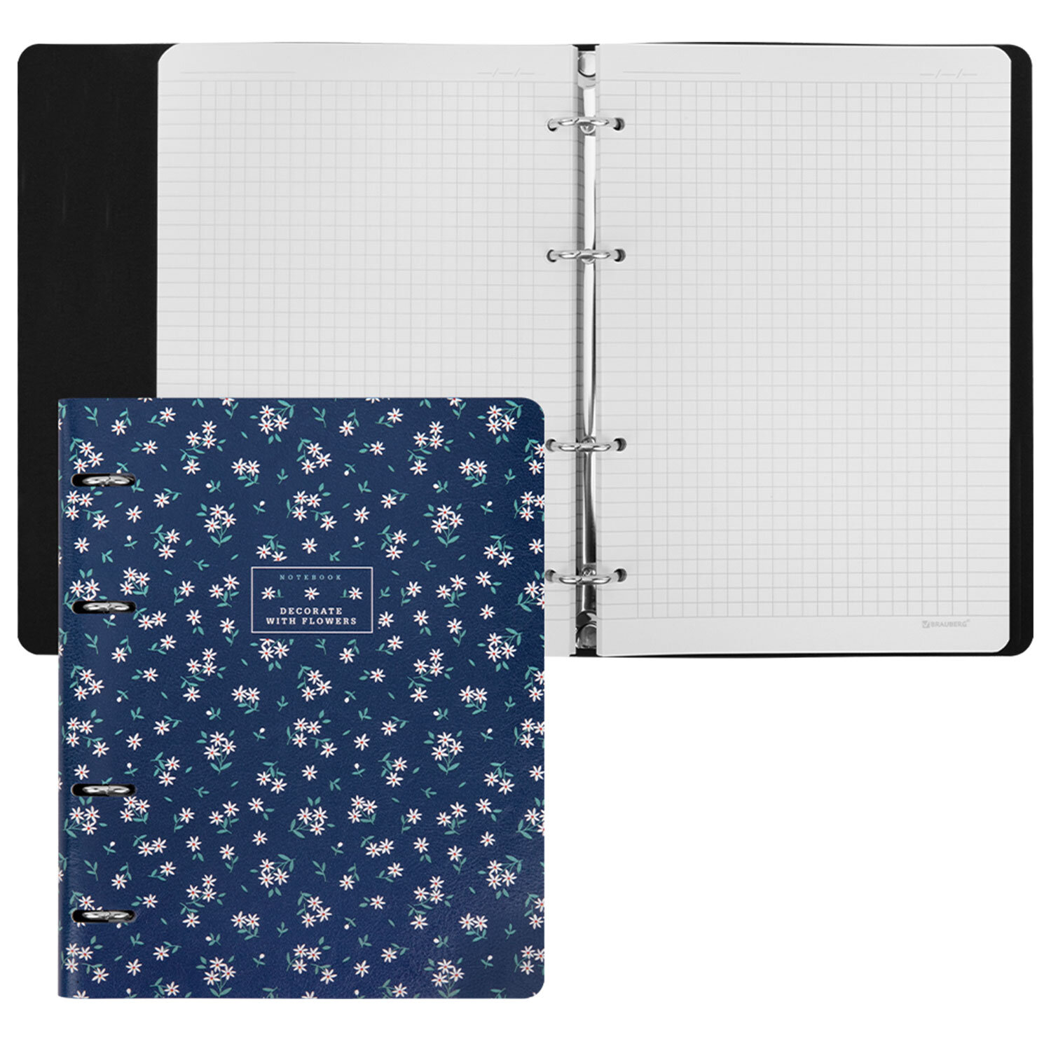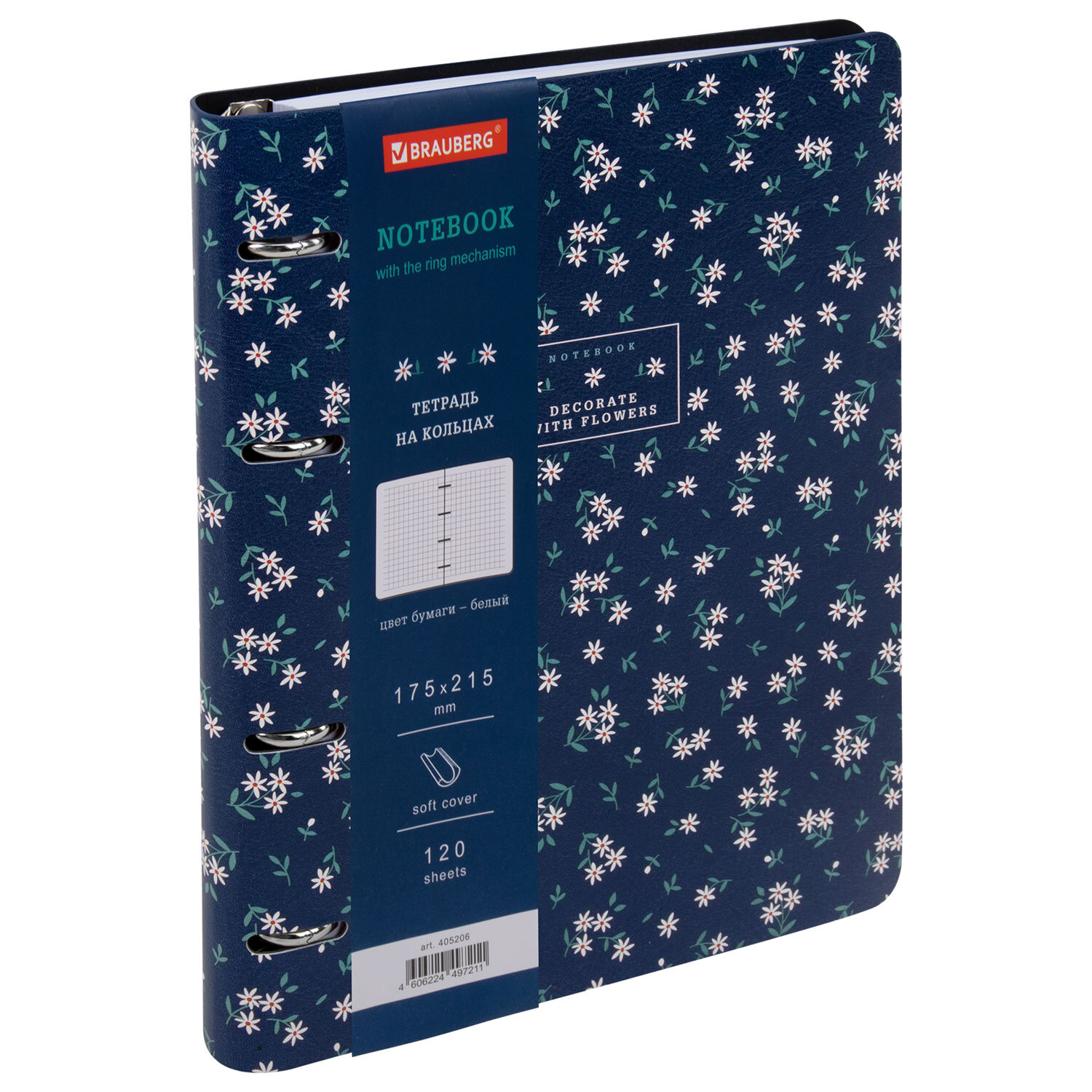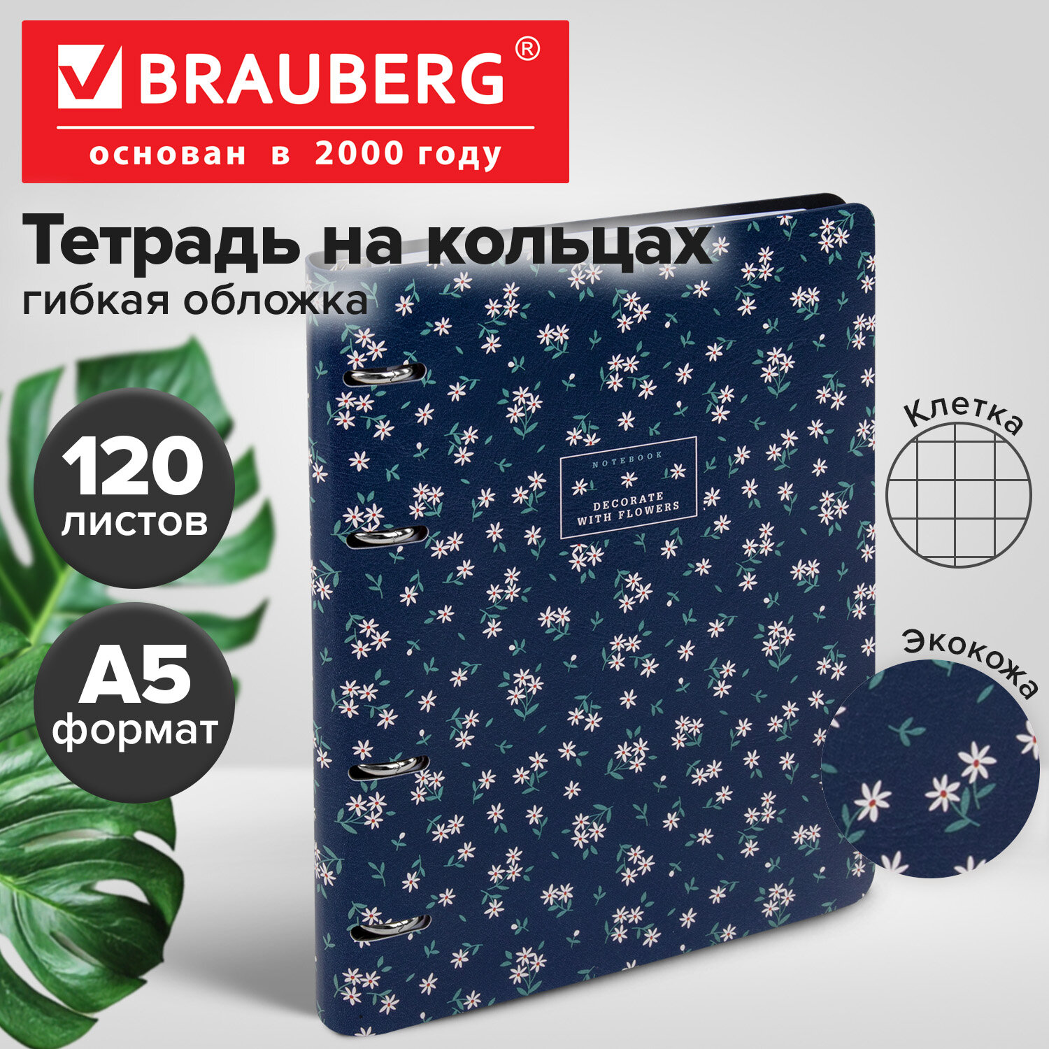 Тетрадь на кольцах А5, 175х215 мм, 120 л., под кожу, BRAUBERG VISTA, "Цветочный паттерн" Код товара: 405206 513,42 ₽ Купить Производитель:BRAUBERG Тетрадь на кольцах BRAUBERG – это идеальный вариант для тех, кто ценит практичные и элегантные вещи. Блок состоит из 120 листов офсетной бумаги белого цвета плотностью 70 г/м2. Кольцевой механизм с 4-мя кольцами позволяет пользоваться сменным блоком в 120 листов. Линовка – клетка с полями. Мягкая интегральная обложка с вырубкой под кольца выполнена из износоустойчивого материала с текстурой под гладкую кожу. Формат А5 удобно носить в рюкзаке или сумке, что позволит брать на учебу или работу всего одну тетрадь с возможностью добавлять и менять листы. Полезный диаметр колец – 20 мм.Производство: КитайКоличество листов: 120Тип обложки: экокожаФормат: А5Внутренний блок: офсетПлотность внутреннего блока: 70 г/м2Серия: VistaДизайн: Цветочный паттернЦвет обложки: с дизайномБелизна: 100 %Цвет внутреннего блока: белыйТип скрепления: четырехкольцевой механизмВид линовки: клеткаНаличие полей: даДлина: 215 ммШирина: 175 ммТолщина: 25 ммИндивидуальная упаковка: даВес: 380 грРазмер упаковки: 2.9 × 21.8 × 17.5 смОбъём: 0.0009 м3Промежуточная упаковка: 30 штТранспортная упаковка: 30 штШтрих-код: 4606224497211 Сертификат-1.jpg Сертификат-2.jpg Сертификат-3.jpg