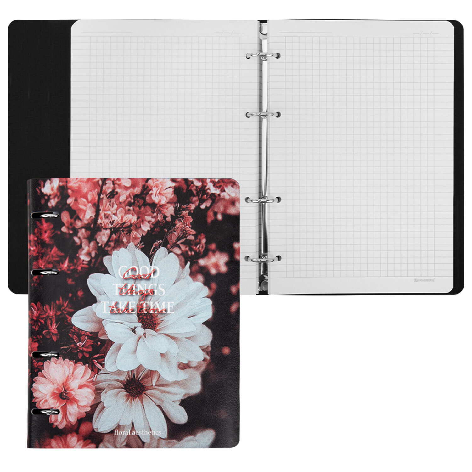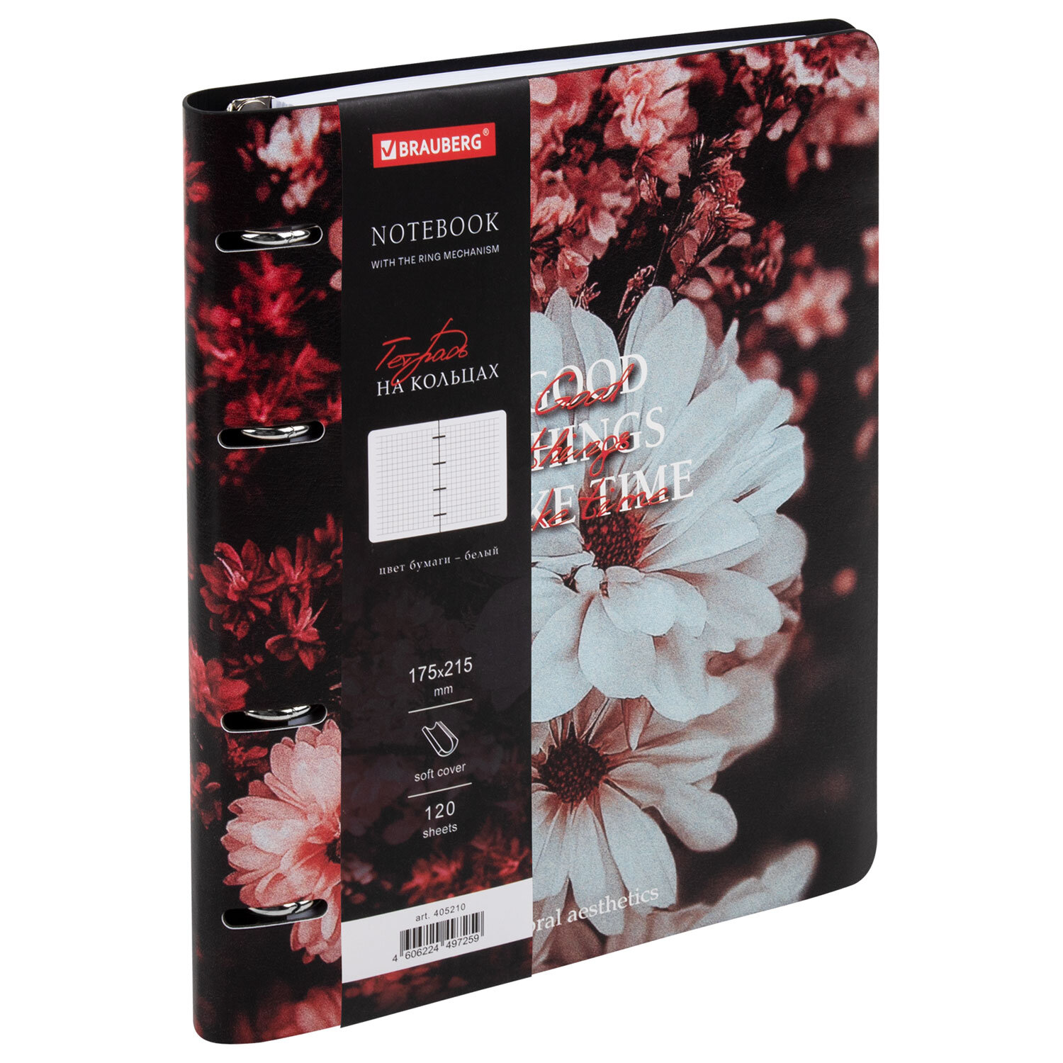 Тетрадь на кольцах А5, 175х215 мм, 120 л., под кожу, BRAUBERG VISTA, "Цветы" Код товара: 405210 513,42 ₽ Купить Производитель:BRAUBERG Тетрадь на кольцах BRAUBERG – это идеальный вариант для тех, кто ценит практичные и элегантные вещи. Блок состоит из 120 листов офсетной бумаги белого цвета плотностью 70 г/м2. Кольцевой механизм с 4-мя кольцами позволяет пользоваться сменным блоком в 120 листов. Линовка – клетка с полями. Мягкая интегральная обложка с вырубкой под кольца выполнена из износоустойчивого материала с текстурой под гладкую кожу. Формат А5 удобно носить в рюкзаке или сумке, что позволит брать на учебу или работу всего одну тетрадь с возможностью добавлять и менять листы. Полезный диаметр колец – 20 мм.Производство: КитайКоличество листов: 120Тип обложки: экокожаФормат: А5Внутренний блок: офсетПлотность внутреннего блока: 70 г/м2Серия: VistaДизайн: ЦветыЦвет обложки: с дизайномБелизна: 100 %Цвет внутреннего блока: белыйТип скрепления: четырехкольцевой механизмВид линовки: клеткаНаличие полей: даДлина: 215 ммШирина: 175 ммТолщина: 25 ммИндивидуальная упаковка: даВес: 381 грРазмер упаковки: 2.8 × 21.7 × 17.4 смОбъём: 0.0009 м3Промежуточная упаковка: 30 штТранспортная упаковка: 30 штШтрих-код: 4606224497259 Сертификат-1.jpg Сертификат-2.jpg Сертификат-3.jpg