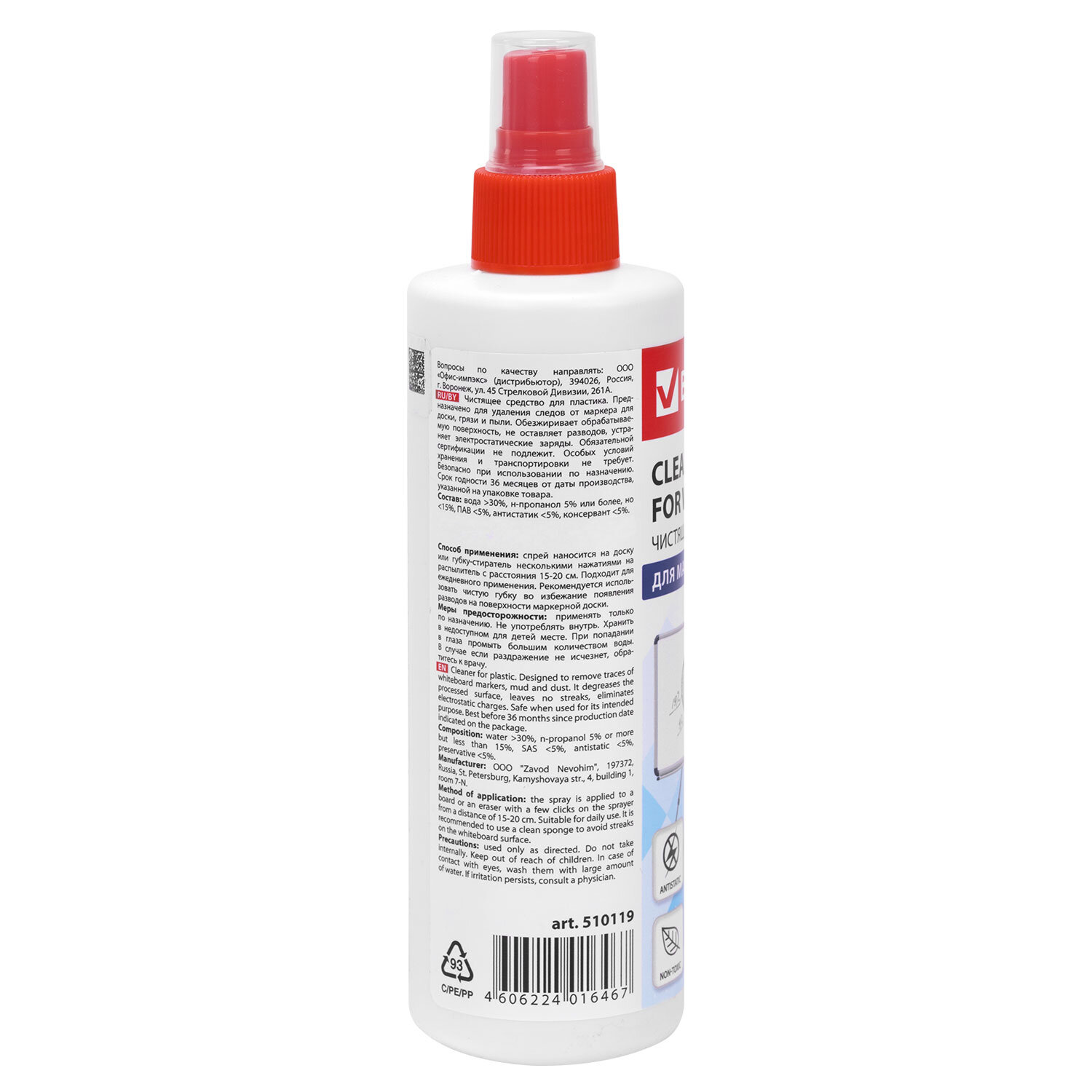 Чистящая жидкость-спрей для маркерных досок BRAUBERG, 250 мл Код товара: 510119 159,51 ₽ Купить Производитель:BRAUBERG Чистящая жидкость-спрей BRAUBERG предназначена для очистки поверхности маркерных досок. Удаляет следы сухого маркера, пыли, отпечатков пальцев и других загрязнений, а также дезинфицирует поверхность. Спрей имеет объем 250 мл. Подходит для ежедневного применения. Обладает антистатическим эффектом. Рекомендуется к использованию вместе с сухими стирающими салфетками.Производство: РоссияТип: чистящая жидкость-спрейОбъем: 250 млАнтистатический эффект: даУпаковка: пластиковая тубаСрок годности: 36 месВес: 279 грРазмер упаковки: 19.3 × 5.1 × 5.1 смОбъём: 0.0006 м3Промежуточная упаковка: 24 штТранспортная упаковка: 24 штШтрих-код: 4606224016467 Сертификат-1.jpg Сертификат-2.jpg