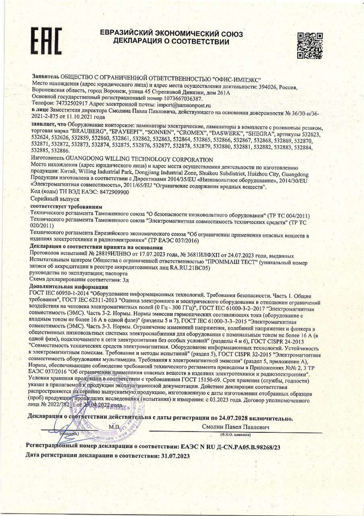 Ламинатор BRAUBERG SILVER MAX A4, толщина пленки 60-200 мкм, скорость 32 см/мин. Код товара: 532624 3 499,61 ₽ Купить Производитель:BRAUBERG Ламинатор BRAUBERG SILVER MAX A4 идеально подходит для использования как в офисе, так и дома. Предназначен для ламинирования документов, меню, рисунков, фотографий. Данная модель обладает широким диапазоном используемых пленок, что обычно характерно для высокотехнологичных и дорогостоящих моделей ламинаторов, однако BRAUBERG SILVER MAX A4 можно приобрести при значительно более доступной цене. Способен заламинировать документы различных размеров – от визитки до листа формата А4. Прогревается за 3 минуты. Ламинирует 1 документ формата А4 в пакетах 2х60, 2x75, 2x80, 2x100, 2х125, 2х150, 2х175 и 2х200 мкм за 55 секунд. Кроме горячего ламинирования, данная модель оснащена также функцией холодного ламинирования. Функция антизамятия реализуется рычагом разжима валов, расположенным с обратной стороны ламинатора, то есть пользователю нужно одной рукой удерживать рычаг с обратной стороны устройства, а второй рукой потянуть замятый лист на себя. Для включения ламинатора переместите выключатель, который расположен на правой боковой панели, из положения "O" в положение "I". На рабочей панели подписан каждый режим для соответствующего диапазона пленок. Легко можно переключать температуру нагрева с помощью кнопки, расположенной под индикаторами. О готовности ламинатора к использованию укажет световой индикатор, который перестанет моргать и загорится зеленым. Для поддержки ламинируемого документа ламинатор BRAUBERG SILVER MAX A4 оснащен удобным лотком. Напоминаем, что подача документа у данной модели происходит с задней стороны устройства. Для удобства мы указали направление загрузки документа черной стрелкой на лотке подачи документов. Размер – 70х340х130 мм. Вес нетто – 1,23 кг. Комплектация: - ламинатор; - лоток для подачи документов; - руководство пользователя; - гарантийный талон.Производство: КитайМаксимальный формат ламинирования: А4Тип ламинатора: пакетныйТип ламинирования: горячее, холодноеМакс. толщина пленки: 200 мкмМакс. толщина документа: 0.5 ммВремя нагрева: 180 секундСерия: SILVER MAXКоличество валов: 2 шт.Регулировка температуры: даСкорость ламинирования: 32 см/мин.Индикация о готовности к работе: даФункция разжима валов: даЛаминирование фотографий: даЦвет: белыйВысота: 70 ммШирина: 340 ммДлина: 130 ммВес: 1.23 кгРазмер упаковки: 9.5 × 39 × 15.1 смОбъём: 0.0074 м3Промежуточная упаковка: 4 штТранспортная упаковка: 4 штШтрих-код: 4606224367484 Файлы Сертификат-1.jpg Сертификат-2.jpg Сертификат-3.jpg