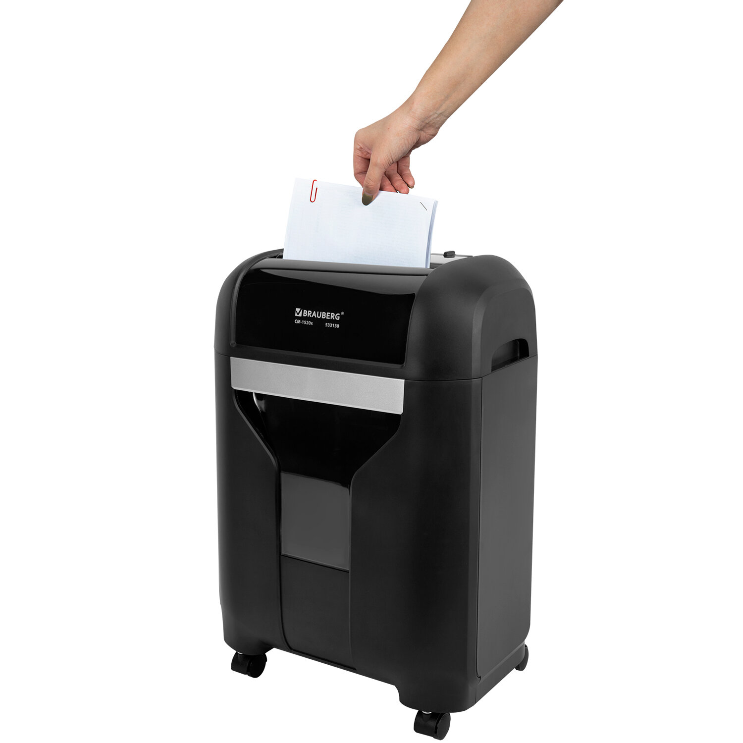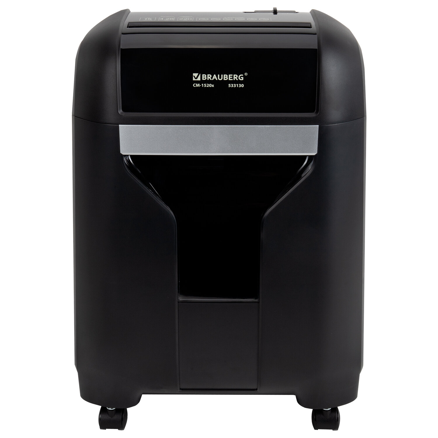 Уничтожитель (шредер) BRAUBERG PROFESSIONAL CM-1520x, "Heavy Duty", 4 уровень секретности, 4х28 мм, 15 листов, корзина 20 литров Код товара: 533130 12 652,58 ₽ Купить Производитель:BRAUBERG Бесшумный уничтожитель документов (шредер) BRAUBERG PROFESSIONAL CM-1520x с улучшенным рабочим циклом предназначен для уничтожения документов и пластиковых карт (банковских, дисконтных и прочих), потерявших актуальность. Отлично подходит для интенсивного персонального или коллективного использования в среднем офисе. Резка на фрагменты размером 4х28 мм обеспечивает P-4 уровень секретности (DIN 66399). Устройство надежно уничтожит бумажные документы и компакт-диски с очень уязвимыми и конфиденциальными данными, а также персональными данными. Рекомендуемое количество пользователей – от 3 до 5. За один раз уничтожает 15 листов формата А4 и 1 компакт-диск. Объем корзины составляет 20 л. Благодаря технологии "Heavy Duty" устройство может работать до 20 минут без перерыва. Уничтожитель BRAUBERG CM-1520x снабжен надежными ножами, способными уничтожать не только бумагу, а также пластиковые карты. Шредер также оснащен защитой двигателя от перегрева, что крайне важно для подобных устройств. Для удобства отслеживания наполняемости корзины отходами в ней предусмотрено прозрачное смотровое окошко. Комплектация: уничтожитель, руководство пользователя, гарантийный талон.Производство: КитайУровень секретности (DIN 66399): P-4Область применения: офисныйВозможности уничтожения: бумаги А4 (80 г/м2), пластиковых картРекомендуемое кол-во пользователей: 3-5Тип резки: перекрестнаяКоличество уничтожаемых листов: 15 А4Резка бумаги на полоски / фрагменты размером: 4х28 ммВремя непрерывной работы: 20 минВремя перерыва: 50 минСредняя скорость резки: 1.8 м/минОбъем приемной корзины: 20 литр.Ширина входного отверстия: 220 ммУровень шума: 58 дБАвтостарт: даРеверс: даБесшумный: даИндикатор перегрева двигателя: даКомплектуется колесиками: даВысота: 52.5 смШирина: 34 смГлубина: 22.5 смМатериал корпуса: пластикЦвет: черныйВес: 7.9 кгРазмер упаковки: 48.7 × 42.2 × 30.5 смОбъём: 0.0627 м3Промежуточная упаковка: 1 штТранспортная упаковка: 1 штШтрих-код: 4606224484815 Сертификат-1.jpg Сертификат-2.jpg Сертификат-3.jpg
