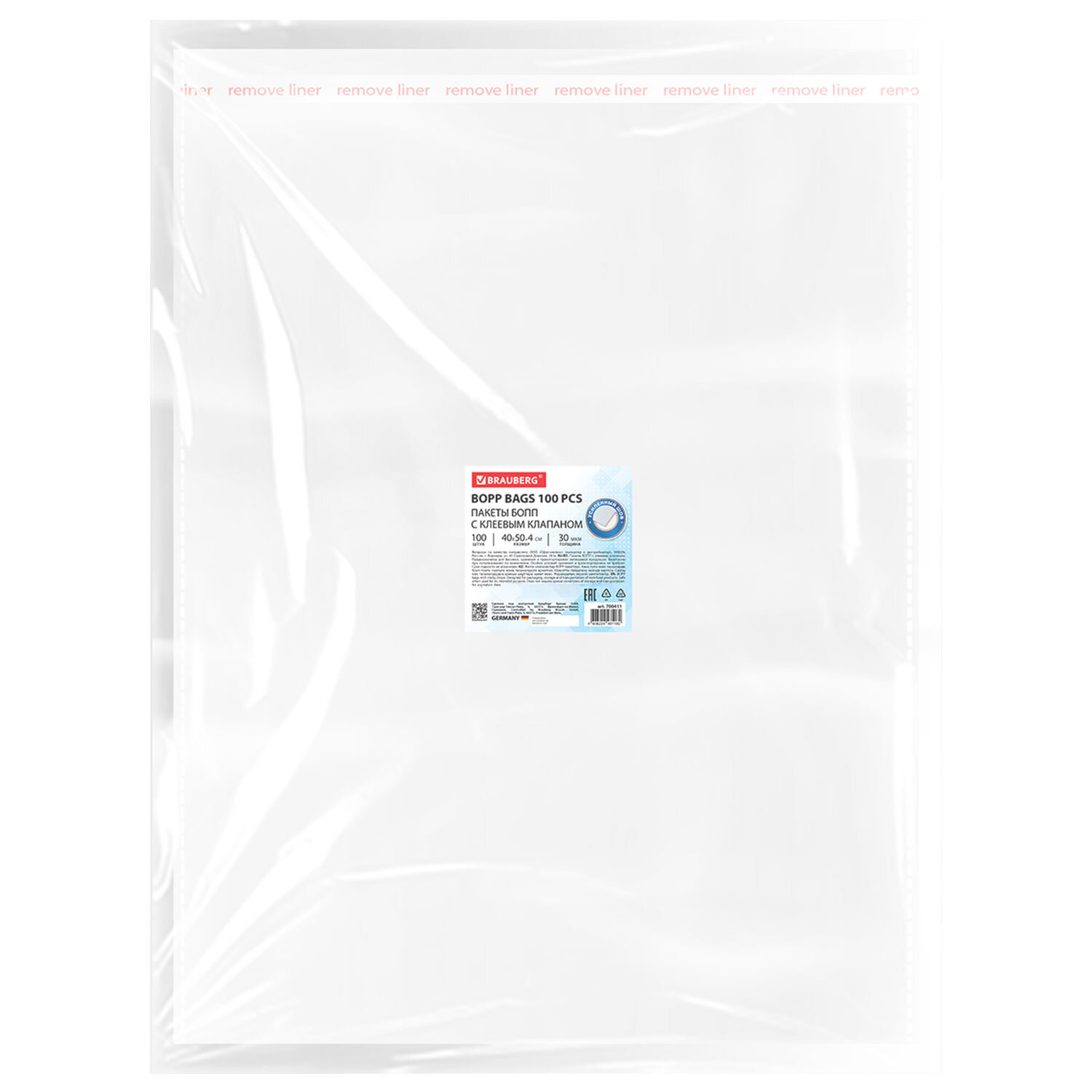 Пакеты БОПП с клеевым клапаном КОМПЛЕКТ 100 штук, 40х50+4 см, 30 мкм, с усиленным швом, BRAUBERG Код товара: 700411 715,1 ₽ Купить Производитель:BRAUBERG Пакеты БОПП BRAUBERG – это идеальное решение для упаковки. Они обеспечивают надежную защиту содержимого, сохраняя свежесть и привлекательный внешний вид. Пакеты БОПП BRAUBERG выполнены из полипропилена, который сочетает в себе высокую прочность, отличную прозрачность и влагостойкость. Благодаря пакетам БОПП вы сможете подчеркнуть эстетику продукта, делая упаковку более привлекательной. Они отлично защищают содержимое от влаги и пыли, сохраняя качество товара. Удобный клеевой клапан позволит легко и быстро упаковать все необходимое. Усиленный шов на пакете предотвращает его от разрывов и делает упаковку более надежной. Размер: 40х50 см; Клеевой клапан: 40х4 см; Толщина: 30 мкм; Количество: 100 штук.Производство: КитайТип товара: пакеты БОППРазмер: 40х50 смТолщина: 30 мкмКоличество в комплекте: 100 шт.Материал: БОППОсобенности: клеевой крайТип упаковки: пакетВес: 1,21 кгРазмер упаковки: 1.1 × 55.1 × 41.9 смОбъём: 0.0019 м3Промежуточная упаковка: 20 штТранспортная упаковка: 20 штШтрих-код: 4606224481180 Файлы Сертификат-1.jpg Сертификат-2.jpg Сертификат-3.jpg