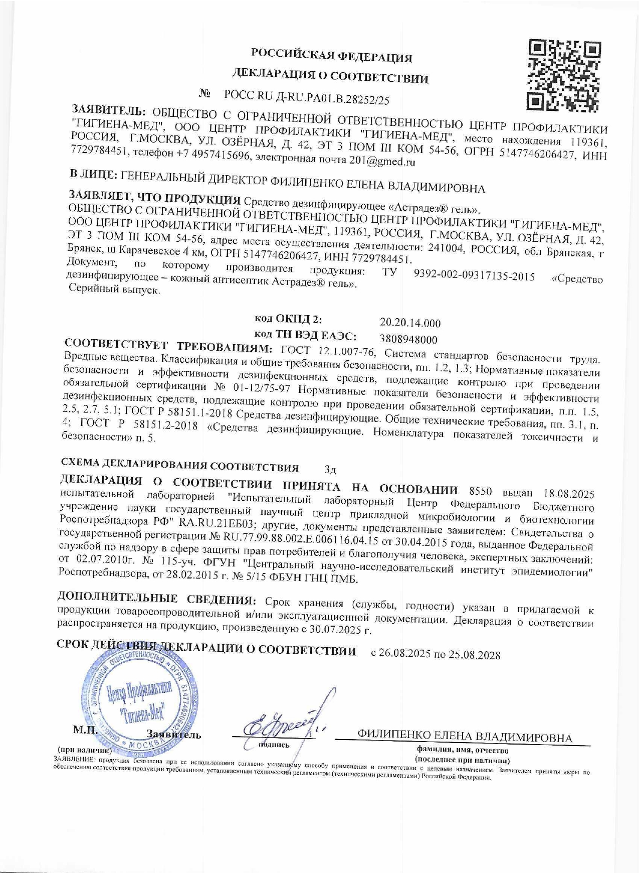 - Наличие СГР на дез. средство (кожный антисептик): да