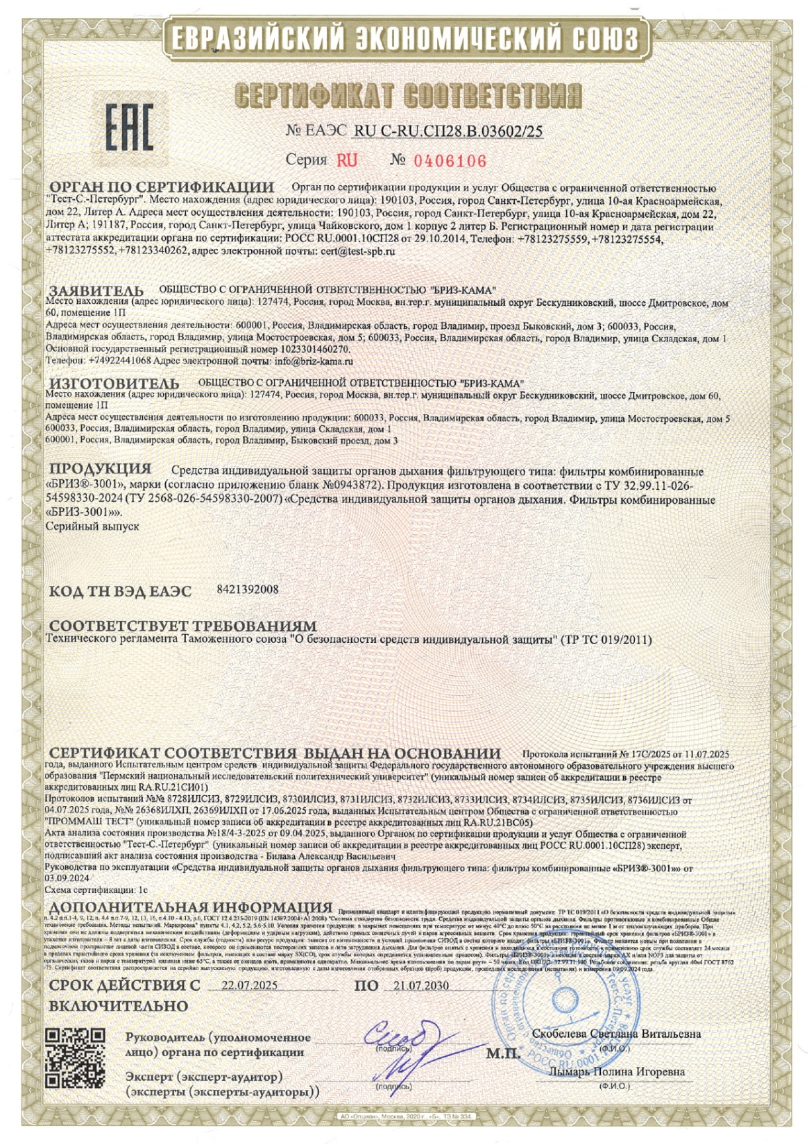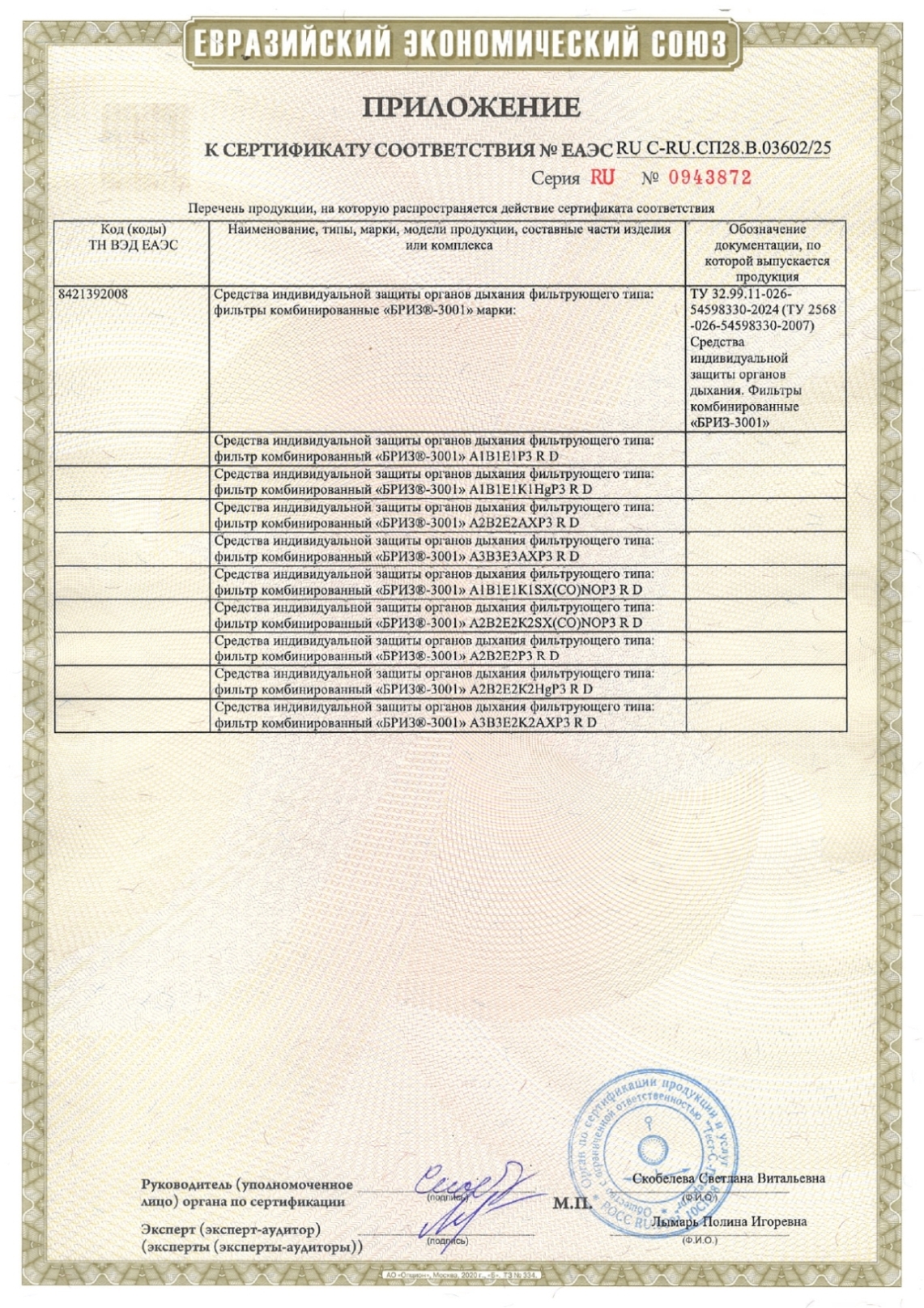 Фильтр противогазовый комбинированный БРИЗ-3001, класса А2В2Е2К2HgР3 Код товара: 610958 1 657,71 ₽ Купить Производитель:Бриз-Кама Фильтр БРИЗ-3001 А2В2Е2К2HgР3 предназначен для использования совместно с масками серии БРИЗ-4301 (ППМ) или лицевыми частями ШМП-1 в составе противогаза БРИЗ-3301 (ППФ) и любыми другими лицевыми частями с соединительной резьбой по ГОСТ 8762-75. Фильтр комбинированный серии БРИЗ-3001 A2B2E2K2HgP3 R D применяется для очистки вдыхаемого загрязненного воздуха от: 1) паров и газов органических веществ с температурой кипения выше 65 °С (циклогексан, бензол, ксилол, толуол, ацетонитрил, нитробензол, тетраэтилсвинец, фенол, фурфурол); 2) неорганических веществ (галогены, сероводород, синильная кислота, хлорциан, сероуглерод и др. кроме оксида углерода); 3) кислых газов и паров (диоксид серы, хлорид водорода, фосфин, арсин); 4) аммиака и его органических производных; 5) паров ртути; 6) аэрозолей (пыль, дым, туман). Время защитного действия: 1) по циклогексану при С0=17500 мг/м3 – 35 минут; 2) по хлору при С0=15000 мг/м3 – 20 минут; 3) по сероводороду при С0=7100 мг/м3 – 40 минут; 4) по циановодороду при С0=5600 мг/м3 – 25 минут; 5) по диоксиду серы при С0=13300 мг/м3 – 20 минут; 6) по аммиаку при С0=3500 мг/м3 – 40 минут; 7) по парам ртути при концентрации 13+1,0 мг/м3 – 6000 минут. Соответствует – ТР ТС 019/2011 и ТУ 2568-022-54598330-2006.Производство: РоссияТип товара: расходные материалыВид: фильтрСтепень защиты до: органические газы и пары с t кипения >65°C [A], неорганические газы и пары, кроме CO [B], кислые газы и пары [E], аммиак и его производные [K], ртуть и ее соединения [Hg], аэрозоли [P]Класс фильтра: А2В2Е2К2HgР3 R DСоответствие стандартам: ТР ТС 019/2011 и ТУ 2568-022-54598330-2006.Количество в упаковке: 1 шт.Способ крепления: резьбовойВес: 552 грРазмер упаковки: 11 × 12.8 × 11 смОбъём: 0.0025 м3Промежуточная упаковка: 30 штТранспортная упаковка: 30 штШтрих-код: 4631177678691 Файлы Сертификат-1.jpg Сертификат-2.jpg Сертификат-3.jpg Сертификат-4.jpg