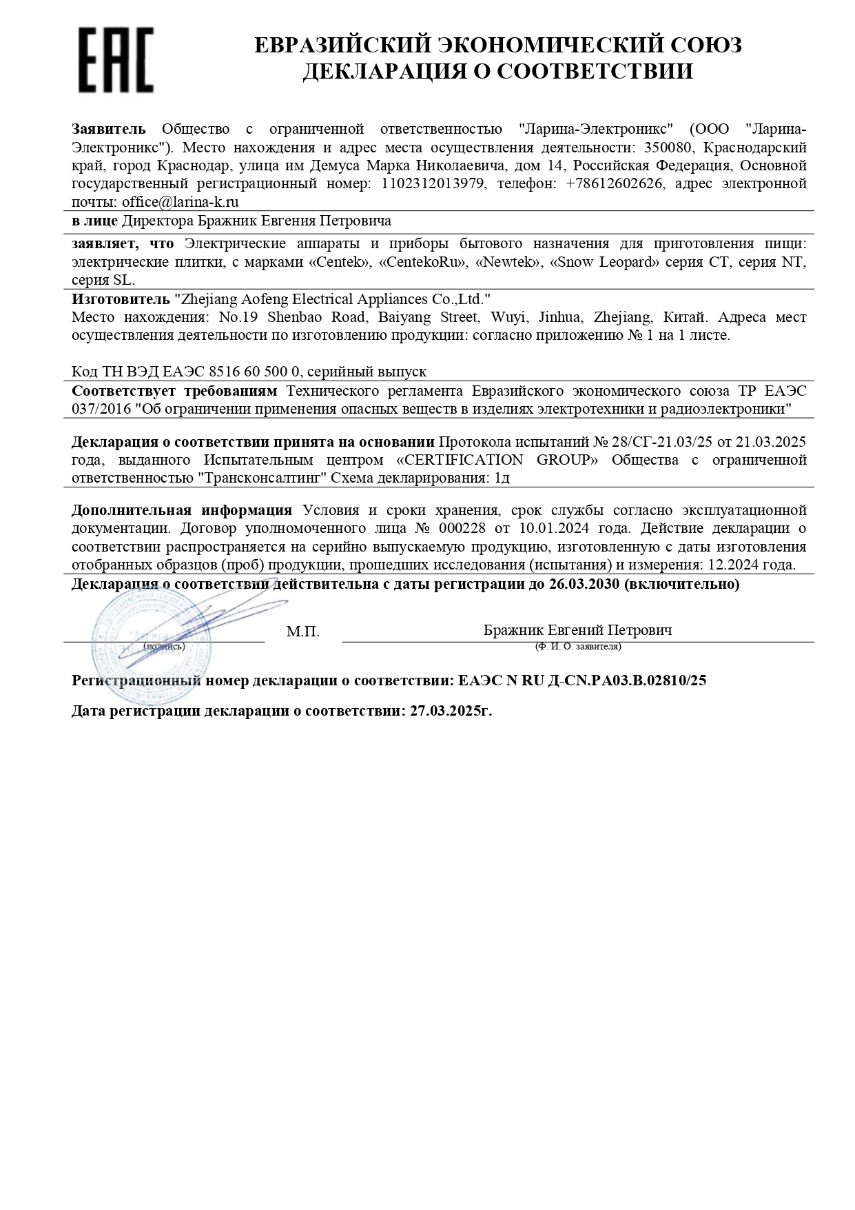 Настольная электрическая плита CENTEK CT-1507, 2000 Вт, 2 конфорки, 5 режимов нагрева, белая Код товара: 457591 1 796,76 ₽ Купить Производитель:CENTEK Компактная электрическая плита CENTEK CT-1507 станет отличным помощником на даче и поможет сэкономить место на небольшой кухне. Электрическая плитка CENTEK CT-1507 с двумя нагревательными элементами и мощностью 2000 Вт подходит для эксплуатации на даче, в гостевых домах и на компактных кухнях. Отличается надежностью и удобством в использовании. Чугунные нагревательные элементы диаметром 155 мм быстро разогреются до заданной вами температуры. Прибор оснащен удобными механическими переключателями с 5 режимами нагрева и световыми индикаторами работы для каждой конфорки. Усиленный металлический корпус с эмалированным покрытием легко чистится. Благодаря прорезиненным нескользящим ножкам плита надежно фиксируется на поверхности. Производитель оставляет за собой право без предварительного уведомления вносить изменения в технические характеристики, комплектацию и конструкцию, не ухудшающие эксплуатационные характеристики изделия.Производство: КитайМощность: 2000 ВтКоличество конфорок: 2Регулировка температуры: даСветовой индикатор работы: даДиаметр конфорки: 15.5 смКоличество температурных режимов: 5Цвет*: белыйЦвет: белыйСерия: CT-1507Вес: 2,34 кгРазмер упаковки: 5.7 × 43.9 × 24.2 смОбъём: 0.007 м3Промежуточная упаковка: 6 штТранспортная упаковка: 6 штШтрих-код: 4650058954426 Файлы Приложение-1.pdf Сертификат-1.jpg Сертификат-2.jpg Сертификат-3.jpg Сертификат-4.jpg Сертификат-5.jpg Сертификат-6.jpg Сертификат-7.jpg