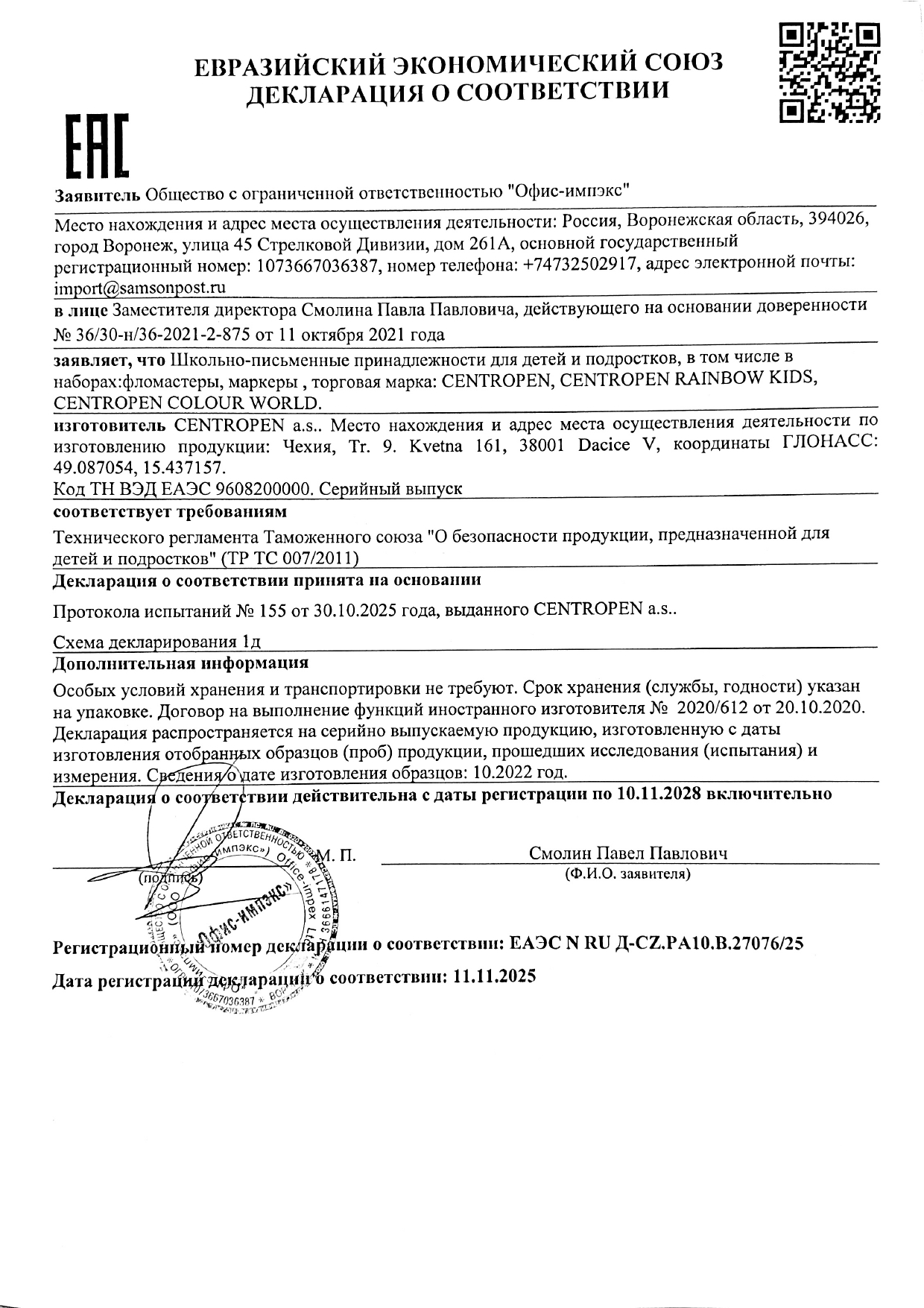 Фломастеры 24 ЦВЕТА CENTROPEN "Пингвины", смываемые, вентилируемый колпачок, 7790/24ET Код товара: 150058 515,46 ₽ Купить Производитель:CENTROPEN Набор фломастеров высокого качества. Оставляют яркий след на бумаге и легко смываются с рук и одежды. Производство: ЧехияКоличество цветов: 24Форма корпуса: шестиграннаяЭффект чернил: без эффектаТип чернил: легкосмываемыеСерия: ПингвиныШирина линии письма: 1.8 ммПишущий узел: 1.8 ммДлина письма: 500 мДлина корпуса: 130 ммДиаметр корпуса: 11 ммВентилируемый колпачок: даУпаковка: картонная коробка с европодвесомСрок годности: 60 месВес: 169 грРазмер упаковки: 1.1 × 23.8 × 19 смОбъём: 0.0006 м3Промежуточная упаковка: 12 штТранспортная упаковка: 12 штШтрих-код: 8595013616246 Сертификат-1.jpg Сертификат-2.jpg Сертификат-3.jpg
