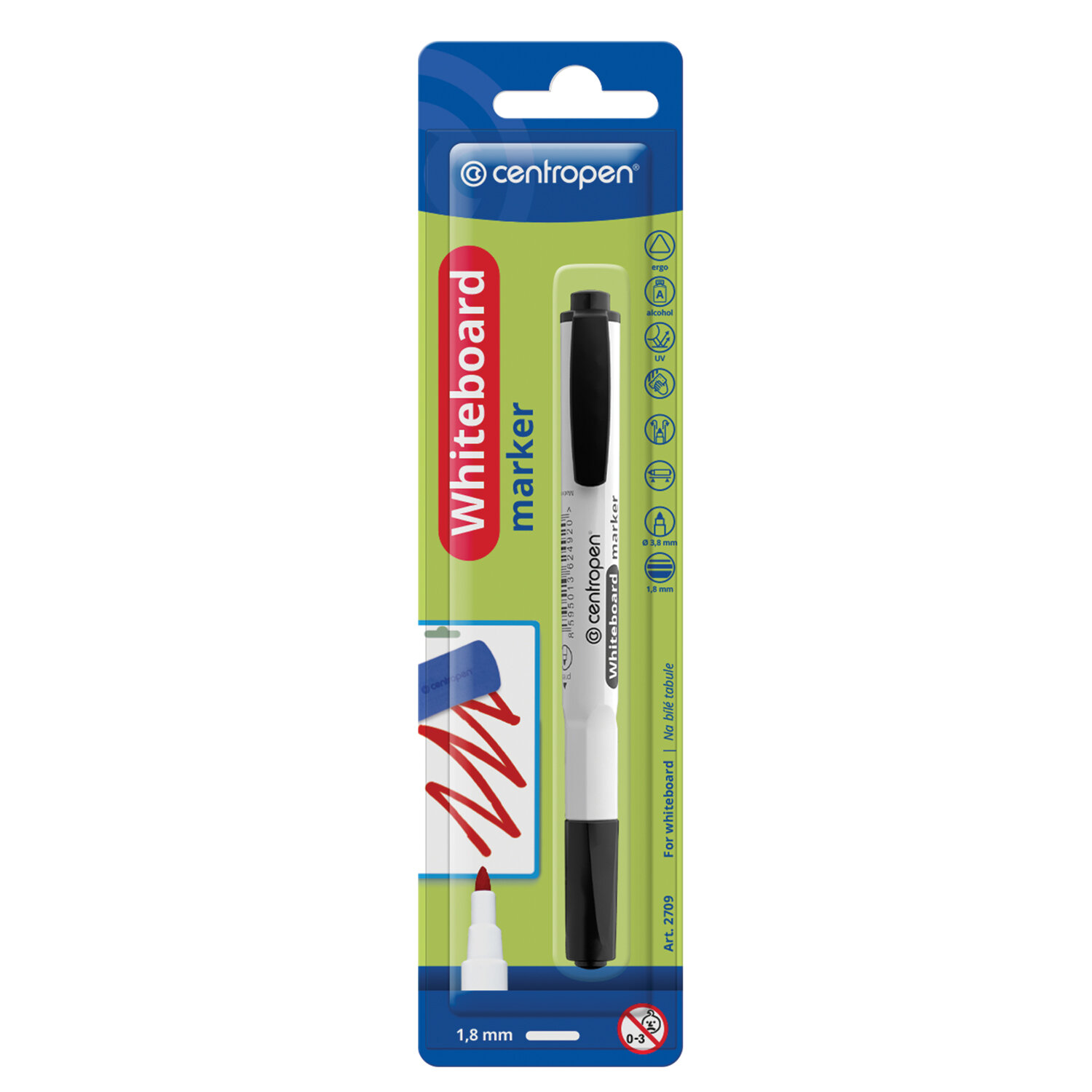 Маркер стираемый для белой доски ЧЕРНЫЙ, CENTROPEN "Dry-Wipe", 1,8 мм, 2709 Код товара: 152014 54,73 ₽ Купить Производитель:CENTROPEN Идеальное решение для презентаций и уроков – стираемый маркер CENTROPEN "Dry-Wipe" для белых досок! Маркер для письма на белых сухостираемых доска. Чернила на спиртовой основе. Эргономичная зона обхвата. Светостойкий, хранить в горизонтальном положении. Цилиндрический пишущий узел. Толщина письма – 1,8 мм.Производство: ЧехияЦвет: черныйСерия: 2709Наконечник: круглыйКоличество в комплекте: 1 шт.Основа чернил: спиртоваяЧернила стираются сухой губкой: даНе протекает при перепаде давления: даМатериал корпуса: пластикСрок годности: 36 месВес: 9 грРазмер упаковки: 13.5 × 1.5 × 1.2 смПромежуточная упаковка: 10 штТранспортная упаковка: 200 штШтрих-код: 8595013624951 Сертификат-1.jpg Сертификат-2.jpg Сертификат-3.jpg