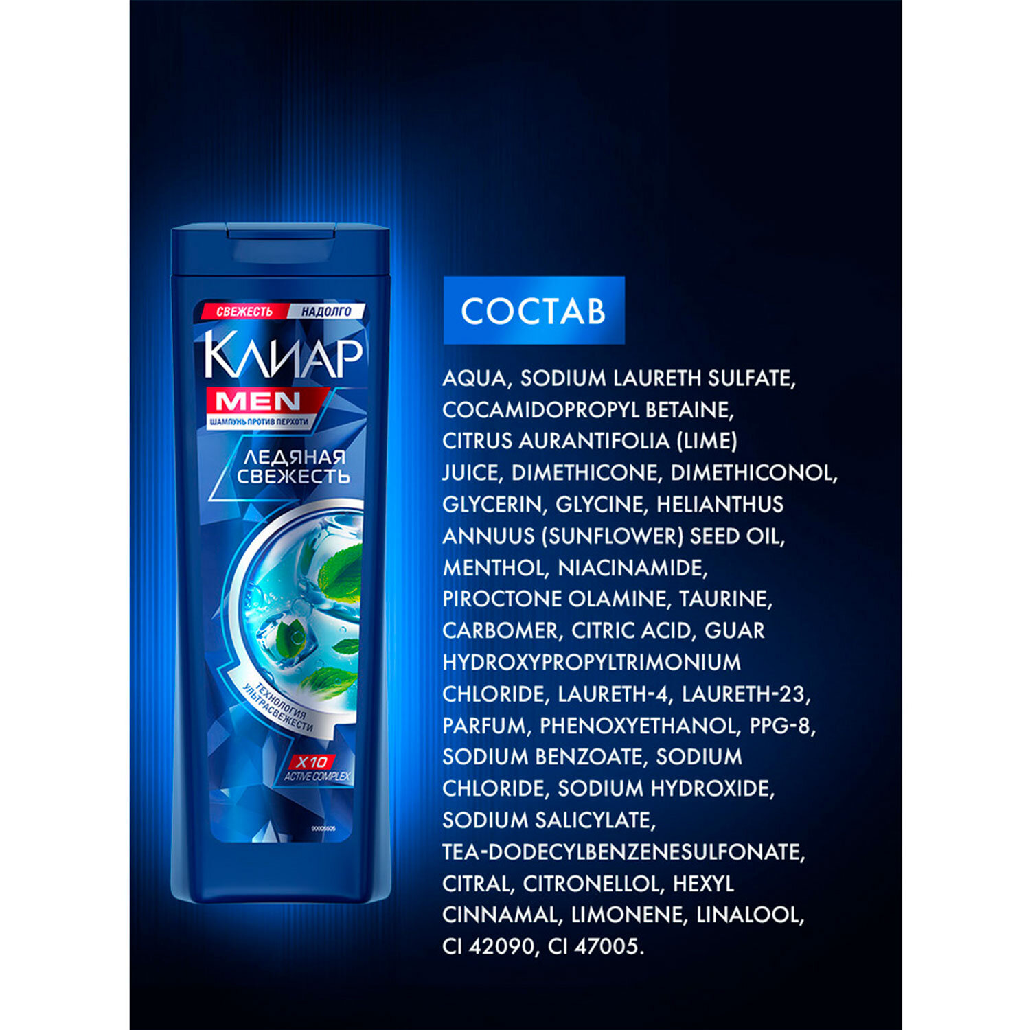 КЛИАР MEN "Ледяная свежесть" — мужской шампунь против перхоти с новой гелевой формулой, обогащенной соком лайма и ледяным ментолом. Средство разработано с учетом особенностей мужской кожи головы и дарит видимый результат: ДО 100% ЗАЩИТЫ ОТ ПЕРХОТИ!