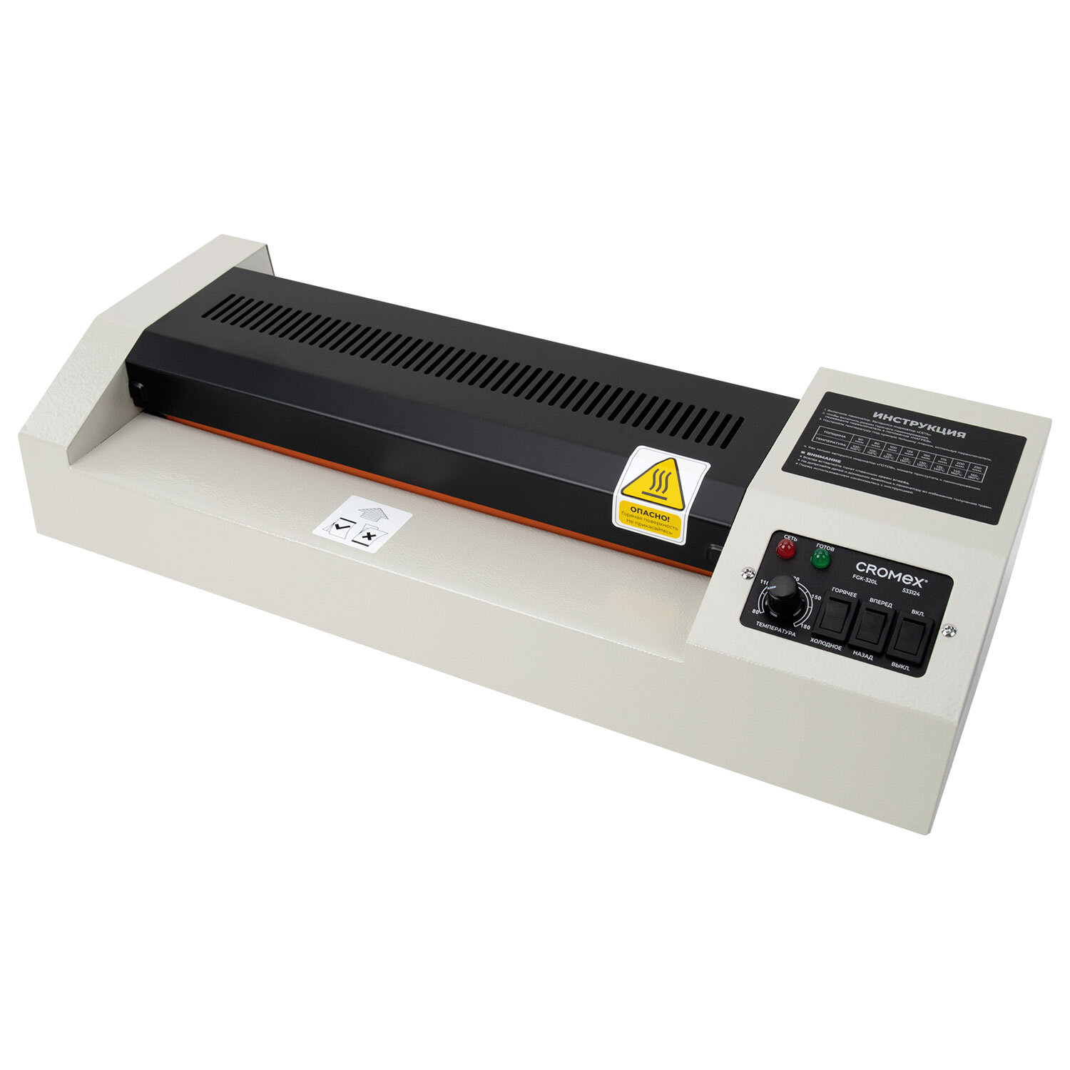 Ламинатор CROMEX (КРОМЕКС) FGK-320L формат А3, толщина пленки 60-250 мкм, скорость 50 см/мин Код товара: 533124 5 931,34 ₽ Купить Производитель:CROMEX ПРОФЕССИОНАЛЬНЫЙ ЛАМИНАТОР CROMEX FGK-320L подходит для больших объемов ламинирования. Высокая скорость – за 30 секунд ламинирует 1 лист А3 формата, в пакетах толщиной от 60 мкм до 250 мкм. Оснащен функцией холодного ламинирования и фольгирования. Предназначен для ламинирования документов, меню, рисунков, фотографий и пр., а также для фольгирования (процесса спекания тонера лазерного принтера или копировального аппарата с металлизированной фольгой под воздействием высокой температуры), которое используется для придания индивидуальности любым полиграфическим изделиям. Наиболее распространенными видами рекламно-информационных носителей, оформляемых работниками типографий в технике фольгирования, являются визитные карточки. Данная модель обладает ВЫСОКОЙ скоростью ламинирования (фольгирования). Это профессиональная модель для организаций со средним и высоким объемом работ. Ламинатор CROMEX FGK-320L способен заламинировать документы различных размеров от визитки до листа формата А3. Время нагрева в зависимости от заданной температуры составляет от 3 до 5 минут. Ламинирует 1 документ формата А3 в пакетах толщиной от 2x60 мкм до 2x250 мкм за 30 секунд. Кроме горячего ламинирования, данная модель оснащена также функцией холодного ламинирования. Функция антизамятия реализуется через кнопку "Назад", расположенную на панели управления, при этом пакет будет извлечен из приемного отсека автоматически. Комплектация: - ламинатор; - руководство пользователя; - гарантийный талон.Производство: КитайМаксимальный формат ламинирования: А3Тип ламинатора: пакетныйТип ламинирования: горячее, фольгирование, холодноеМакс. толщина пленки: 250 мкмМакс. толщина документа: 2 ммВремя нагрева: 300 секундСерия: FGKКоличество валов: 4 шт.Регулировка температуры: даСкорость ламинирования: 50 см/мин.Индикация о готовности к работе: даФункция реверса: даЛаминирование фотографий: даЦвет: белыйВысота: 110 ммШирина: 500 ммДлина: 208 ммВес: 6.45 кгРазмер упаковки: 15.6 × 55.8 × 27.1 смОбъём: 0.0274 м3Промежуточная упаковка: 2 штТранспортная упаковка: 2 штШтрих-код: 4606224484754 Файлы Сертификат-1.jpg Сертификат-2.jpg