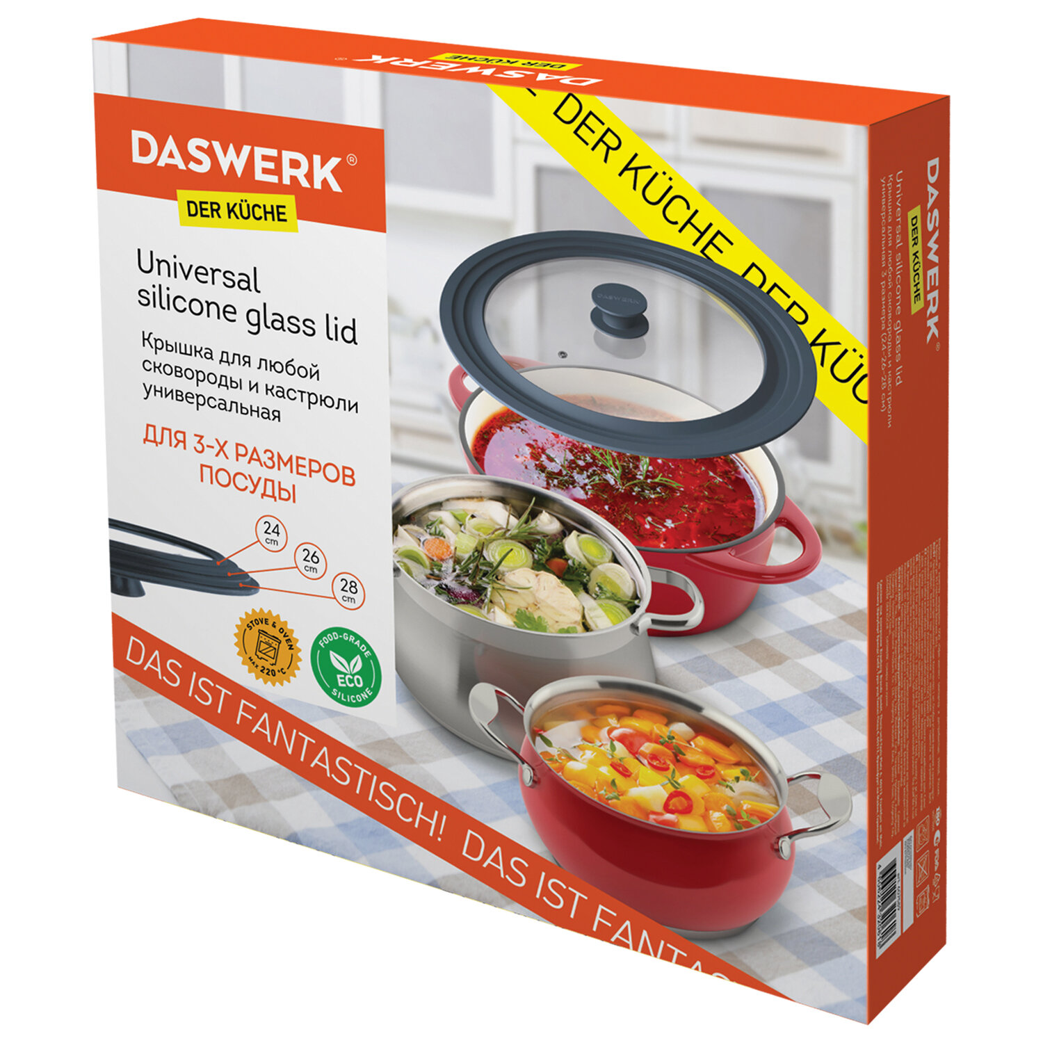 Крышка для любой сковороды и кастрюли универсальная 3 размера (24-26-28 см) антрацит, DASWERK (ДАСВЕРК) Код товара: 607589 745,64 ₽ Купить Производитель:DASWERK Универсальная крышка DASWERK, выполненная из силикона и стекла, позволит сэкономить не только время, но и пространство на кухне: одну крышку можно использовать для посуды разных размеров: 24 см, 26 см и 28 см в диаметре. Крышка DASWERK изготовлена из термостойкого стекла, что позволяет контролировать процесс приготовления без потери тепла. Ободок из экологичного жаропрочного силикона выдерживает температуру до 220 °С. Преимущества: - не выделяет вредных веществ; - легко моется и не впитывает запахи; - можно использовать крышку для приготовления в духовке; - силиконовые части крышки надежно защищают стекло при падении. Больше не нужно хранить гору стеклянных крышек разного размера, универсальная крышка DASWERK существенно сэкономит место на кухне.Производство: КитайДиаметр: 24-26-28 смНазначение для: воки, жаровни, кастрюли, ковши, сковороды, сотейникиСерия: KucheМатериал: стекло, силиконЦвет: антрацитовыйВес: 872 грРазмер упаковки: 6 × 29.9 × 30.6 смОбъём: 0.0066 м3Промежуточная упаковка: 8 штТранспортная упаковка: 8 штШтрих-код: 4606224320618 Сертификат-1.jpg Сертификат-2.jpg Сертификат-3.jpg