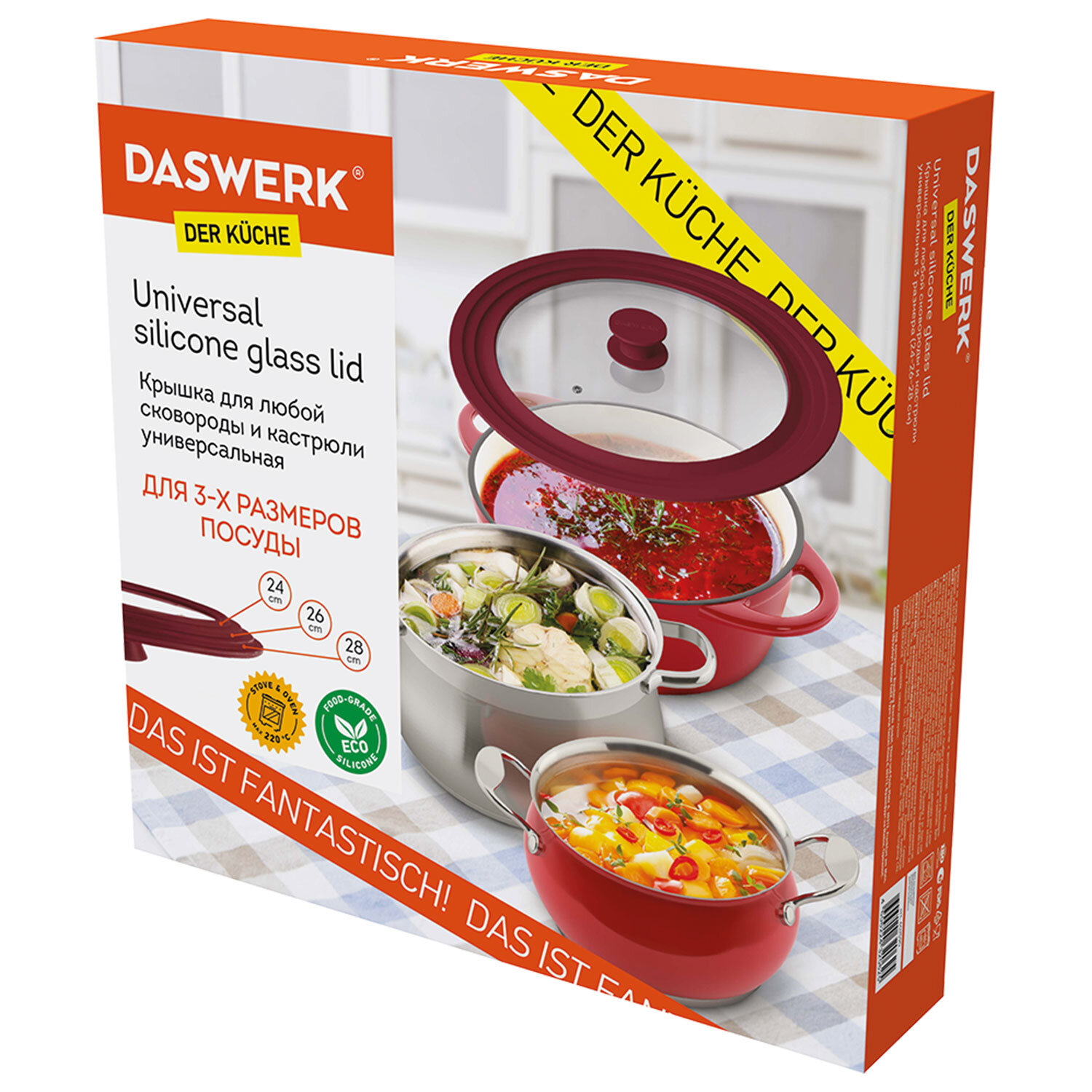 Крышка для любой сковороды и кастрюли универсальная 3 размера (24-26-28 см) бордовая, DASWERK (ДАСВЕРК) Код товара: 607590 544,43 ₽ Купить Производитель:DASWERK Универсальная крышка DASWERK, выполненная из силикона и стекла, позволит сэкономить не только время, но и пространство на кухне: одну крышку можно использовать для посуды разных размеров: 24 см, 26 см и 28 см в диаметре. Крышка DASWERK изготовлена из термостойкого стекла, что позволяет контролировать процесс приготовления без потери тепла. Ободок из экологичного жаропрочного силикона выдерживает температуру до 220 °С. Преимущества: - не выделяет вредных веществ; - легко моется и не впитывает запахи; - можно использовать крышку для приготовления в духовке; - силиконовые части крышки надежно защищают стекло при падении. Больше не нужно хранить гору стеклянных крышек разного размера, универсальная крышка DASWERK существенно сэкономит место на кухне.Производство: КитайДиаметр: 24-26-28 смНазначение для: воки, жаровни, кастрюли, ковши, сковороды, сотейникиСерия: KucheМатериал: стекло, силиконЦвет: бордовыйВес: 854 грРазмер упаковки: 6.1 × 30.1 × 30.4 смОбъём: 0.0067 м3Промежуточная упаковка: 8 штТранспортная упаковка: 8 штШтрих-код: 4606224320625 Сертификат-1.jpg Сертификат-2.jpg Сертификат-3.jpg