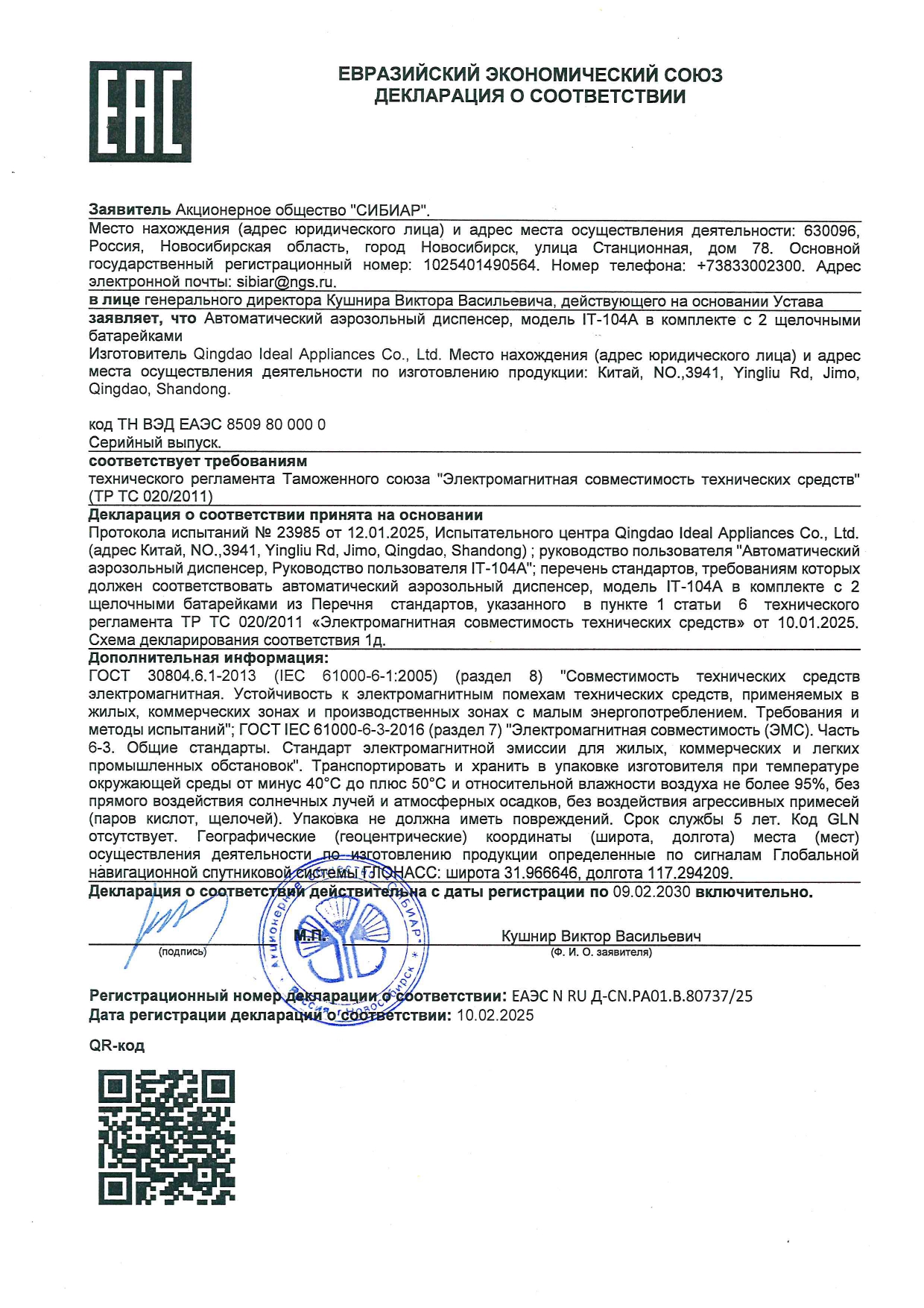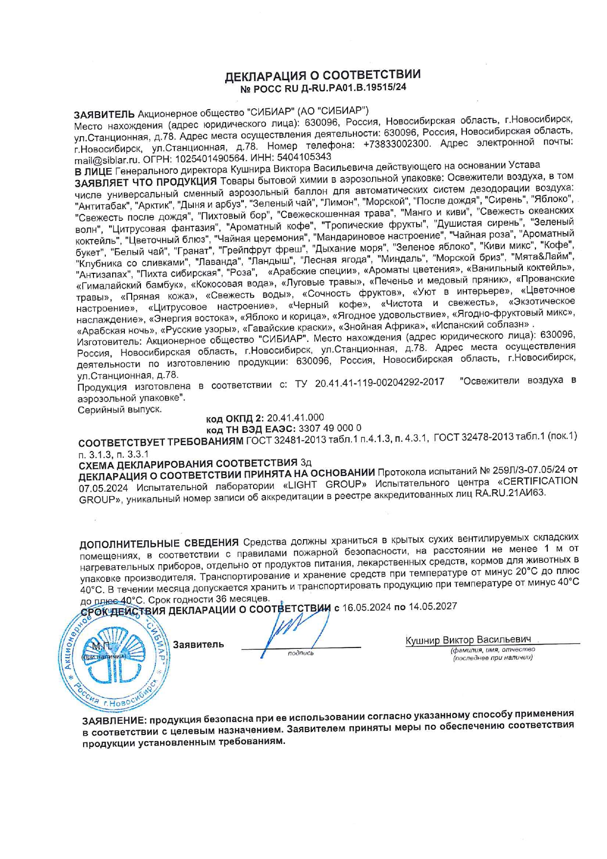 Освежитель воздуха автоматический со сменным баллоном 250 мл, DO-RE-MI "Гранат", СИБИАР Код товара: 701268 959,01 ₽ Купить Производитель:Do-re-mi Автоматический диспенсер с освежителем воздуха DO-RE-MI "Гранат" подарит вашему дому комфорт, уют и свежесть граната. Автоматический диспенсер + 2 батарейки. Действует до 60 дней при интервале распыления 30 минут. Применять при температуре не ниже +10 °С. Способ применения. • Замена баллона: переведите переключатель в положение OFF, извлеките пустой баллон из устройства согласно инструкции по эксплуатации. Вставьте сменный баллон носиком наружу. Не направляйте в лицо при включении или установке интервала распыления. • Переведите переключатель в положение ON, выбрав желаемый интервал распыления. Первое распыление начнется автоматически через несколько секунд. Универсальный сменный аэрозольный баллон можно использовать без автоматического устройства, как обычный аэрозольный освежитель воздуха. Состав: углеводородный пропеллент (бутан/ пропан/изобутан смесь) не менее 30%, спирт этиловый денатурированный не менее 30%, пропиленгликоль 5-15%, отдушка 5–15%, аллергены: гексилциннамаль, бензилсалицилат, линалоол, гидроксизогексил 3-циклогексен карбоксальдегид, лимонен, альфа-изометилионон, цитронеллол, линалоол. ТУ 20.41.41-119-00204292-2017Производство: РоссияТип товара: аэрозольныйОтдушка: ГранатСерия: DO-RE-MIСухое распыление: даОбъем/вес: 250 мл/гСрок годности: 36 месВес: 688 грРазмер упаковки: 9 × 21.8 × 15.5 смОбъём: 0.0037 м3Промежуточная упаковка: 4 штТранспортная упаковка: 4 штШтрих-код: 4600171532674 Сертификат-1.jpg Сертификат-2.jpg