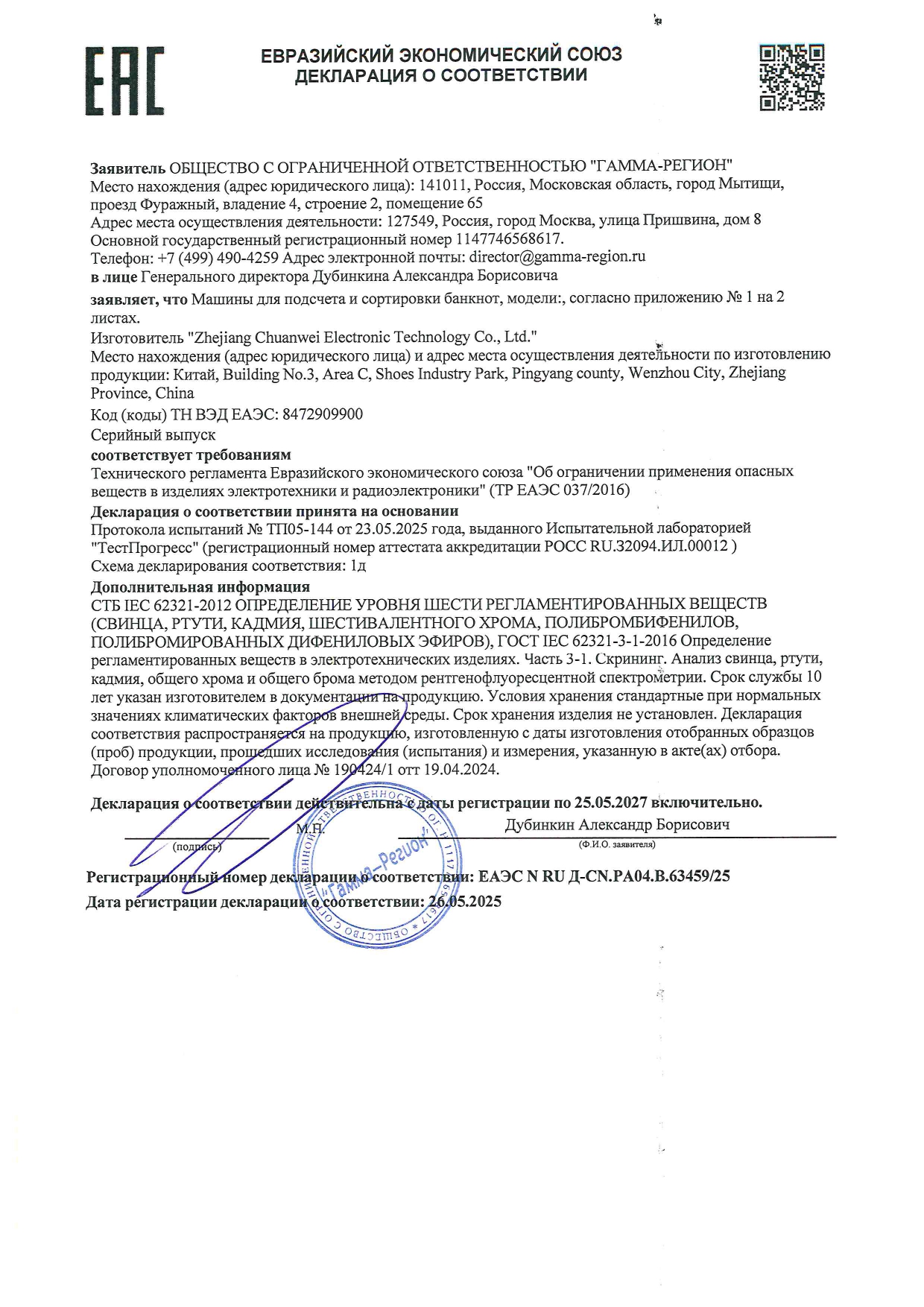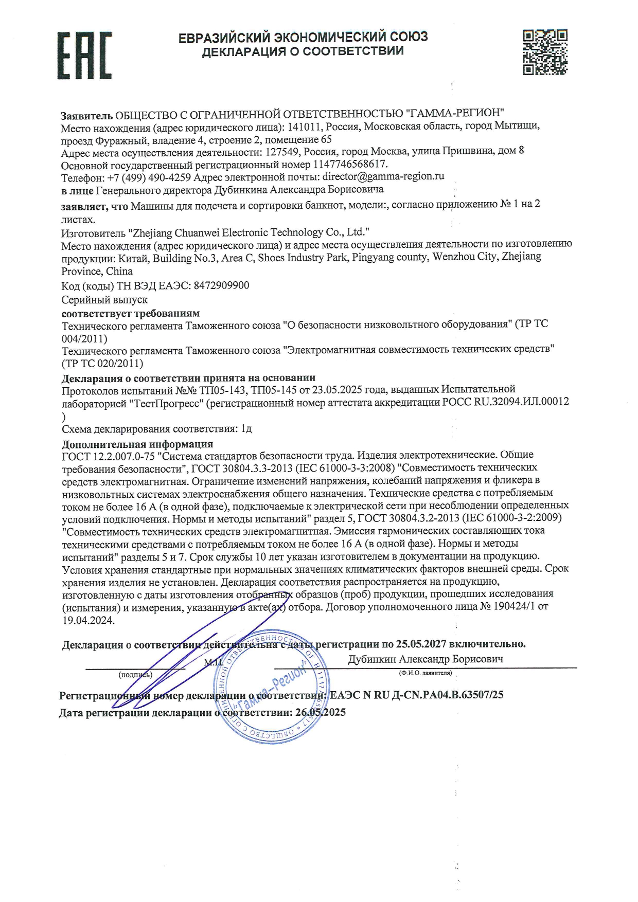 Счетчик-сортировщик банкнот DOCASH 3200 HD, 1500 банкнот/мин, УФ, ИК, МАГН детекция, номинал, фасовка Код товара: 291097 39 645,9 ₽ Купить Производитель:DOCASH Инновационный счетчик банкнот с возможностью определения номиналов и высочайшим уровнем детекции подлинности. Обработка наличности, пересчет смешанной пачки. Выявление высококачественных фальшивых банкнот. Преимущества: - высокий эксплуатационный ресурс и возможность обработки большого объема наличности; - проверка подлинности по 4 машиночитаемым защитным признакам ЦБ; - предустановленный набор из трех валют (RUB/USD/EUR) с возможностью расширения до 15 валют; - режим автоматического определения валюты; - мультивалютный режим работы (одновременный пересчет нескольких валют с раздельным результатом); - возможность быстрого и легкого доступа к тракту для чистки оптических датчиков и устранения замятий; - возможность оперативного обновления прошивки; - регулируемая скорость пересчета для оптимальной обработки купюр любой плотности и ветхости; - печать результатов пересчета; - успешно прошел тестирование в Европейском Центральном Банке.Производство: КитайМаксимальная скорость счета: 1500 банкнот в минутуМинимальная скорость счета: 800 банкнот в минутуКоличество скоростей счета: 4CIS-сканер: даМагнитная детекция: даИнфракрасная детекция: даДетекция по геометрии (размер): даДетекция по оптической плотности: даДетекция по спектральному анализу краски: даУльтрафиолетовая детекция: даRUB: даUSD: даEUR: даСерия: 3200Мультивалютность: даЕмкость загрузочного бункера: 500 банкнотЕмкость приемного бункера: 200 банкнотСортировка: по году эмиссии, по номиналам, по ориентацииСпособ загрузки банкнот: горизонтальныйФасовка (отсчет необходимого количества банкнот): даАвтоматическое определение номинала: даПересчет банкнот с накоплением итога: даОбнаружение сдвоенных банкнот: даПересчет смешанной пачки банкнот одной валюты: даИнтерфейс русифицированный: даИндикация при обнаружении подозрительной банкноты: кодовая Обработка банкнот любого состояния: даПитание от сети 220В: даДлина: 260 ммВысота: 240 ммШирина: 230 ммЦвет: черныйВес: 6.5 кгРазмер упаковки: 29.2 × 34.5 × 33.4 смОбъём: 0.0336 м3Промежуточная упаковка: 1 штТранспортная упаковка: 1 штШтрих-код: 4610044640221 Файлы Приложение-1.pdf Сертификат-1.jpg Сертификат-2.jpg Сертификат-3.jpg Сертификат-4.jpg Сертификат-5.jpg Сертификат-6.jpg Сертификат-7.jpg Сертификат-8.jpg