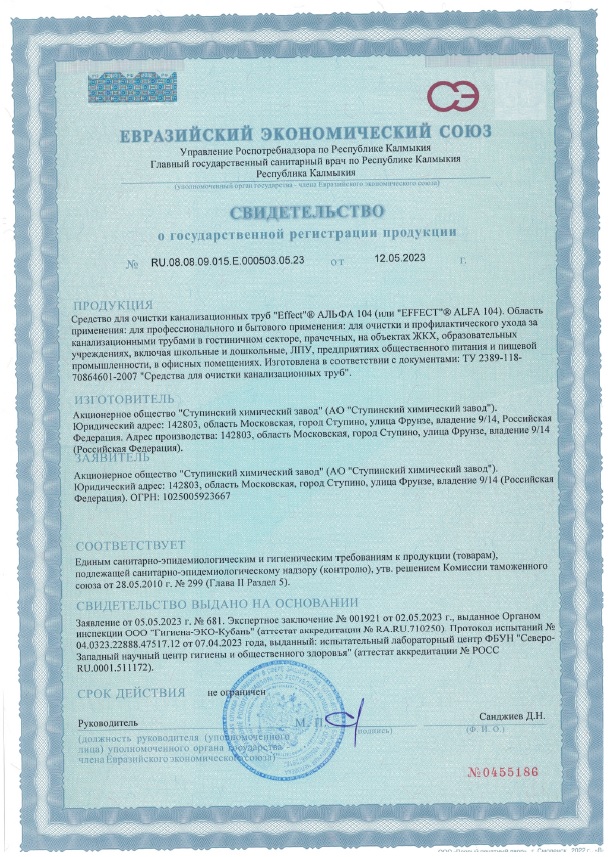 Средство для прочистки канализационных труб 5 л, EFFECT "Alfa 104", содержит хлор 5-15% Код товара: 604211 672,19 ₽ Купить Производитель:EFFECT Предназначено для очистки и профилактического ухода за канализационными трубами. Эффективно растворяет в стоках волосы, остатки пищи, жир и другие загрязнения. Нейтрализует неприятные запахи. Средство безопасно для всех видов труб, в т.ч. пластиковых. Способ применения: Аккуратно налить гель (250 мл) в сливное отверстие канализационной трубы. Не смывать в течение 5-15 мин. При сильных засорах оставить на большее время. Промыть сильной струёй воды. При необходимости обработку повторить. Профилактика: обработку проводить 1 раз в месяц. Дозировка: использовать без разведения. Внешний вид: Прозрачная однородная загущенная жидкость светло-желтого цвета со специфическим запахом; pH (1%-ный р-р) - 11,5; Плотность - 1,090 г/см3. Состав: 5%, но < 15% гипохлорит натрия, < 5%: АПАВ и НПАВ, мыло на основе натуральных жирных кислот, гидроксид натрия, соль ЭДТА. Область применения: для очистки канализационных труб. Средство может быть использовано в гостиницах, ресторанах, офисах, на объектах пищевой промышленности, предприятиях общественного питания, в лечебно-профилактических, санитарно-курортных, детских, дошкольных и других аналогичных учреждениях.Производство: РоссияФорма выпуска: гельОбъем/вес: 5000 мл/гСерия: Нет данныхМатериал труб: универсальныйЭффект от использования: устраняет засоры, устраняет неприятный запахЭффективен в холодной воде: даРазрешено для детских учреждений: даОбласть применения: бытовое использование, государственные учреждения, пищевая промышленность, предприятия общественного питания, санаторно-курортные учреждения, сфера услуг, торговые учреждения, учреждения образования (школьные, дошкольные, средние, высшие)Упаковка: канистраСрок годности: 24 месВес: 5,45 кгРазмер упаковки: 28.7 × 19.1 × 13.3 смОбъём: 0.0087 м3Промежуточная упаковка: 2 штТранспортная упаковка: 2 штШтрих-код: 4602984011537 Файлы Приложение-1.pdf Приложение-2.pdf Сертификат-1.jpg Сертификат-2.jpg Сертификат-3.jpg Сертификат-4.jpg Сертификат-5.jpg Сертификат-6.jpg Сертификат-7.jpg Сертификат-8.jpg Сертификат-9.jpg Сертификат-10.jpg Сертификат-11.jpg Сертификат-12.jpg Сертификат-13.jpg Сертификат-14.jpg Сертификат-15.jpg Сертификат-16.jpg Сертификат-17.jpg Сертификат-18.jpg Сертификат-19.jpg Сертификат-20.jpg Сертификат-21.jpg Сертификат-22.jpg Сертификат-23.jpg Сертификат-24.jpg Сертификат-25.jpg Сертификат-26.jpg Сертификат-27.jpg