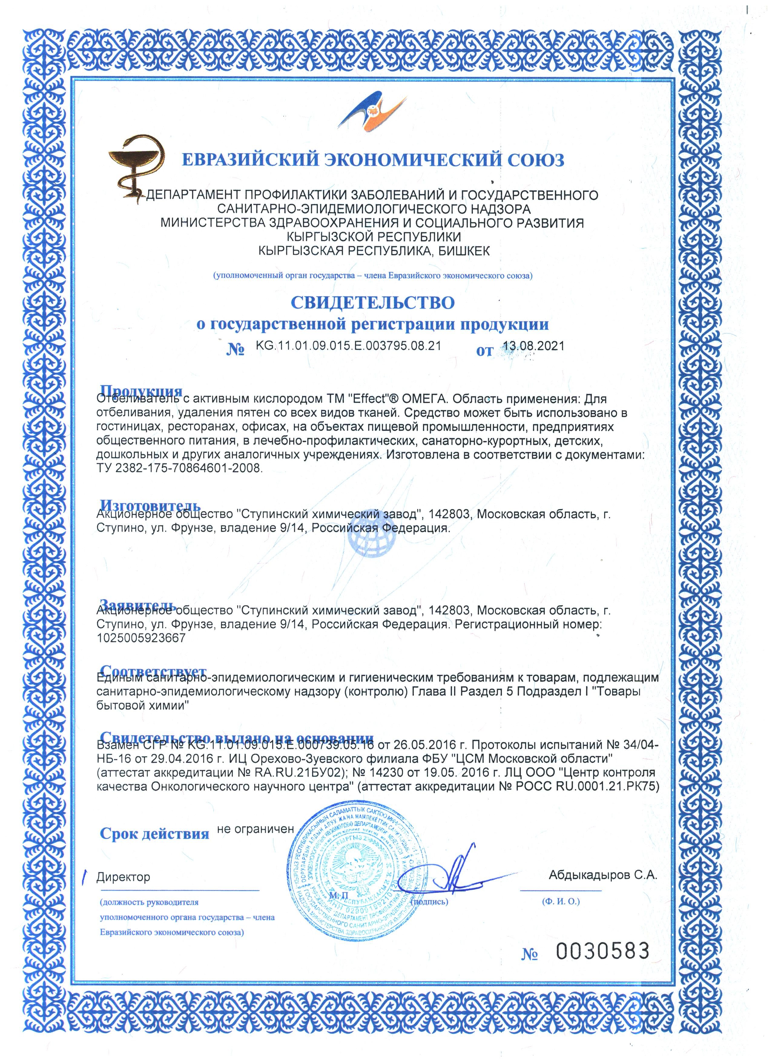 Средство для отбеливания и чистки тканей 5 кг, EFFECT "Omega 504", с активным кислородом Код товара: 604222 861,34 ₽ Купить Производитель:EFFECT Предназначено для отбеливания, стирки с отбеливанием, удаления пятен с белого и цветного белья из всех видов тканей. Удаляет жировые загрязнения, белковые, органические и грязь. Можно использовать для гостиниц, ресторанов, офисов, на объектах пищевой промышленности, предприятиях общественного питания, в лечебно-профилактических, санаторно-курортных, детских, дошкольных и других аналогичных учреждениях. Рекомендации по применению: Предварительная обработка перед стиркой: на увлажненные пятна или сильно загрязненные места нанести средство, выдержать 10 - 20 мин. При необходимости увеличить время выдержки или обработку повторить. Далее стирать обычным способом. При стирке в стиральной машине: добавить в кювету для основной стирки 25 - 50 г средства к средству для стирки. Стирать согласно инструкции к стиральной машине и надписям на ярлыках белья. Отбеливание и удаление пятен: выдержать белье в растворе 150 - 200 г средства на 10 л раствора средства для стирки в течение 30 минут при температуре: 80С - 100С – для изделий из хлопчатобумажных, льняных, вискозных и штапельных тканей; 60С - 70С - для изделий из синтетических, шёлковых, смесовых тканей; 30С - 40С – для изделий из шерсти. Далее стирать обычным способом. Состав: больше или равно 5%, но < 15% отбеливающее вещество на основе кислорода; < 5%: АПАВ и НПАВ; < 5% оптический отбеливатель; гидрофосфат натрия; ароматизатор. Область применения: для отбеливания, удаления пятен со всех видов тканей. Средство может быть использовано в гостиницах, ресторанах, офисах, на объектах пищевой промышленности, предприятиях общественного питания, в лечебно-профилактических, санитарно-курортных, детских, дошкольных и других аналогичных учреждениях.Производство: РоссияТип средства: пятновыводительНазначение: для цветного и белого бельяОбъем: 5000 мл/гВид средства: жидкостьБез хлора: даРазрешено для детских учреждений: даОбласть применения: бытовое использование, государственные учреждения, пищевая промышленность, предприятия общественного питания, производственные компании, санаторно-курортные учреждения, сфера услуг, торговые учреждения, учреждения образования (школьные, дошкольные, средние, высшие)Серия: Omega 504pH: 5Дозатор: нетВид упаковки: канистраСрок годности: 18 месВес: 5,42 кгРазмер упаковки: 28.7 × 18.6 × 13.1 смОбъём: 0.0084 м3Промежуточная упаковка: 2 штТранспортная упаковка: 2 штШтрих-код: 4602984011698 Файлы Приложение-1.pdf Сертификат-1.jpg Сертификат-2.jpg Сертификат-3.jpg