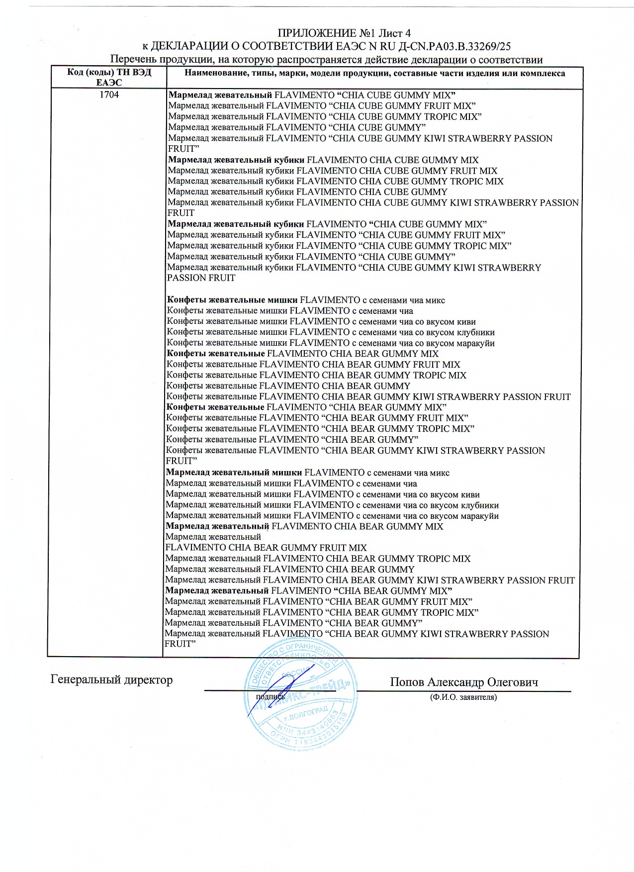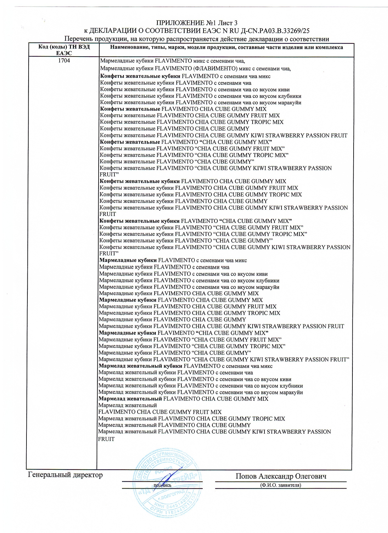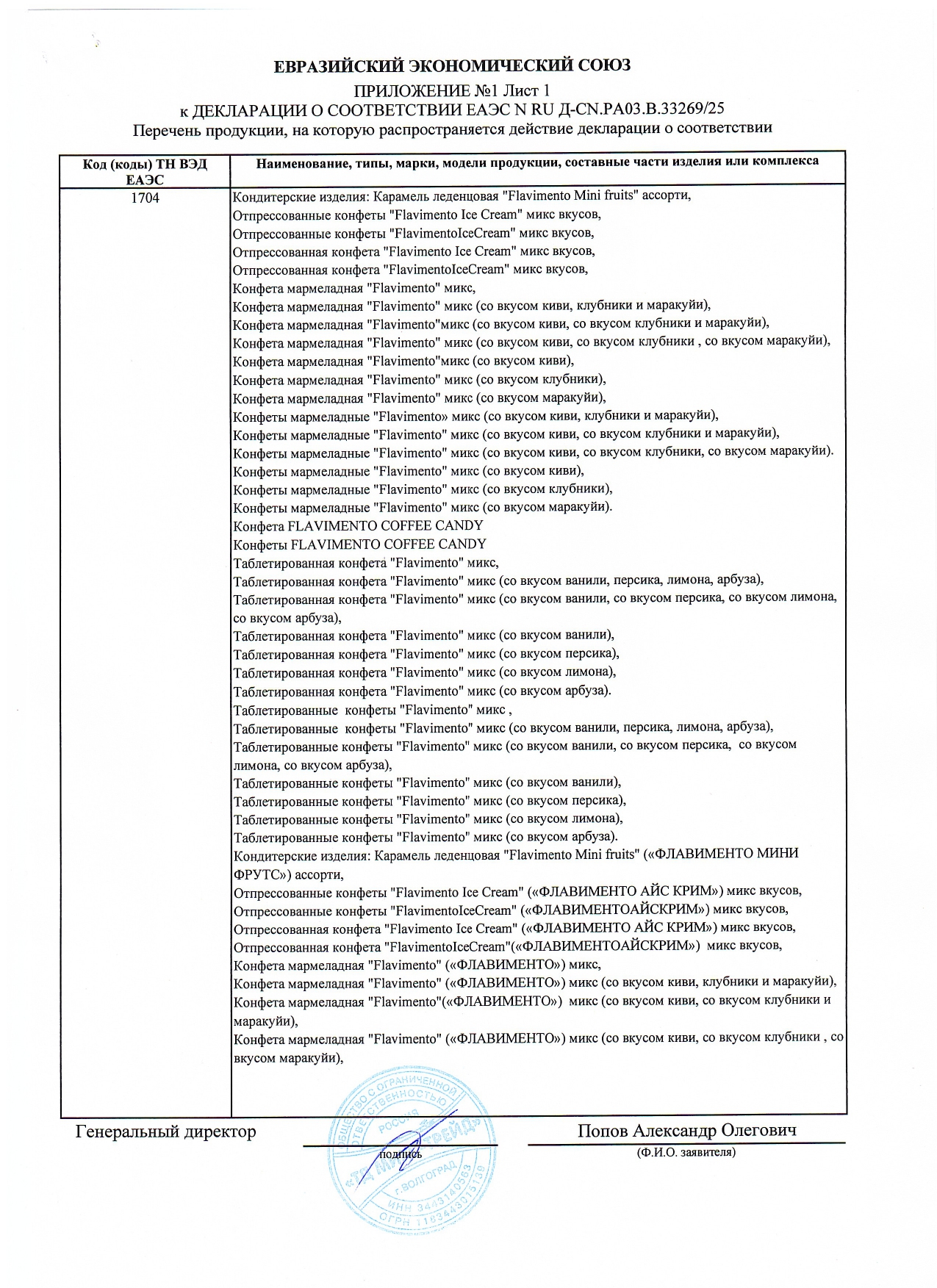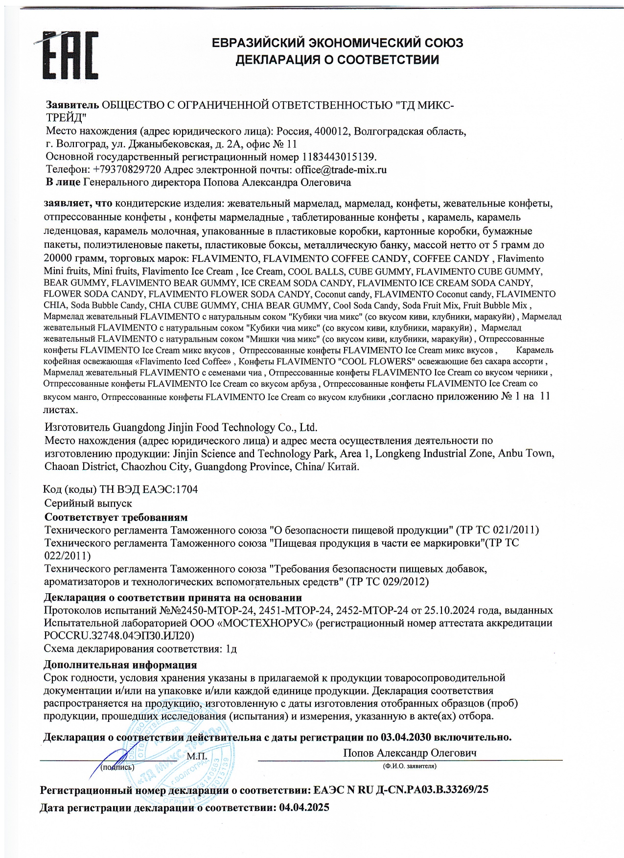 Конфеты мармеладные FLAVIMENTO, ассорти со вкусом киви, клубники и маракуйи, 500 г Код товара: 624273 580,9 ₽ Купить Производитель:FLAVIMENTO Конфеты мармеладные FLAVIMENTO с семенами чиа и содержанием натурального сока. Кубики со вкусом киви, клубники, и маракуйи. Каждая мини-конфетка (кубик) упакована в индивидуальную упаковку, благодаря чему ее удобно брать с собой, положив в карман или в салон автомобиля. Отлично подходит для использования в качестве комплимента на стойке ресепшена. Состав: солодовый сироп; сахар; трегалоза; подсластитель – сорбитовый сироп; загустители – каррагин, пектин; регуляторы кислотности: лимонная кислота, цитрат на трия, DL-яблочная кислота; агент желирующий – агар; антиокислитель – пиросульфит натрия; растительное масло; глазирователь – карнаубский воск; концентрированный сок (киви, клубники, маракуйи); семена Чиа.Производство: КитайВес нетто: 500 гСерия: FLAVIMENTOУпаковка: флоу-пакВкус: киви, клубника и маракуйяСрок годности: 24 мес.Фирма-производитель: Микс ТрейдСрок годности: 24 месВес: 514 грРазмер упаковки: 7.6 × 26.4 × 17.7 смОбъём: 0.0024 м3Промежуточная упаковка: 14 штТранспортная упаковка: 14 штШтрих-код: 6976613321006 Файлы Сертификат-1.jpg Сертификат-2.jpg Сертификат-3.jpg Сертификат-4.jpg Сертификат-5.jpg Сертификат-6.jpg Сертификат-7.jpg Сертификат-8.jpg Сертификат-9.jpg Сертификат-10.jpg Сертификат-11.jpg Сертификат-12.jpg Сертификат-13.jpg Сертификат-14.jpg