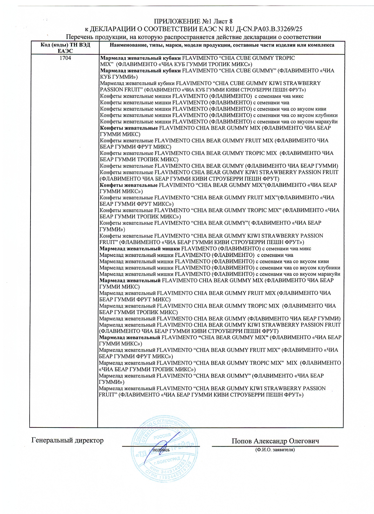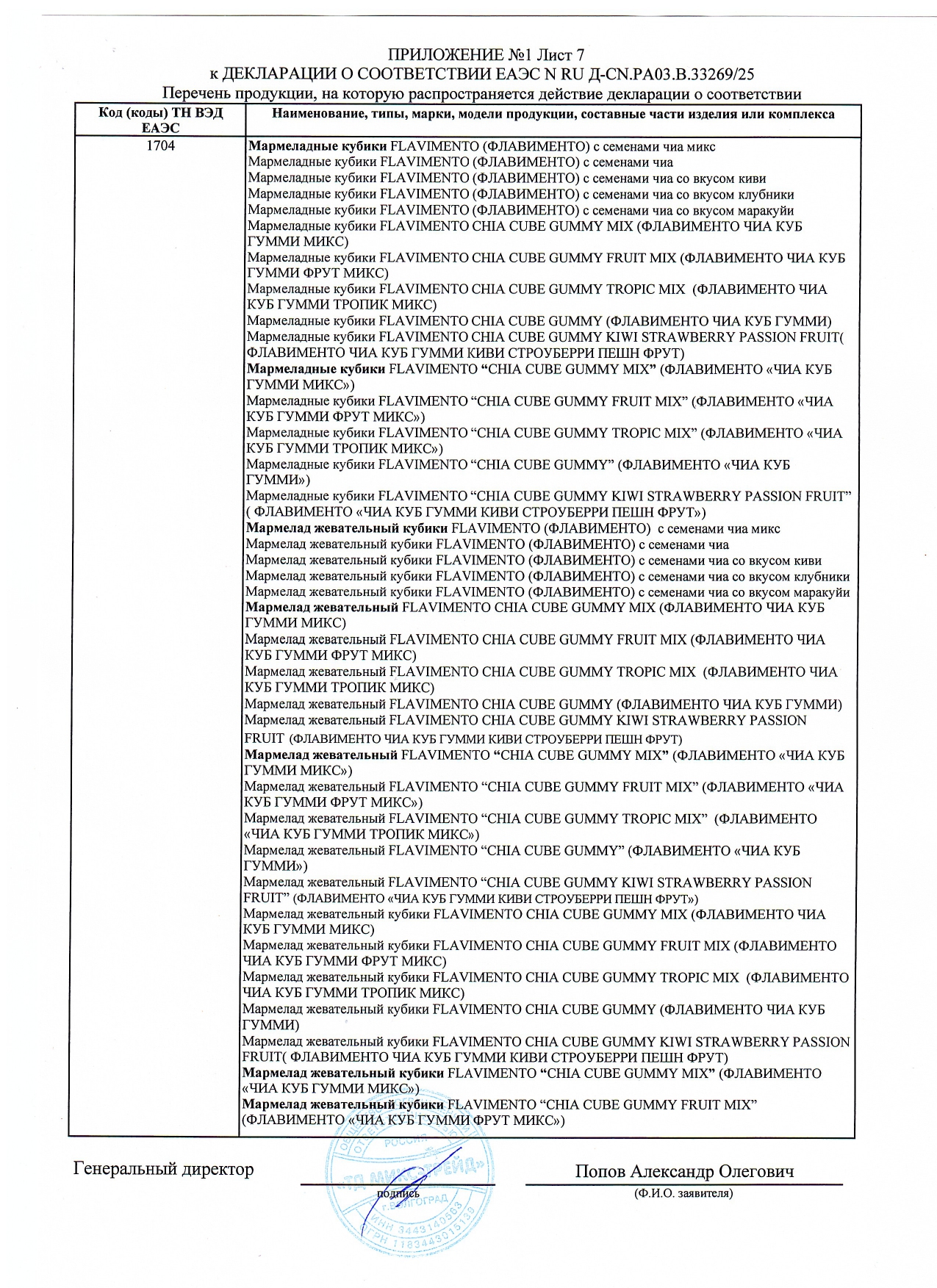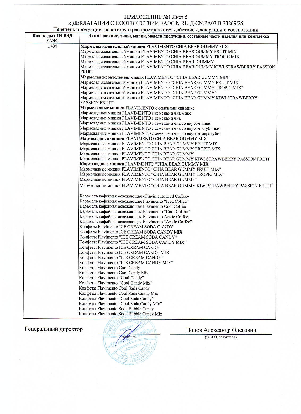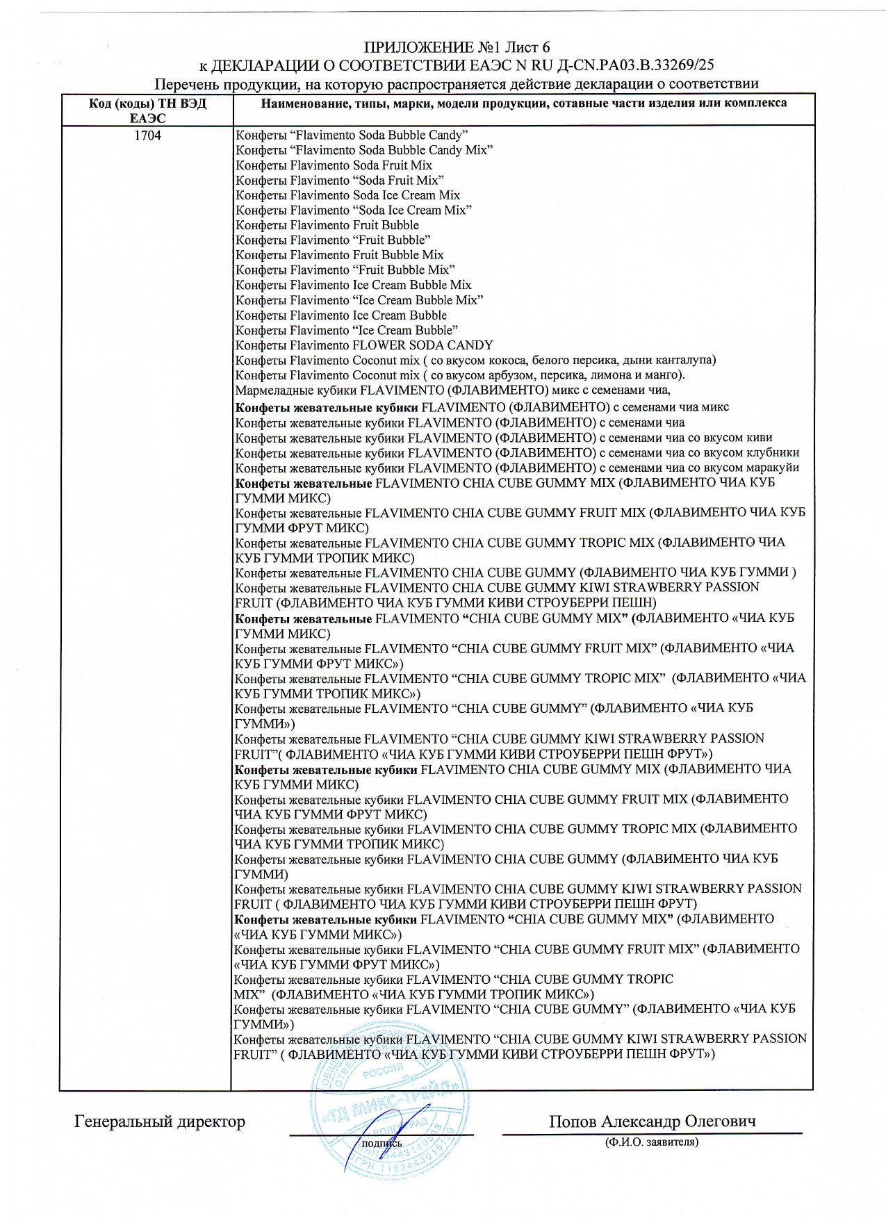Конфеты мармеладные FLAVIMENTO, ассорти со вкусом киви, клубники и маракуйи, 500 г Код товара: 624273 580,9 ₽ Купить Производитель:FLAVIMENTO Конфеты мармеладные FLAVIMENTO с семенами чиа и содержанием натурального сока. Кубики со вкусом киви, клубники, и маракуйи. Каждая мини-конфетка (кубик) упакована в индивидуальную упаковку, благодаря чему ее удобно брать с собой, положив в карман или в салон автомобиля. Отлично подходит для использования в качестве комплимента на стойке ресепшена. Состав: солодовый сироп; сахар; трегалоза; подсластитель – сорбитовый сироп; загустители – каррагин, пектин; регуляторы кислотности: лимонная кислота, цитрат на трия, DL-яблочная кислота; агент желирующий – агар; антиокислитель – пиросульфит натрия; растительное масло; глазирователь – карнаубский воск; концентрированный сок (киви, клубники, маракуйи); семена Чиа.Производство: КитайВес нетто: 500 гСерия: FLAVIMENTOУпаковка: флоу-пакВкус: киви, клубника и маракуйяСрок годности: 24 мес.Фирма-производитель: Микс ТрейдСрок годности: 24 месВес: 514 грРазмер упаковки: 7.6 × 26.4 × 17.7 смОбъём: 0.0024 м3Промежуточная упаковка: 14 штТранспортная упаковка: 14 штШтрих-код: 6976613321006 Файлы Сертификат-1.jpg Сертификат-2.jpg Сертификат-3.jpg Сертификат-4.jpg Сертификат-5.jpg Сертификат-6.jpg Сертификат-7.jpg Сертификат-8.jpg Сертификат-9.jpg Сертификат-10.jpg Сертификат-11.jpg Сертификат-12.jpg Сертификат-13.jpg Сертификат-14.jpg