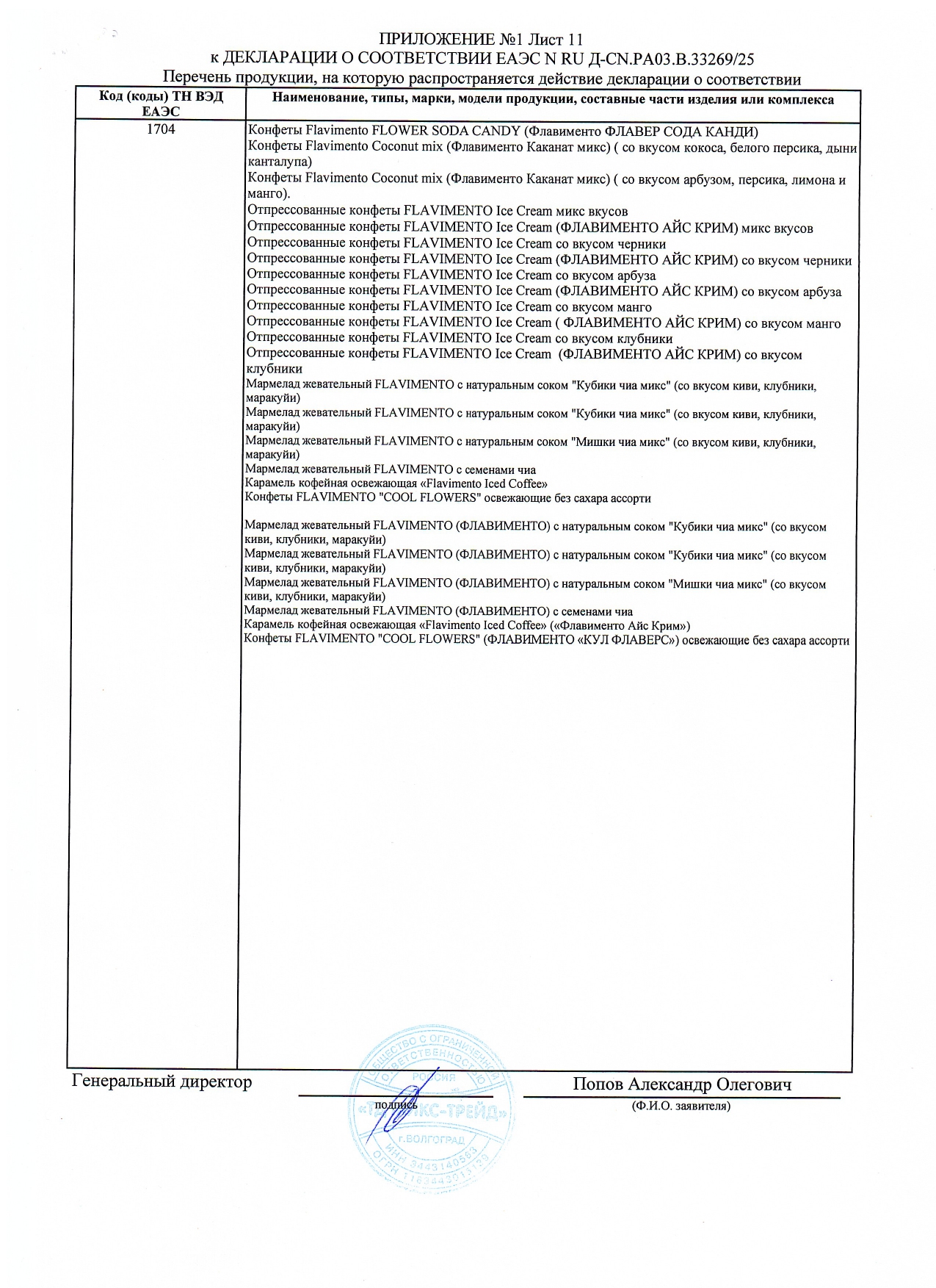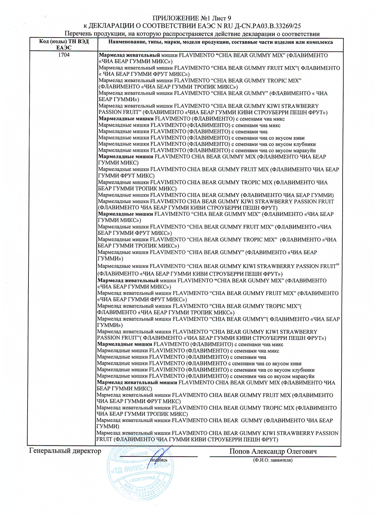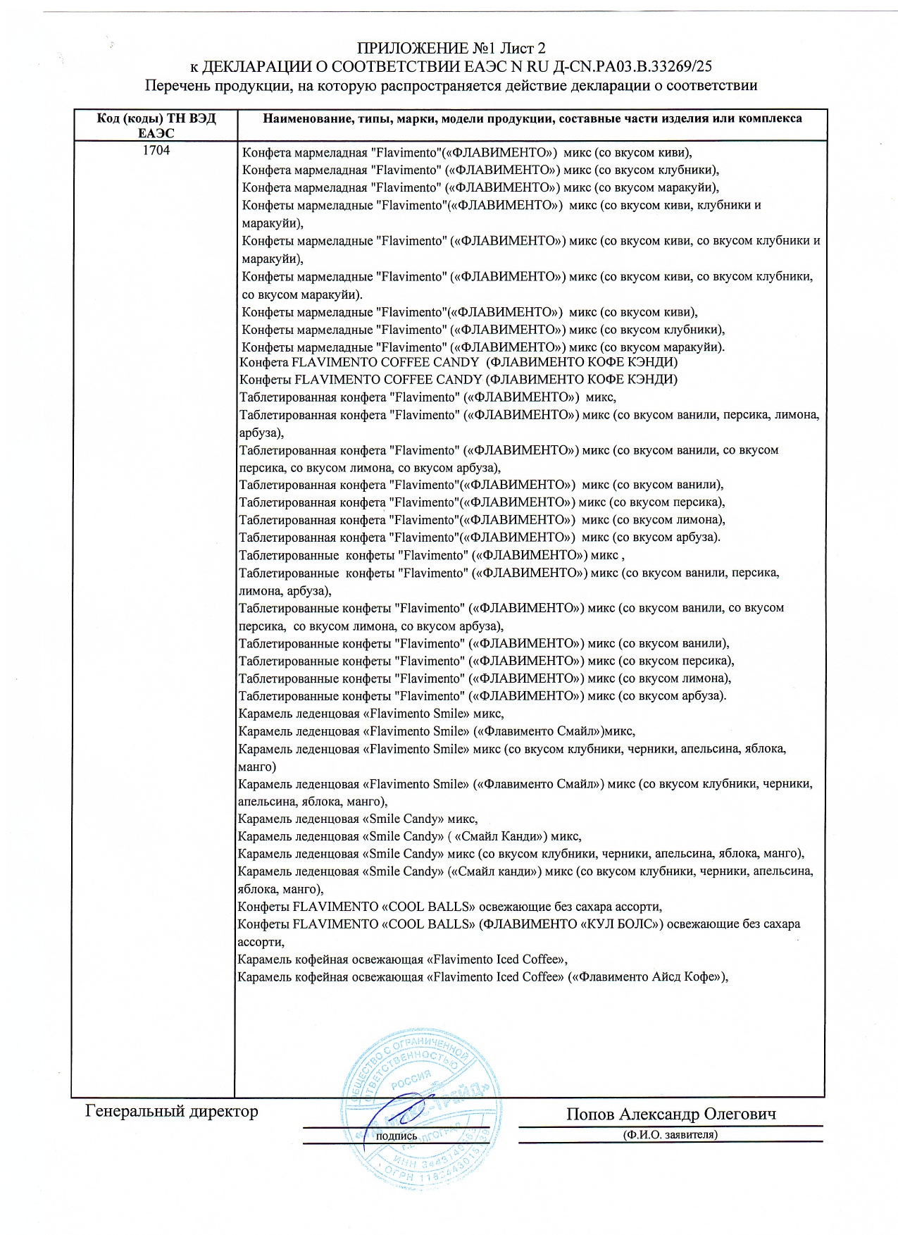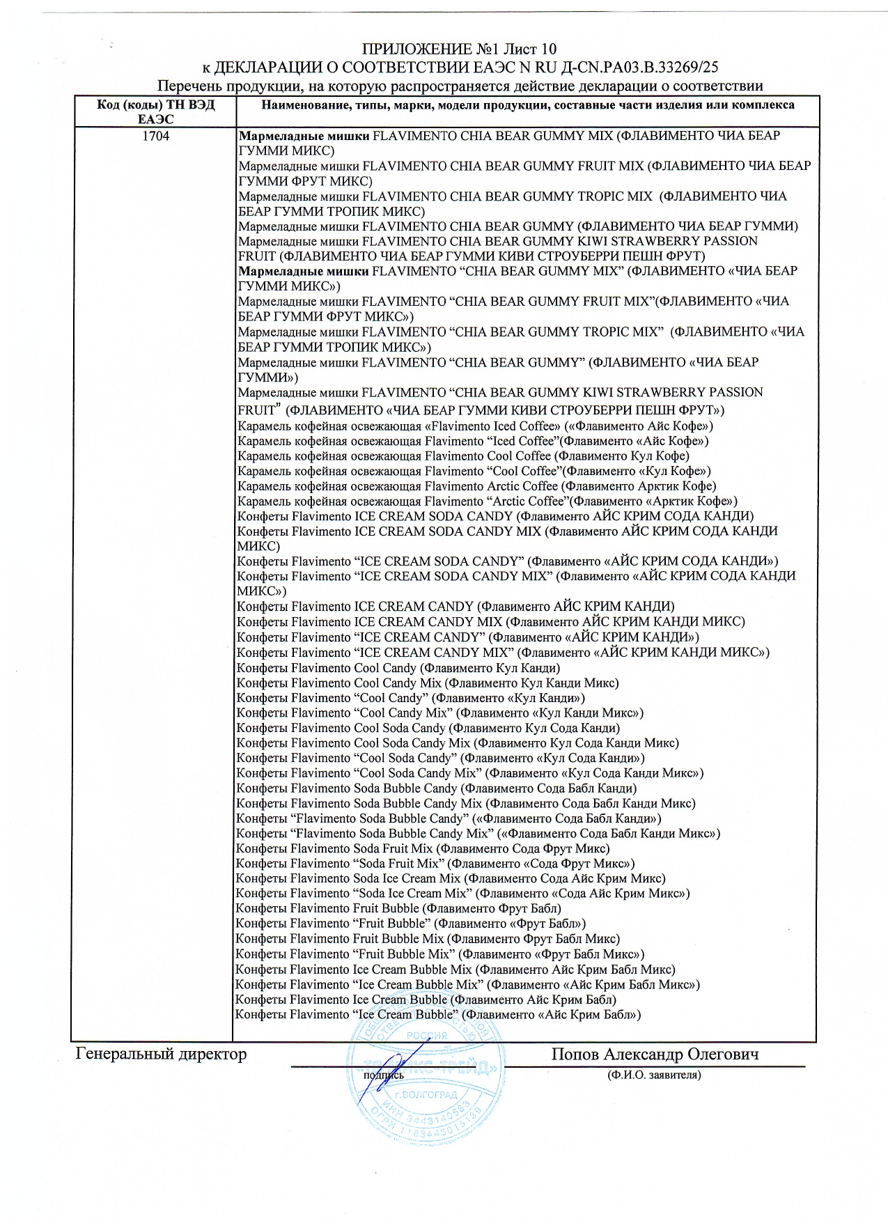 Конфеты мармеладные FLAVIMENTO, ассорти со вкусом киви, клубники и маракуйи, 500 г Код товара: 624273 580,9 ₽ Купить Производитель:FLAVIMENTO Конфеты мармеладные FLAVIMENTO с семенами чиа и содержанием натурального сока. Кубики со вкусом киви, клубники, и маракуйи. Каждая мини-конфетка (кубик) упакована в индивидуальную упаковку, благодаря чему ее удобно брать с собой, положив в карман или в салон автомобиля. Отлично подходит для использования в качестве комплимента на стойке ресепшена. Состав: солодовый сироп; сахар; трегалоза; подсластитель – сорбитовый сироп; загустители – каррагин, пектин; регуляторы кислотности: лимонная кислота, цитрат на трия, DL-яблочная кислота; агент желирующий – агар; антиокислитель – пиросульфит натрия; растительное масло; глазирователь – карнаубский воск; концентрированный сок (киви, клубники, маракуйи); семена Чиа.Производство: КитайВес нетто: 500 гСерия: FLAVIMENTOУпаковка: флоу-пакВкус: киви, клубника и маракуйяСрок годности: 24 мес.Фирма-производитель: Микс ТрейдСрок годности: 24 месВес: 514 грРазмер упаковки: 7.6 × 26.4 × 17.7 смОбъём: 0.0024 м3Промежуточная упаковка: 14 штТранспортная упаковка: 14 штШтрих-код: 6976613321006 Файлы Сертификат-1.jpg Сертификат-2.jpg Сертификат-3.jpg Сертификат-4.jpg Сертификат-5.jpg Сертификат-6.jpg Сертификат-7.jpg Сертификат-8.jpg Сертификат-9.jpg Сертификат-10.jpg Сертификат-11.jpg Сертификат-12.jpg Сертификат-13.jpg Сертификат-14.jpg